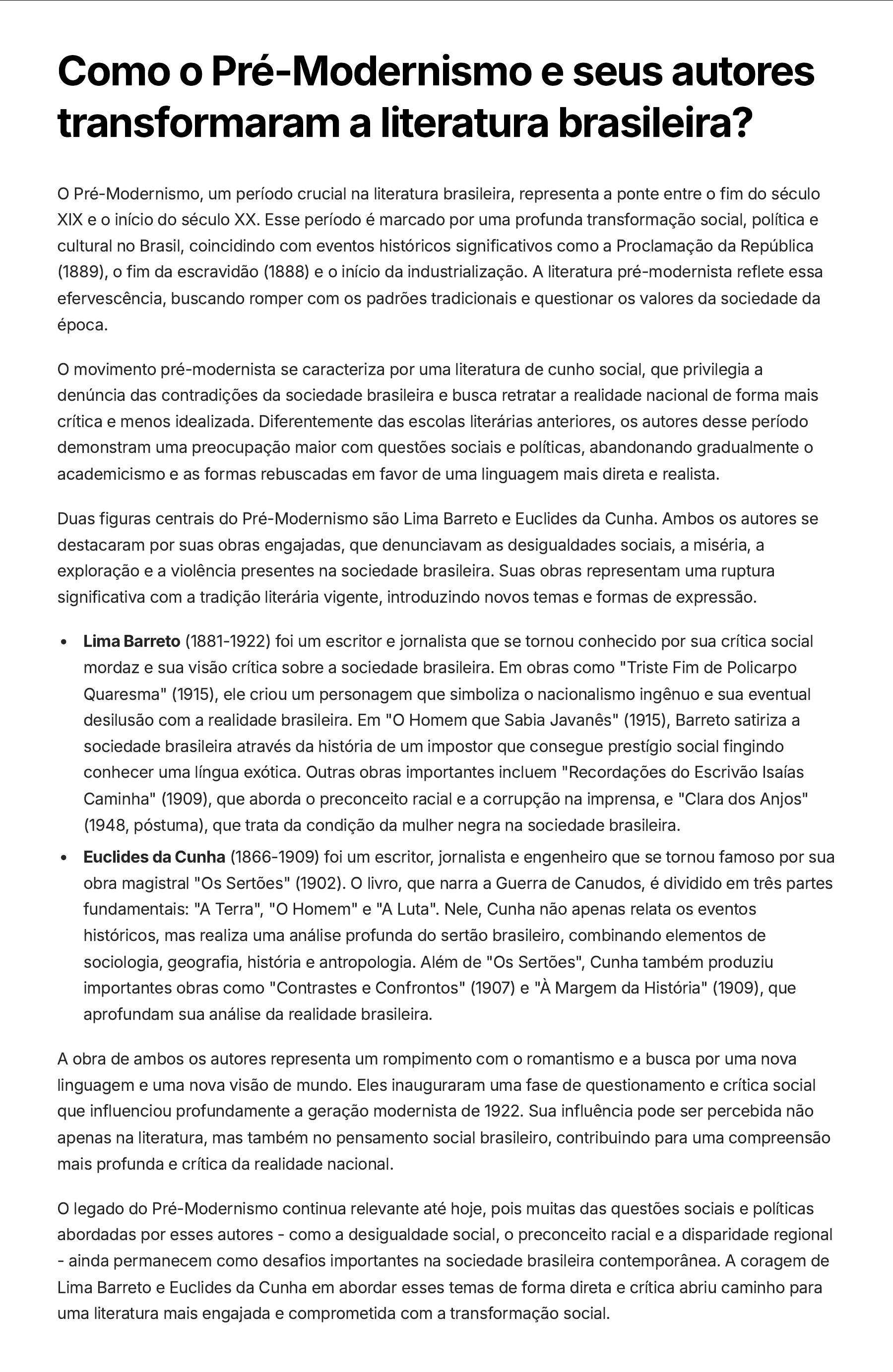 Como o Pré-Modernismo e seus autores transformaram a literatura brasileira? O Pré-Modernismo, um período crucial na literatura brasileira, representa a ponte entre o fim do século XIX e o início do século XX. Esse período é marcado por uma profunda transformação social, política e cultural no Brasil, coincidindo com eventos históricos significativos como a Proclamação da República (1889), o fim da escravidão (1888) e o início da industrialização. A literatura pré-modernista reflete essa efervescência, buscando romper com os padrões tradicionais e questionar os valores da sociedade da época. O movimento pré-modernista se caracteriza por uma literatura de cunho social, que privilegia a denúncia das contradições da sociedade brasileira e busca retratar a realidade nacional de forma mais crítica e menos idealizada. Diferentemente das escolas literárias anteriores, os autores desse período demonstram uma preocupação maior com questões sociais e políticas, abandonando gradualmente o academicismo e as formas rebuscadas em favor de uma linguagem mais direta e realista. Duas figuras centrais do Pré-Modernismo são Lima Barreto e Euclides da Cunha. Ambos os autores se destacaram por suas obras engajadas, que denunciavam as desigualdades sociais, a miséria, a exploração e a violência presentes na sociedade brasileira. Suas obras representam uma ruptura significativa com a tradição literária vigente, introduzindo novos temas e formas de expressão. Lima Barreto (1881-1922) foi um escritor e jornalista que se tornou conhecido por sua crítica social mordaz e sua visão crítica sobre a sociedade brasileira. Em obras como "Triste Fim de Policarpo Quaresma" (1915), ele criou um personagem que simboliza o nacionalismo ingênuo e sua eventual desilusão com a realidade brasileira. Em "O Homem que Sabia Javanês" (1915), Barreto satiriza a sociedade brasileira através da história de um impostor que consegue prestígio social fingindo conhecer uma língua exótica. Outras obras importantes incluem "Recordações do Escrivão Isaías Caminha" (1909), que aborda o preconceito racial e a corrupção na imprensa, e "Clara dos Anjos" (1948, póstuma), que trata da condição da mulher negra na sociedade brasileira. Euclides da Cunha (1866-1909) foi um escritor, jornalista e engenheiro que se tornou famoso por sua obra magistral "Os Sertões" (1902). O livro, que narra a Guerra de Canudos, é dividido em três partes fundamentais: "A Terra", "O Homem" e "A Luta". Nele, Cunha não apenas relata os eventos históricos, mas realiza uma análise profunda do sertão brasileiro, combinando elementos de sociologia, geografia, história e antropologia. Além de "Os Sertões", Cunha também produziu importantes obras como "Contrastes e Confrontos" (1907) e "À Margem da História" (1909), que aprofundam sua análise da realidade brasileira. A obra de ambos os autores representa um rompimento com o romantismo e a busca por uma nova linguagem e uma nova visão de mundo. Eles inauguraram uma fase de questionamento e crítica social que influenciou profundamente a geração modernista de 1922. Sua influência pode ser percebida não apenas na literatura, mas também no pensamento social brasileiro, contribuindo para uma compreensão mais profunda e crítica da realidade nacional. O legado do Pré-Modernismo continua relevante até hoje, pois muitas das questões sociais e políticas abordadas por esses autores - como a desigualdade social, o preconceito racial e a disparidade regional - ainda permanecem como desafios importantes na sociedade brasileira contemporânea. A coragem de Lima Barreto e Euclides da Cunha em abordar esses temas de forma direta e crítica abriu caminho para uma literatura mais engajada e comprometida com a transformação social.