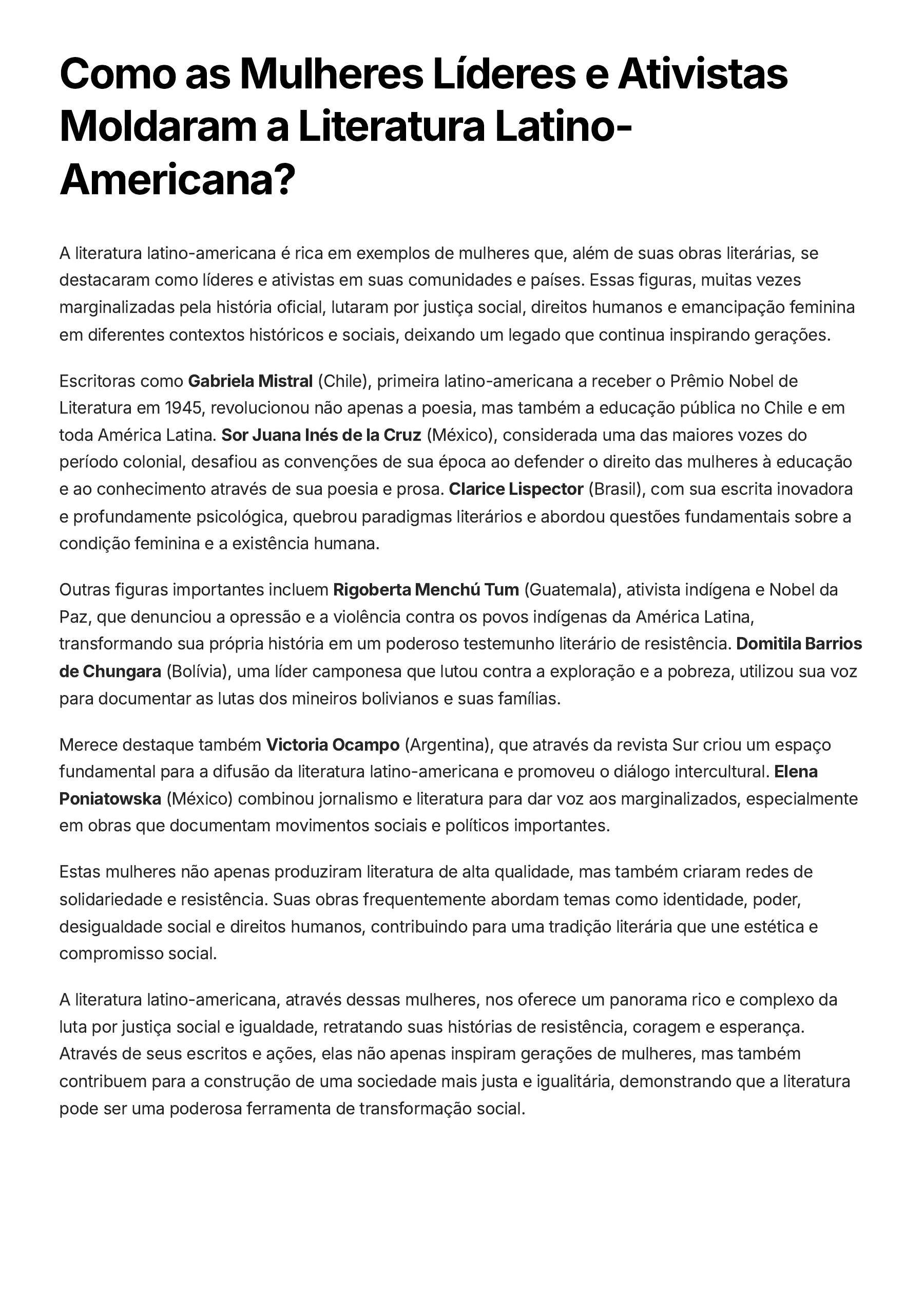 Como as Mulheres Líderes e Ativistas Moldaram a Literatura Latino- Americana? A literatura latino-americana é rica em exemplos de mulheres que, além de suas obras literárias, se destacaram como líderes e ativistas em suas comunidades e países. Essas figuras, muitas vezes marginalizadas pela história oficial, lutaram por justiça social, direitos humanos e emancipação feminina em diferentes contextos históricos e sociais, deixando um legado que continua inspirando gerações. Escritoras como Gabriela Mistral (Chile), primeira latino-americana a receber o Prêmio Nobel de Literatura em 1945, revolucionou não apenas a poesia, mas também a educação pública no Chile e em toda América Latina. Sor Juana Inés de la Cruz (México), considerada uma das maiores vozes do período colonial, desafiou as convenções de sua época ao defender o direito das mulheres à educação e ao conhecimento através de sua poesia e prosa. Clarice Lispector (Brasil), com sua escrita inovadora e profundamente psicológica, quebrou paradigmas literários e abordou questões fundamentais sobre a condição feminina e a existência humana. Outras figuras importantes incluem Rigoberta Menchú Tum (Guatemala), ativista indígena e Nobel da Paz, que denunciou a opressão e a violência contra os povos indígenas da América Latina, transformando sua própria história em um poderoso testemunho literário de resistência. Domitila Barrios de Chungara (Bolívia), uma líder camponesa que lutou contra a exploração e a pobreza, utilizou sua voz para documentar as lutas dos mineiros bolivianos e suas famílias. Merece destaque também Victoria Ocampo (Argentina), que através da revista Sur criou um espaço fundamental para a difusão da literatura latino-americana e promoveu o diálogo intercultural. Elena Poniatowska (México) combinou jornalismo e literatura para dar voz aos marginalizados, especialmente em obras que documentam movimentos sociais e políticos importantes. Estas mulheres não apenas produziram literatura de alta qualidade, mas também criaram redes de solidariedade e resistência. Suas obras frequentemente abordam temas como identidade, poder, desigualdade social e direitos humanos, contribuindo para uma tradição literária que une estética e compromisso social. A literatura latino-americana, através dessas mulheres, nos oferece um panorama rico e complexo da luta por justiça social e igualdade, retratando suas histórias de resistência, coragem e esperança. Através de seus escritos e ações, elas não apenas inspiram gerações de mulheres, mas também contribuem para a construção de uma sociedade mais justa e igualitária, demonstrando que a literatura pode ser uma poderosa ferramenta de transformação social.