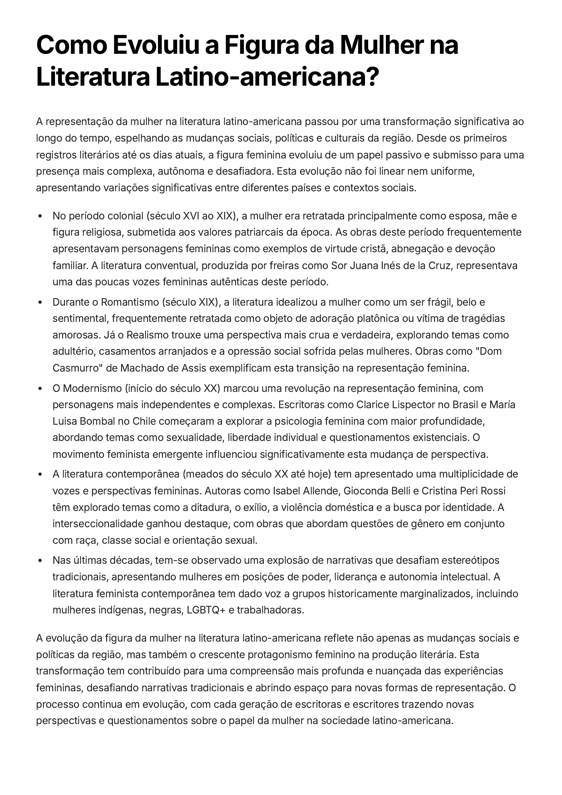 Como Evoluiu a Figura da Mulher na Literatura Latino-americana? A representação da mulher na literatura latino-americana passou por uma transformação significativa ao longo do tempo, espelhando as mudanças sociais, políticas e culturais da região. Desde os primeiros registros literários até os dias atuais, a figura feminina evoluiu de um papel passivo e submisso para uma presença mais complexa, autônoma e desafiadora. Esta evolução não foi linear nem uniforme, apresentando variações significativas entre diferentes países e contextos sociais. No período colonial (século XVI ao XIX), a mulher era retratada principalmente como esposa, mãe e figura religiosa, submetida aos valores patriarcais da época. As obras deste período frequentemente apresentavam personagens femininas como exemplos de virtude cristã, abnegação e devoção familiar. A literatura conventual, produzida por freiras como Sor Juana Inés de la Cruz, representava uma das poucas vozes femininas autênticas deste período. Durante o Romantismo (século XIX), a literatura idealizou a mulher como um ser frágil, belo e sentimental, frequentemente retratada como objeto de adoração platônica ou vítima de tragédias amorosas. Já o Realismo trouxe uma perspectiva mais crua e verdadeira, explorando temas como adultério, casamentos arranjados e a opressão social sofrida pelas mulheres. Obras como "Dom Casmurro" de Machado de Assis exemplificam esta transição na representação feminina. O Modernismo (início do século XX) marcou uma revolução na representação feminina, com personagens mais independentes e complexas. Escritoras como Clarice Lispector no Brasil e María Luisa Bombal no Chile começaram a explorar a psicologia feminina com maior profundidade, abordando temas como sexualidade, liberdade individual e questionamentos existenciais. O movimento feminista emergente influenciou significativamente esta mudança de perspectiva. A literatura contemporânea (meados do século XX até hoje) tem apresentado uma multiplicidade de vozes e perspectivas femininas. Autoras como Isabel Allende, Gioconda Belli e Cristina Peri Rossi têm explorado temas como a ditadura, o exílio, a violência doméstica e a busca por identidade. A interseccionalidade ganhou destaque, com obras que abordam questões de gênero em conjunto com raça, classe social e orientação sexual. Nas últimas décadas, tem-se observado uma explosão de narrativas que desafiam estereótipos tradicionais, apresentando mulheres em posições de poder, liderança e autonomia intelectual. A literatura feminista contemporânea tem dado voz a grupos historicamente marginalizados, incluindo mulheres indígenas, negras, LGBTQ+ e trabalhadoras. A evolução da figura da mulher na literatura latino-americana reflete não apenas as mudanças sociais e políticas da região, mas também o crescente protagonismo feminino na produção literária. Esta transformação tem contribuído para uma compreensão mais profunda e nuançada das experiências femininas, desafiando narrativas tradicionais e abrindo espaço para novas formas de representação. O processo continua em evolução, com cada geração de escritoras e escritores trazendo novas perspectivas e questionamentos sobre o papel da mulher na sociedade latino-americana.