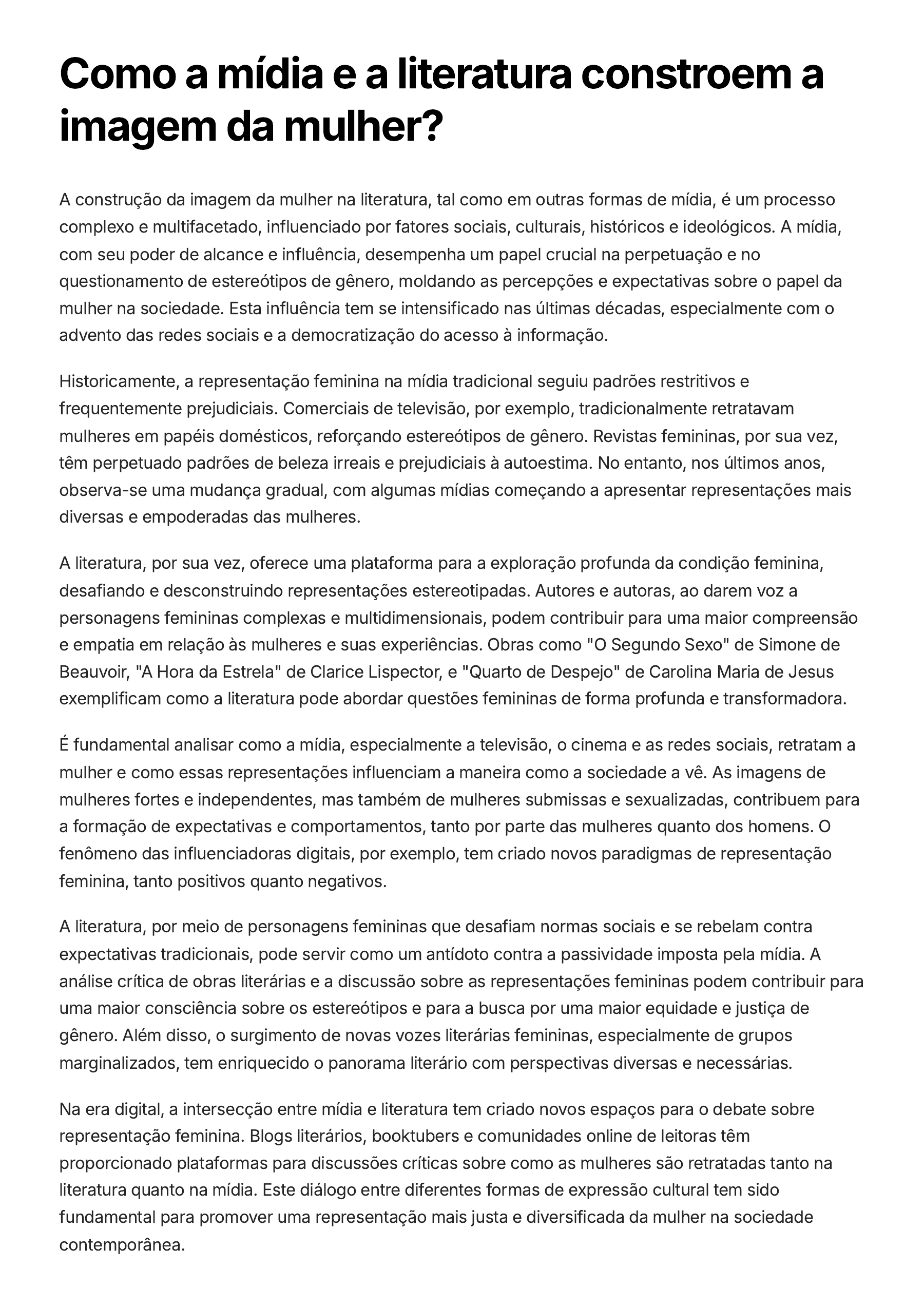 Como a mídia e a literatura constroem a imagem da mulher? A construção da imagem da mulher na literatura, tal como em outras formas de mídia, é um processo complexo e multifacetado, influenciado por fatores sociais, culturais, históricos e ideológicos. A mídia, com seu poder de alcance e influência, desempenha um papel crucial na perpetuação e no questionamento de estereótipos de gênero, moldando as percepções e expectativas sobre o papel da mulher na sociedade. Esta influência tem se intensificado nas últimas décadas, especialmente com o advento das redes sociais e a democratização do acesso à informação. Historicamente, a representação feminina na mídia tradicional seguiu padrões restritivos e frequentemente prejudiciais. Comerciais de televisão, por exemplo, tradicionalmente retratavam mulheres em papéis domésticos, reforçando estereótipos de gênero. Revistas femininas, por sua vez, têm perpetuado padrões de beleza irreais e prejudiciais à autoestima. No entanto, nos últimos anos, observa-se uma mudança gradual, com algumas mídias começando a apresentar representações mais diversas e empoderadas das mulheres. A literatura, por sua vez, oferece uma plataforma para a exploração profunda da condição feminina, desafiando e desconstruindo representações estereotipadas. Autores e autoras, ao darem voz a personagens femininas complexas e multidimensionais, podem contribuir para uma maior compreensão e empatia em relação às mulheres e suas experiências. Obras como "O Segundo Sexo" de Simone de Beauvoir, "A Hora da Estrela" de Clarice Lispector, e "Quarto de Despejo" de Carolina Maria de Jesus exemplificam como a literatura pode abordar questões femininas de forma profunda e transformadora. É fundamental analisar como a mídia, especialmente a televisão, o cinema e as redes sociais, retratam a mulher e como essas representações influenciam a maneira como a sociedade a vê. As imagens de mulheres fortes e independentes, mas também de mulheres submissas e sexualizadas, contribuem para a formação de expectativas e comportamentos, tanto por parte das mulheres quanto dos homens. O fenômeno das influenciadoras digitais, por exemplo, tem criado novos paradigmas de representação feminina, tanto positivos quanto negativos. A literatura, por meio de personagens femininas que desafiam normas sociais e se rebelam contra expectativas tradicionais, pode servir como um antídoto contra a passividade imposta pela mídia. A análise crítica de obras literárias e a discussão sobre as representações femininas podem contribuir para uma maior consciência sobre os estereótipos e para a busca por uma maior equidade e justiça de gênero. Além disso, o surgimento de novas vozes literárias femininas, especialmente de grupos marginalizados, tem enriquecido o panorama literário com perspectivas diversas e necessárias. Na era digital, a intersecção entre mídia e literatura tem criado novos espaços para o debate sobre representação feminina. Blogs literários, booktubers e comunidades online de leitoras têm proporcionado plataformas para discussões críticas sobre como as mulheres são retratadas tanto na literatura quanto na mídia. Este diálogo entre diferentes formas de expressão cultural tem sido fundamental para promover uma representação mais justa e diversificada da mulher na sociedade contemporânea.