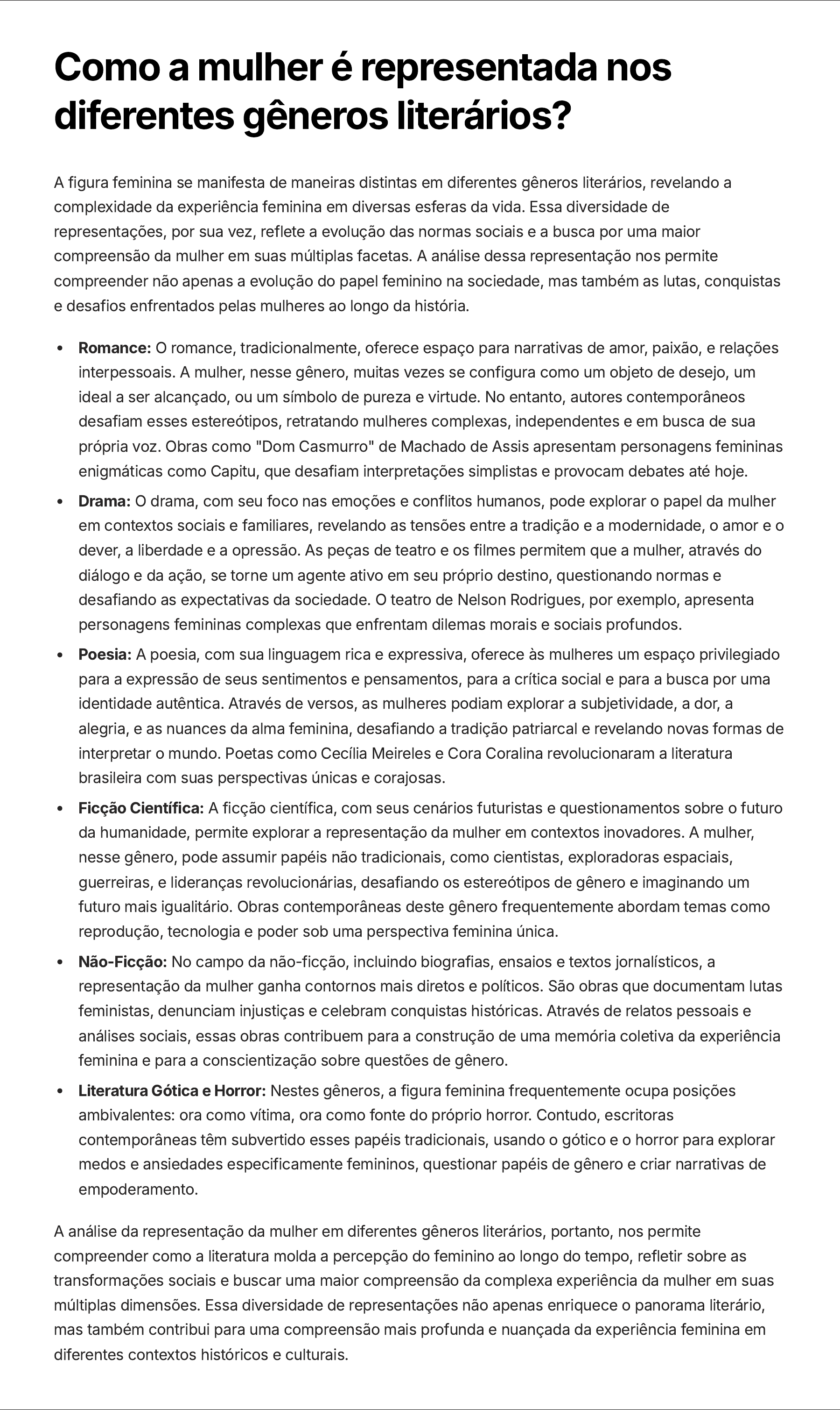 Como a mulher é representada nos diferentes gêneros literários? A figura feminina se manifesta de maneiras distintas em diferentes gêneros literários, revelando a complexidade da experiência feminina em diversas esferas da vida. Essa diversidade de representações, por sua vez, reflete a evolução das normas sociais e a busca por uma maior compreensão da mulher em suas múltiplas facetas. A análise dessa representação nos permite compreender não apenas a evolução do papel feminino na sociedade, mas também as lutas, conquistas e desafios enfrentados pelas mulheres ao longo da história. Romance: O romance, tradicionalmente, oferece espaço para narrativas de amor, paixão, e relações interpessoais. A mulher, nesse gênero, muitas vezes se configura como um objeto de desejo, um ideal a ser alcançado, ou um símbolo de pureza e virtude. No entanto, autores contemporâneos desafiam esses estereótipos, retratando mulheres complexas, independentes e em busca de sua própria voz. Obras como "Dom Casmurro" de Machado de Assis apresentam personagens femininas enigmáticas como Capitu, que desafiam interpretações simplistas e provocam debates até hoje. Drama: O drama, com seu foco nas emoções e conflitos humanos, pode explorar o papel da mulher em contextos sociais e familiares, revelando as tensões entre a tradição e a modernidade, o amor e o dever, a liberdade e a opressão. As peças de teatro e os filmes permitem que a mulher, através do diálogo e da ação, se torne um agente ativo em seu próprio destino, questionando normas e desafiando as expectativas da sociedade. O teatro de Nelson Rodrigues, por exemplo, apresenta personagens femininas complexas que enfrentam dilemas morais e sociais profundos. Poesia: A poesia, com sua linguagem rica e expressiva, oferece às mulheres um espaço privilegiado para a expressão de seus sentimentos e pensamentos, para a crítica social e para a busca por uma identidade autêntica. Através de versos, as mulheres podiam explorar a subjetividade, a dor, a alegria, e as nuances da alma feminina, desafiando a tradição patriarcal e revelando novas formas de interpretar o mundo. Poetas como Cecília Meireles e Cora Coralina revolucionaram a literatura brasileira com suas perspectivas únicas e corajosas. Ficção Científica: A ficção científica, com seus cenários futuristas e questionamentos sobre o futuro da humanidade, permite explorar a representação da mulher em contextos inovadores. A mulher, nesse gênero, pode assumir papéis não tradicionais, como cientistas, exploradoras espaciais, guerreiras, e lideranças revolucionárias, desafiando os estereótipos de gênero e imaginando um futuro mais igualitário. Obras contemporâneas deste gênero frequentemente abordam temas como reprodução, tecnologia e poder sob uma perspectiva feminina única. Não-Ficção: No campo da não-ficção, incluindo biografias, ensaios e textos jornalísticos, a representação da mulher ganha contornos mais diretos e políticos. São obras que documentam lutas feministas, denunciam injustiças e celebram conquistas históricas. Através de relatos pessoais e análises sociais, essas obras contribuem para a construção de uma memória coletiva da experiência feminina e para a conscientização sobre questões de gênero. Literatura Gótica e Horror: Nestes gêneros, a figura feminina frequentemente ocupa posições ambivalentes: ora como vítima, ora como fonte do próprio horror. Contudo, escritoras contemporâneas têm subvertido esses papéis tradicionais, usando o gótico e o horror para explorar medos e ansiedades especificamente femininos, questionar papéis de gênero e criar narrativas de empoderamento. A análise da representação da mulher em diferentes gêneros literários, portanto, nos permite compreender como a literatura molda a percepção do feminino ao longo do tempo, refletir sobre as transformações sociais e buscar uma maior compreensão da complexa experiência da mulher em suas múltiplas dimensões. Essa diversidade de representações não apenas enriquece o panorama literário, mas também contribui para uma compreensão mais profunda e nuançada da experiência feminina em diferentes contextos históricos e culturais.