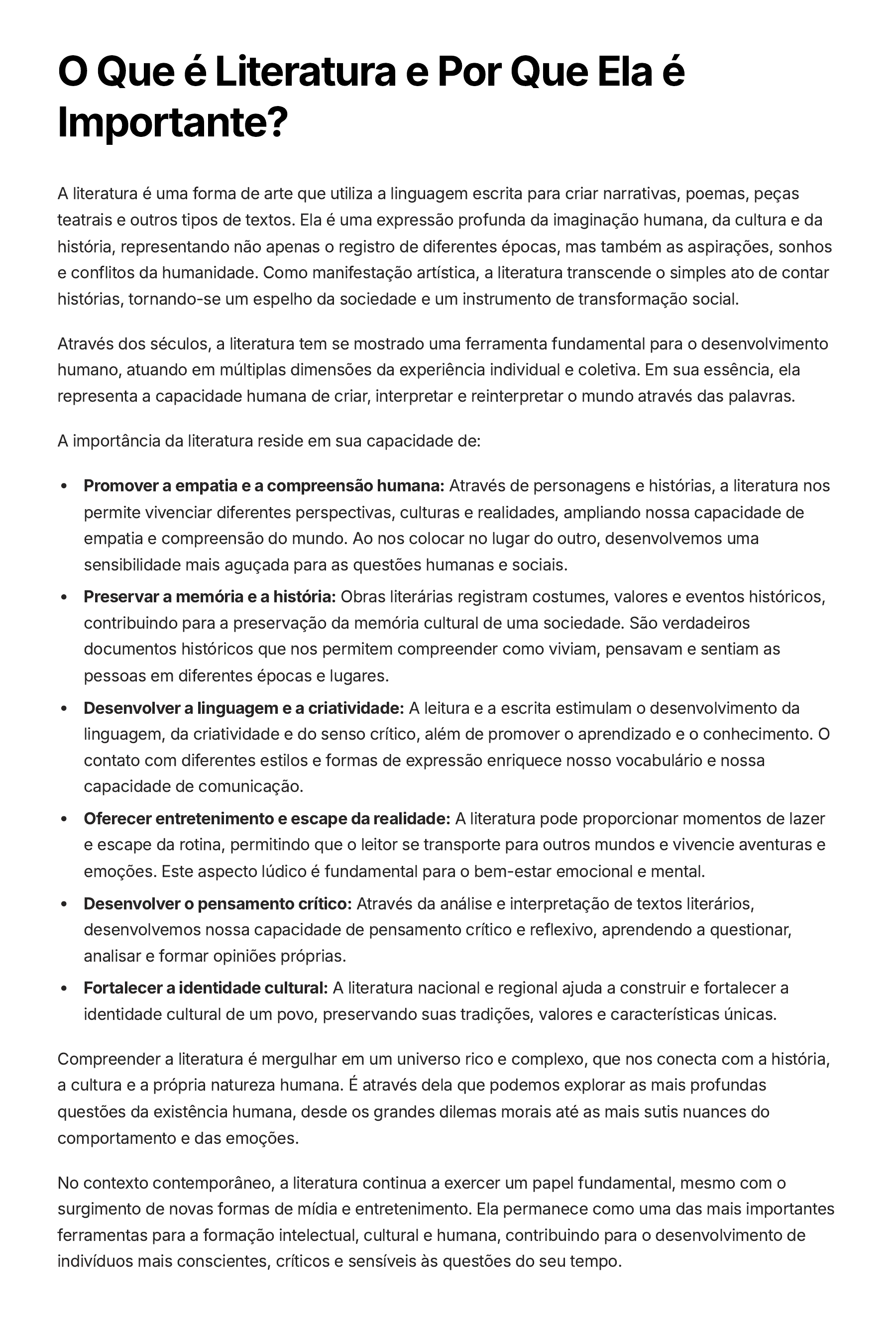O Que é Literatura e Por Que Ela é Importante? A literatura é uma forma de arte que utiliza a linguagem escrita para criar narrativas, poemas, peças teatrais e outros tipos de textos. Ela é uma expressão profunda da imaginação humana, da cultura e da história, representando não apenas o registro de diferentes épocas, mas também as aspirações, sonhos e conflitos da humanidade. Como manifestação artística, a literatura transcende o simples ato de contar histórias, tornando-se um espelho da sociedade e um instrumento de transformação social. Através dos séculos, a literatura tem se mostrado uma ferramenta fundamental para o desenvolvimento humano, atuando em múltiplas dimensões da experiência individual e coletiva. Em sua essência, ela representa a capacidade humana de criar, interpretar e reinterpretar o mundo através das palavras. A importância da literatura reside em sua capacidade de: Promover a empatia e a compreensão humana: Através de personagens e histórias, a literatura nos permite vivenciar diferentes perspectivas, culturas e realidades, ampliando nossa capacidade de empatia e compreensão do mundo. Ao nos colocar no lugar do outro, desenvolvemos uma sensibilidade mais aguçada para as questões humanas e sociais. Preservar a memória e a história: Obras literárias registram costumes, valores e eventos históricos, contribuindo para a preservação da memória cultural de uma sociedade. São verdadeiros documentos históricos que nos permitem compreender como viviam, pensavam e sentiam as pessoas em diferentes épocas e lugares. Desenvolver a linguagem e a criatividade: A leitura e a escrita estimulam o desenvolvimento da linguagem, da criatividade e do senso crítico, além de promover o aprendizado e o conhecimento. O contato com diferentes estilos e formas de expressão enriquece nosso vocabulário e nossa capacidade de comunicação. Oferecer entretenimento e escape da realidade: A literatura pode proporcionar momentos de lazer e escape da rotina, permitindo que o leitor se transporte para outros mundos e vivencie aventuras e emoções. Este aspecto lúdico é fundamental para o bem-estar emocional e mental. Desenvolver o pensamento crítico: Através da análise e interpretação de textos literários, desenvolvemos nossa capacidade de pensamento crítico e reflexivo, aprendendo a questionar, analisar e formar opiniões próprias. Fortalecer a identidade cultural: A literatura nacional e regional ajuda a construir e fortalecer a identidade cultural de um povo, preservando suas tradições, valores e características únicas. Compreender a literatura é mergulhar em um universo rico e complexo, que nos conecta com a história, a cultura e a própria natureza humana. É através dela que podemos explorar as mais profundas questões da existência humana, desde os grandes dilemas morais até as mais sutis nuances do comportamento e das emoções. No contexto contemporâneo, a literatura continua a exercer um papel fundamental, mesmo com o surgimento de novas formas de mídia e entretenimento. Ela permanece como uma das mais importantes ferramentas para a formação intelectual, cultural e humana, contribuindo para o desenvolvimento de indivíduos mais conscientes, críticos e sensíveis às questões do seu tempo.