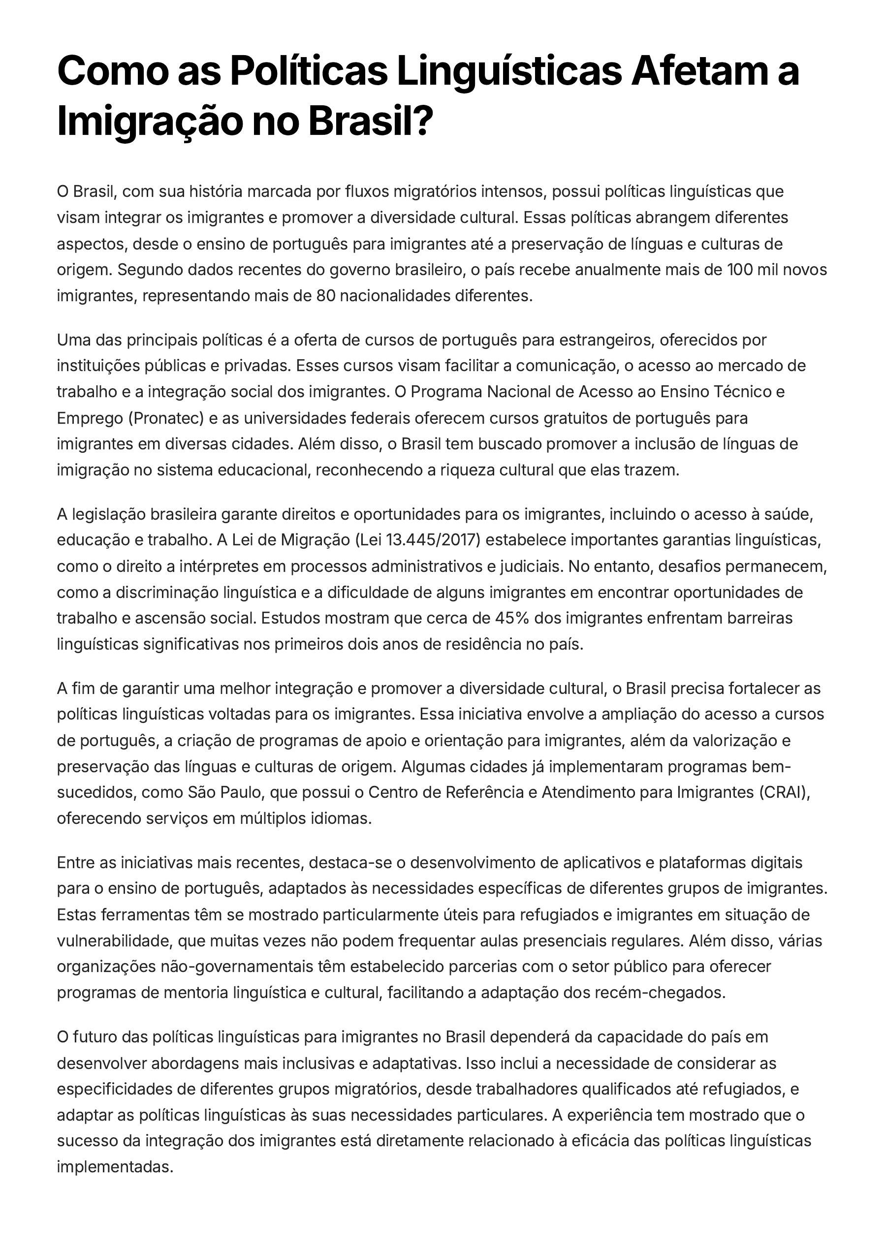 Como as Políticas Linguísticas Afetam a Imigração no Brasil? O Brasil, com sua história marcada por fluxos migratórios intensos, possui políticas linguísticas que visam integrar os imigrantes e promover a diversidade cultural. Essas políticas abrangem diferentes aspectos, desde o ensino de português para imigrantes até a preservação de línguas e culturas de origem. Segundo dados recentes do governo brasileiro, o país recebe anualmente mais de 100 mil novos imigrantes, representando mais de 80 nacionalidades diferentes. Uma das principais políticas é a oferta de cursos de português para estrangeiros, oferecidos por instituições públicas e privadas. Esses cursos visam facilitar a comunicação, o acesso ao mercado de trabalho e a integração social dos imigrantes. O Programa Nacional de Acesso ao Ensino Técnico e Emprego (Pronatec) e as universidades federais oferecem cursos gratuitos de português para imigrantes em diversas cidades. Além disso, o Brasil tem buscado promover a inclusão de línguas de imigração no sistema educacional, reconhecendo a riqueza cultural que elas trazem. A legislação brasileira garante direitos e oportunidades para os imigrantes, incluindo o acesso à saúde, educação e trabalho. A Lei de Migração (Lei 13.445/2017) estabelece importantes garantias linguísticas, como o direito a intérpretes em processos administrativos e judiciais. No entanto, desafios permanecem, como a discriminação linguística e a dificuldade de alguns imigrantes em encontrar oportunidades de trabalho e ascensão social. Estudos mostram que cerca de 45% dos imigrantes enfrentam barreiras linguísticas significativas nos primeiros dois anos de residência no país. A fim de garantir uma melhor integração e promover a diversidade cultural, o Brasil precisa fortalecer as políticas linguísticas voltadas para os imigrantes. Essa iniciativa envolve a ampliação do acesso a cursos de português, a criação de programas de apoio e orientação para imigrantes, além da valorização e preservação das línguas e culturas de origem. Algumas cidades já implementaram programas bem- sucedidos, como São Paulo, que possui o Centro de Referência e Atendimento para Imigrantes (CRAI), oferecendo serviços em múltiplos idiomas. Entre as iniciativas mais recentes, destaca-se o desenvolvimento de aplicativos e plataformas digitais para o ensino de português, adaptados às necessidades específicas de diferentes grupos de imigrantes. Estas ferramentas têm se mostrado particularmente úteis para refugiados e imigrantes em situação de vulnerabilidade, que muitas vezes não podem frequentar aulas presenciais regulares. Além disso, várias organizações não-governamentais têm estabelecido parcerias com o setor público para oferecer programas de mentoria linguística e cultural, facilitando a adaptação dos recém-chegados. O futuro das políticas linguísticas para imigrantes no Brasil dependerá da capacidade do país em desenvolver abordagens mais inclusivas e adaptativas. Isso inclui a necessidade de considerar as especificidades de diferentes grupos migratórios, desde trabalhadores qualificados até refugiados, e adaptar as políticas linguísticas às suas necessidades particulares. A experiência tem mostrado que o sucesso da integração dos imigrantes está diretamente relacionado à eficácia das políticas linguísticas implementadas.
