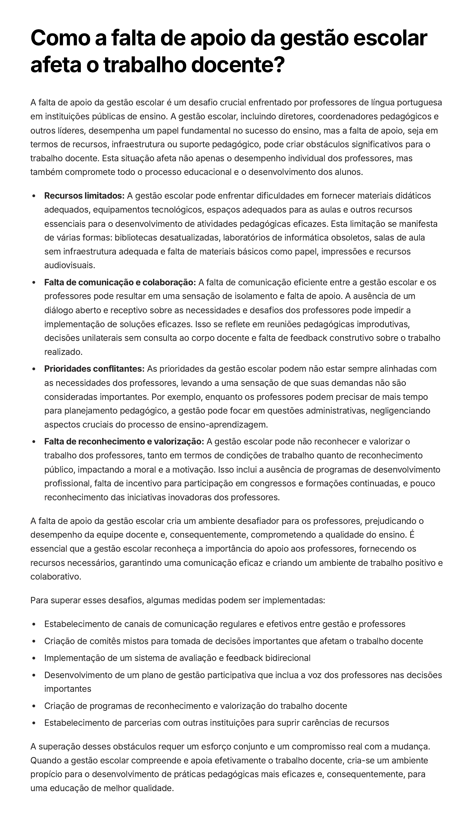 Como a falta de apoio da gestão escolar afeta o trabalho docente? A falta de apoio da gestão escolar é um desafio crucial enfrentado por professores de língua portuguesa em instituições públicas de ensino. A gestão escolar, incluindo diretores, coordenadores pedagógicos e outros líderes, desempenha um papel fundamental no sucesso do ensino, mas a falta de apoio, seja em termos de recursos, infraestrutura ou suporte pedagógico, pode criar obstáculos significativos para o trabalho docente. Esta situação afeta não apenas o desempenho individual dos professores, mas também compromete todo o processo educacional e o desenvolvimento dos alunos. Recursos limitados: A gestão escolar pode enfrentar dificuldades em fornecer materiais didáticos adequados, equipamentos tecnológicos, espaços adequados para as aulas e outros recursos essenciais para o desenvolvimento de atividades pedagógicas eficazes. Esta limitação se manifesta de várias formas: bibliotecas desatualizadas, laboratórios de informática obsoletos, salas de aula sem infraestrutura adequada e falta de materiais básicos como papel, impressões e recursos audiovisuais. Falta de comunicação e colaboração: A falta de comunicação eficiente entre a gestão escolar e os professores pode resultar em uma sensação de isolamento e falta de apoio. A ausência de um diálogo aberto e receptivo sobre as necessidades e desafios dos professores pode impedir a implementação de soluções eficazes. Isso se reflete em reuniões pedagógicas improdutivas, decisões unilaterais sem consulta ao corpo docente e falta de feedback construtivo sobre o trabalho realizado. Prioridades conflitantes: As prioridades da gestão escolar podem não estar sempre alinhadas com as necessidades dos professores, levando a uma sensação de que suas demandas não são consideradas importantes. Por exemplo, enquanto os professores podem precisar de mais tempo para planejamento pedagógico, a gestão pode focar em questões administrativas, negligenciando aspectos cruciais do processo de ensino-aprendizagem. Falta de reconhecimento e valorização: A gestão escolar pode não reconhecer e valorizar o trabalho dos professores, tanto em termos de condições de trabalho quanto de reconhecimento público, impactando a moral e a motivação. Isso inclui a ausência de programas de desenvolvimento profissional, falta de incentivo para participação em congressos e formações continuadas, e pouco reconhecimento das iniciativas inovadoras dos professores. A falta de apoio da gestão escolar cria um ambiente desafiador para os professores, prejudicando o desempenho da equipe docente e, consequentemente, comprometendo a qualidade do ensino. É essencial que a gestão escolar reconheça a importância do apoio aos professores, fornecendo os recursos necessários, garantindo uma comunicação eficaz e criando um ambiente de trabalho positivo e colaborativo. Para superar esses desafios, algumas medidas podem ser implementadas: Estabelecimento de canais de comunicação regulares e efetivos entre gestão e professores Criação de comitês mistos para tomada de decisões importantes que afetam o trabalho docente Implementação de um sistema de avaliação e feedback bidirecional Desenvolvimento de um plano de gestão participativa que inclua a voz dos professores nas decisões importantes Criação de programas de reconhecimento e valorização do trabalho docente Estabelecimento de parcerias com outras instituições para suprir carências de recursos A superação desses obstáculos requer um esforço conjunto e um compromisso real com a mudança. Quando a gestão escolar compreende e apoia efetivamente o trabalho docente, cria-se um ambiente propício para o desenvolvimento de práticas pedagógicas mais eficazes e, consequentemente, para uma educação de melhor qualidade.
