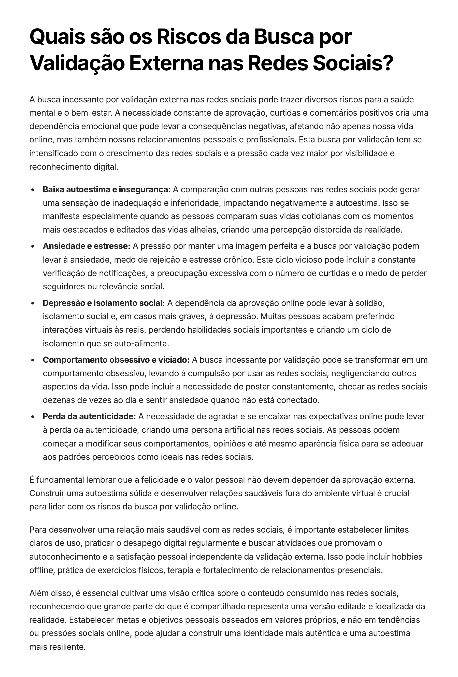 Quais são os Riscos da Busca por Validação Externa nas Redes Sociais? A busca incessante por validação externa nas redes sociais pode trazer diversos riscos para a saúde mental e o bem-estar. A necessidade constante de aprovação, curtidas e comentários positivos cria uma dependência emocional que pode levar a consequências negativas, afetando não apenas nossa vida online, mas também nossos relacionamentos pessoais e profissionais. Esta busca por validação tem se intensificado com o crescimento das redes sociais e a pressão cada vez maior por visibilidade e reconhecimento digital. Baixa autoestima e insegurança: A comparação com outras pessoas nas redes sociais pode gerar uma sensação de inadequação e inferioridade, impactando negativamente a autoestima. Isso se manifesta especialmente quando as pessoas comparam suas vidas cotidianas com os momentos mais destacados e editados das vidas alheias, criando uma percepção distorcida da realidade. Ansiedade e estresse: A pressão por manter uma imagem perfeita e a busca por validação podem levar à ansiedade, medo de rejeição e estresse crônico. Este ciclo vicioso pode incluir a constante verificação de notificações, a preocupação excessiva com o número de curtidas e o medo de perder seguidores ou relevância social. Depressão e isolamento social: A dependência da aprovação online pode levar à solidão, isolamento social e, em casos mais graves, à depressão. Muitas pessoas acabam preferindo interações virtuais às reais, perdendo habilidades sociais importantes e criando um ciclo de isolamento que se auto-alimenta. Comportamento obsessivo e viciado: A busca incessante por validação pode se transformar em um comportamento obsessivo, levando à compulsão por usar as redes sociais, negligenciando outros aspectos da vida. Isso pode incluir a necessidade de postar constantemente, checar as redes sociais dezenas de vezes ao dia e sentir ansiedade quando não está conectado. Perda da autenticidade: A necessidade de agradar e se encaixar nas expectativas online pode levar à perda da autenticidade, criando uma persona artificial nas redes sociais. As pessoas podem começar a modificar seus comportamentos, opiniões e até mesmo aparência física para se adequar aos padrões percebidos como ideais nas redes sociais. É fundamental lembrar que a felicidade e o valor pessoal não devem depender da aprovação externa. Construir uma autoestima sólida e desenvolver relações saudáveis fora do ambiente virtual é crucial para lidar com os riscos da busca por validação online. Para desenvolver uma relação mais saudável com as redes sociais, é importante estabelecer limites claros de uso, praticar o desapego digital regularmente e buscar atividades que promovam o autoconhecimento e a satisfação pessoal independente da validação externa. Isso pode incluir hobbies offline, prática de exercícios físicos, terapia e fortalecimento de relacionamentos presenciais. Além disso, é essencial cultivar uma visão crítica sobre o conteúdo consumido nas redes sociais, reconhecendo que grande parte do que é compartilhado representa uma versão editada e idealizada da realidade. Estabelecer metas e objetivos pessoais baseados em valores próprios, e não em tendências ou pressões sociais online, pode ajudar a construir uma identidade mais autêntica e uma autoestima mais resiliente.