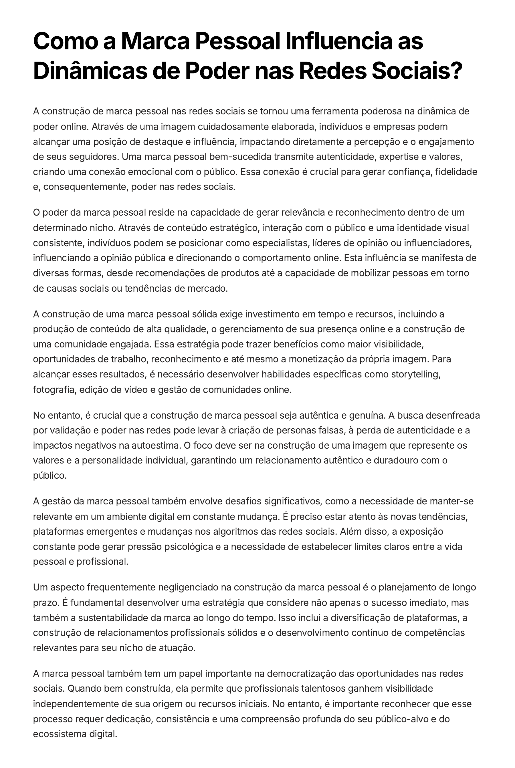 Como a Marca Pessoal Influencia as Dinâmicas de Poder nas Redes Sociais? A construção de marca pessoal nas redes sociais se tornou uma ferramenta poderosa na dinâmica de poder online. Através de uma imagem cuidadosamente elaborada, indivíduos e empresas podem alcançar uma posição de destaque e influência, impactando diretamente a percepção e o engajamento de seus seguidores. Uma marca pessoal bem-sucedida transmite autenticidade, expertise e valores, criando uma conexão emocional com o público. Essa conexão é crucial para gerar confiança, fidelidade e, consequentemente, poder nas redes sociais. O poder da marca pessoal reside na capacidade de gerar relevância e reconhecimento dentro de um determinado nicho. Através de conteúdo estratégico, interação com o público e uma identidade visual consistente, indivíduos podem se posicionar como especialistas, líderes de opinião ou influenciadores, influenciando a opinião pública e direcionando o comportamento online. Esta influência se manifesta de diversas formas, desde recomendações de produtos até a capacidade de mobilizar pessoas em torno de causas sociais ou tendências de mercado. A construção de uma marca pessoal sólida exige investimento em tempo e recursos, incluindo a produção de conteúdo de alta qualidade, o gerenciamento de sua presença online e a construção de uma comunidade engajada. Essa estratégia pode trazer benefícios como maior visibilidade, oportunidades de trabalho, reconhecimento e até mesmo a monetização da própria imagem. Para alcançar esses resultados, é necessário desenvolver habilidades específicas como storytelling, fotografia, edição de vídeo e gestão de comunidades online. No entanto, é crucial que a construção de marca pessoal seja autêntica e genuína. A busca desenfreada por validação e poder nas redes pode levar à criação de personas falsas, à perda de autenticidade e a impactos negativos na autoestima. O foco deve ser na construção de uma imagem que represente os valores e a personalidade individual, garantindo um relacionamento autêntico e duradouro com o público. A gestão da marca pessoal também envolve desafios significativos, como a necessidade de manter-se relevante em um ambiente digital em constante mudança. É preciso estar atento às novas tendências, plataformas emergentes e mudanças nos algoritmos das redes sociais. Além disso, a exposição constante pode gerar pressão psicológica e a necessidade de estabelecer limites claros entre a vida pessoal e profissional. Um aspecto frequentemente negligenciado na construção da marca pessoal é o planejamento de longo prazo. É fundamental desenvolver uma estratégia que considere não apenas o sucesso imediato, mas também a sustentabilidade da marca ao longo do tempo. Isso inclui a diversificação de plataformas, a construção de relacionamentos profissionais sólidos e o desenvolvimento contínuo de competências relevantes para seu nicho de atuação. A marca pessoal também tem um papel importante na democratização das oportunidades nas redes sociais. Quando bem construída, ela permite que profissionais talentosos ganhem visibilidade independentemente de sua origem ou recursos iniciais. No entanto, é importante reconhecer que esse processo requer dedicação, consistência e uma compreensão profunda do seu público-alvo e do ecossistema digital.