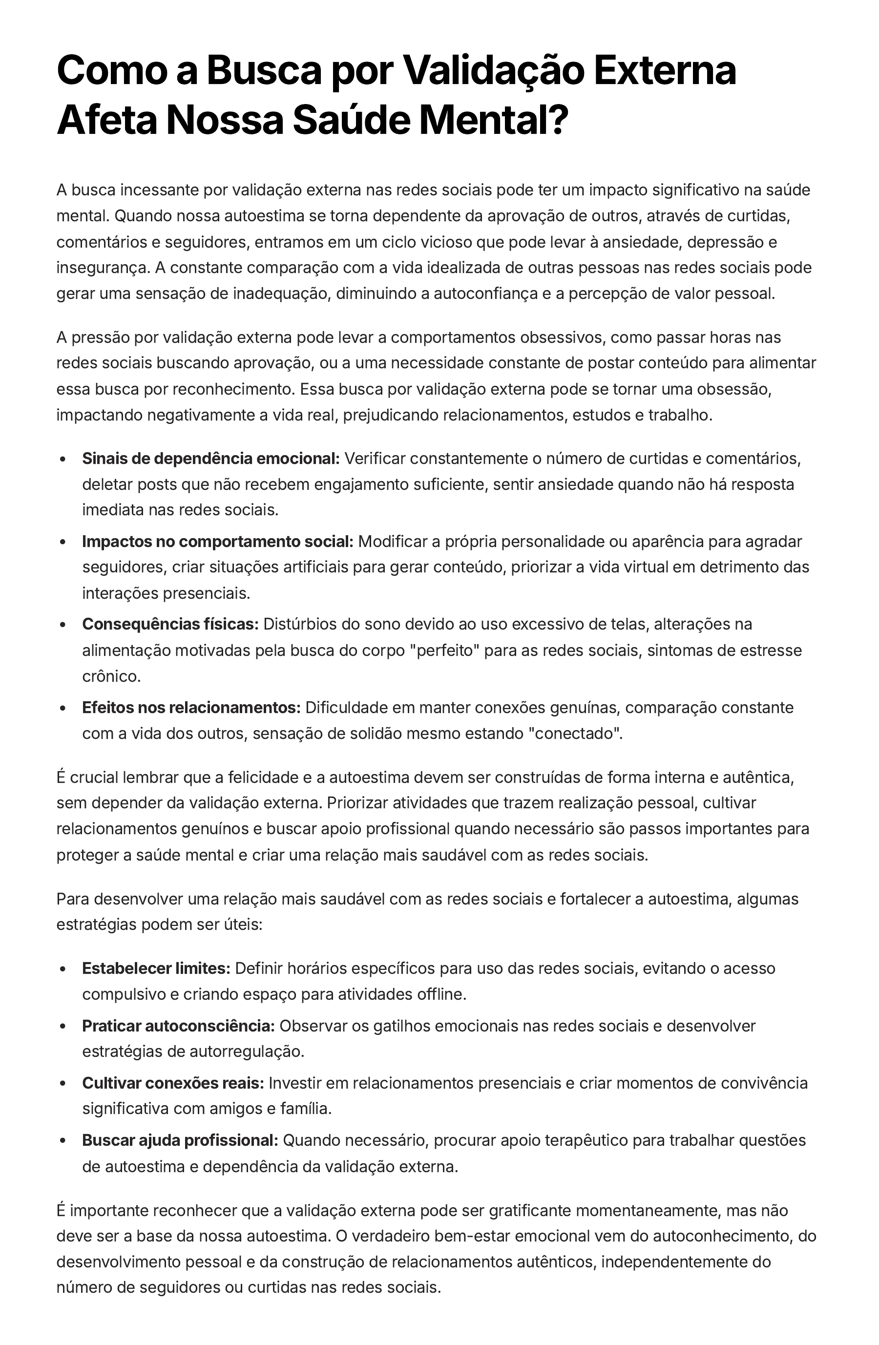 Como a Busca por Validação Externa Afeta Nossa Saúde Mental? A busca incessante por validação externa nas redes sociais pode ter um impacto significativo na saúde mental. Quando nossa autoestima se torna dependente da aprovação de outros, através de curtidas, comentários e seguidores, entramos em um ciclo vicioso que pode levar à ansiedade, depressão e insegurança. A constante comparação com a vida idealizada de outras pessoas nas redes sociais pode gerar uma sensação de inadequação, diminuindo a autoconfiança e a percepção de valor pessoal. A pressão por validação externa pode levar a comportamentos obsessivos, como passar horas nas redes sociais buscando aprovação, ou a uma necessidade constante de postar conteúdo para alimentar essa busca por reconhecimento. Essa busca por validação externa pode se tornar uma obsessão, impactando negativamente a vida real, prejudicando relacionamentos, estudos e trabalho. Sinais de dependência emocional: Verificar constantemente o número de curtidas e comentários, deletar posts que não recebem engajamento suficiente, sentir ansiedade quando não há resposta imediata nas redes sociais. Impactos no comportamento social: Modificar a própria personalidade ou aparência para agradar seguidores, criar situações artificiais para gerar conteúdo, priorizar a vida virtual em detrimento das interações presenciais. Consequências físicas: Distúrbios do sono devido ao uso excessivo de telas, alterações na alimentação motivadas pela busca do corpo "perfeito" para as redes sociais, sintomas de estresse crônico. Efeitos nos relacionamentos: Dificuldade em manter conexões genuínas, comparação constante com a vida dos outros, sensação de solidão mesmo estando "conectado". É crucial lembrar que a felicidade e a autoestima devem ser construídas de forma interna e autêntica, sem depender da validação externa. Priorizar atividades que trazem realização pessoal, cultivar relacionamentos genuínos e buscar apoio profissional quando necessário são passos importantes para proteger a saúde mental e criar uma relação mais saudável com as redes sociais. Para desenvolver uma relação mais saudável com as redes sociais e fortalecer a autoestima, algumas estratégias podem ser úteis: Estabelecer limites: Definir horários específicos para uso das redes sociais, evitando o acesso compulsivo e criando espaço para atividades offline. Praticar autoconsciência: Observar os gatilhos emocionais nas redes sociais e desenvolver estratégias de autorregulação. Cultivar conexões reais: Investir em relacionamentos presenciais e criar momentos de convivência significativa com amigos e família. Buscar ajuda profissional: Quando necessário, procurar apoio terapêutico para trabalhar questões de autoestima e dependência da validação externa. É importante reconhecer que a validação externa pode ser gratificante momentaneamente, mas não deve ser a base da nossa autoestima. O verdadeiro bem-estar emocional vem do autoconhecimento, do desenvolvimento pessoal e da construção de relacionamentos autênticos, independentemente do número de seguidores ou curtidas nas redes sociais.