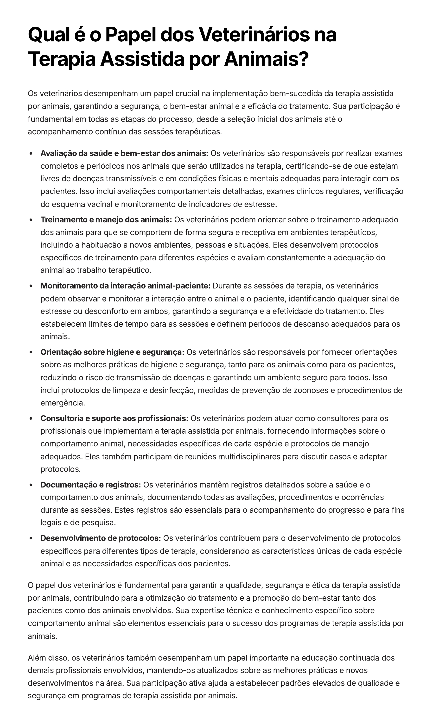 Qual é o Papel dos Veterinários na Terapia Assistida por Animais? Os veterinários desempenham um papel crucial na implementação bem-sucedida da terapia assistida por animais, garantindo a segurança, o bem-estar animal e a eficácia do tratamento. Sua participação é fundamental em todas as etapas do processo, desde a seleção inicial dos animais até o acompanhamento contínuo das sessões terapêuticas. Avaliação da saúde e bem-estar dos animais: Os veterinários são responsáveis por realizar exames completos e periódicos nos animais que serão utilizados na terapia, certificando-se de que estejam livres de doenças transmissíveis e em condições físicas e mentais adequadas para interagir com os pacientes. Isso inclui avaliações comportamentais detalhadas, exames clínicos regulares, verificação do esquema vacinal e monitoramento de indicadores de estresse. Treinamento e manejo dos animais: Os veterinários podem orientar sobre o treinamento adequado dos animais para que se comportem de forma segura e receptiva em ambientes terapêuticos, incluindo a habituação a novos ambientes, pessoas e situações. Eles desenvolvem protocolos específicos de treinamento para diferentes espécies e avaliam constantemente a adequação do animal ao trabalho terapêutico. Monitoramento da interação animal-paciente: Durante as sessões de terapia, os veterinários podem observar e monitorar a interação entre o animal e o paciente, identificando qualquer sinal de estresse ou desconforto em ambos, garantindo a segurança e a efetividade do tratamento. Eles estabelecem limites de tempo para as sessões e definem períodos de descanso adequados para os animais. Orientação sobre higiene e segurança: Os veterinários são responsáveis por fornecer orientações sobre as melhores práticas de higiene e segurança, tanto para os animais como para os pacientes, reduzindo o risco de transmissão de doenças e garantindo um ambiente seguro para todos. Isso inclui protocolos de limpeza e desinfecção, medidas de prevenção de zoonoses e procedimentos de emergência. Consultoria e suporte aos profissionais: Os veterinários podem atuar como consultores para os profissionais que implementam a terapia assistida por animais, fornecendo informações sobre o comportamento animal, necessidades específicas de cada espécie e protocolos de manejo adequados. Eles também participam de reuniões multidisciplinares para discutir casos e adaptar protocolos. Documentação e registros: Os veterinários mantêm registros detalhados sobre a saúde e o comportamento dos animais, documentando todas as avaliações, procedimentos e ocorrências durante as sessões. Estes registros são essenciais para o acompanhamento do progresso e para fins legais e de pesquisa. Desenvolvimento de protocolos: Os veterinários contribuem para o desenvolvimento de protocolos específicos para diferentes tipos de terapia, considerando as características únicas de cada espécie animal e as necessidades específicas dos pacientes. O papel dos veterinários é fundamental para garantir a qualidade, segurança e ética da terapia assistida por animais, contribuindo para a otimização do tratamento e a promoção do bem-estar tanto dos pacientes como dos animais envolvidos. Sua expertise técnica e conhecimento específico sobre comportamento animal são elementos essenciais para o sucesso dos programas de terapia assistida por animais. Além disso, os veterinários também desempenham um papel importante na educação continuada dos demais profissionais envolvidos, mantendo-os atualizados sobre as melhores práticas e novos desenvolvimentos na área. Sua participação ativa ajuda a estabelecer padrões elevados de qualidade e segurança em programas de terapia assistida por animais.