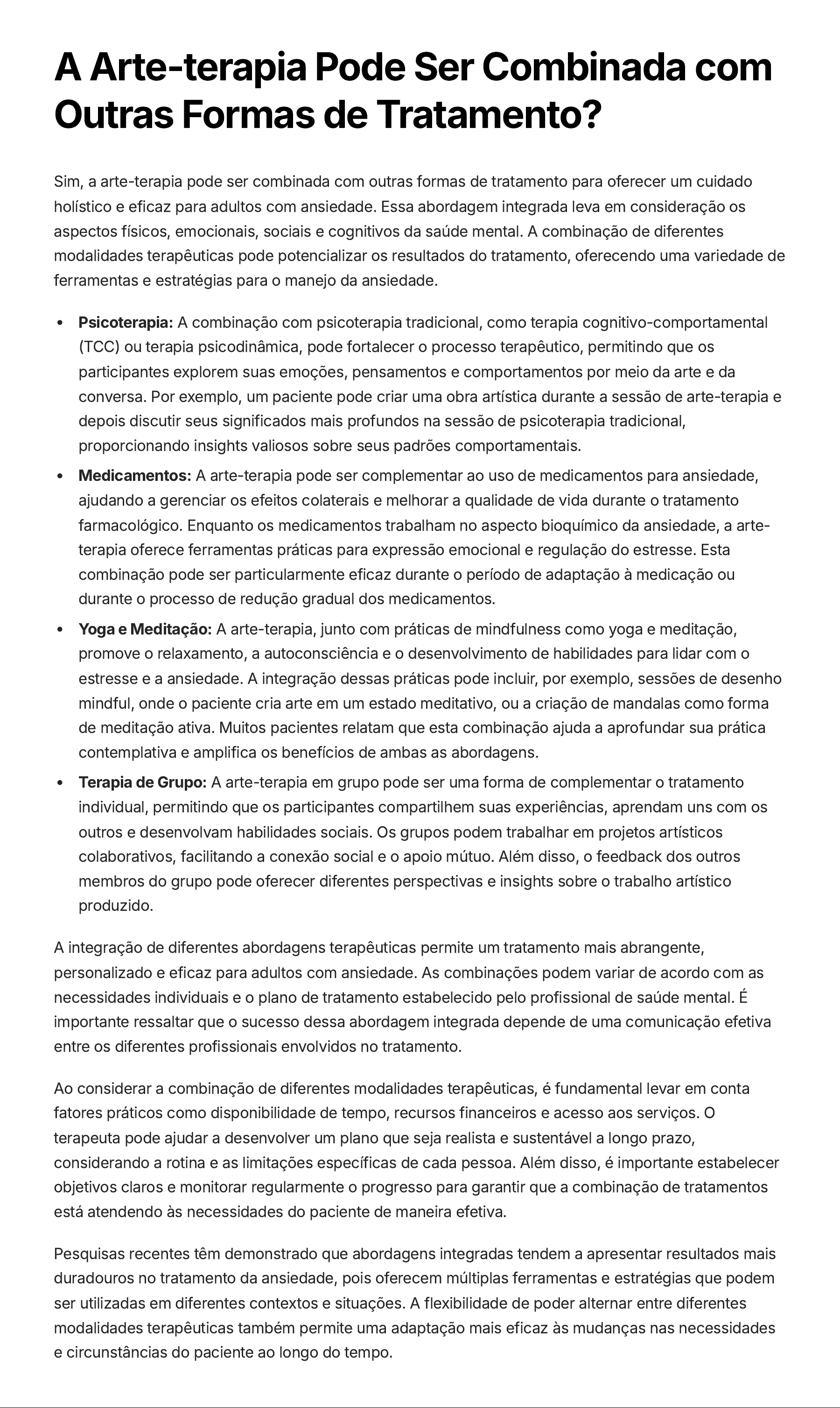 A Arte-terapia Pode Ser Combinada com Outras Formas de Tratamento? Sim, a arte-terapia pode ser combinada com outras formas de tratamento para oferecer um cuidado holístico e eficaz para adultos com ansiedade. Essa abordagem integrada leva em consideração os aspectos físicos, emocionais, sociais e cognitivos da saúde mental. A combinação de diferentes modalidades terapêuticas pode potencializar os resultados do tratamento, oferecendo uma variedade de ferramentas e estratégias para o manejo da ansiedade. Psicoterapia: A combinação com psicoterapia tradicional, como terapia cognitivo-comportamental (TCC) ou terapia psicodinâmica, pode fortalecer o processo terapêutico, permitindo que os participantes explorem suas emoções, pensamentos e comportamentos por meio da arte e da conversa. Por exemplo, um paciente pode criar uma obra artística durante a sessão de arte-terapia e depois discutir seus significados mais profundos na sessão de psicoterapia tradicional, proporcionando insights valiosos sobre seus padrões comportamentais. Medicamentos: A arte-terapia pode ser complementar ao uso de medicamentos para ansiedade, ajudando a gerenciar os efeitos colaterais e melhorar a qualidade de vida durante o tratamento farmacológico. Enquanto os medicamentos trabalham no aspecto bioquímico da ansiedade, a arte- terapia oferece ferramentas práticas para expressão emocional e regulação do estresse. Esta combinação pode ser particularmente eficaz durante o período de adaptação à medicação ou durante o processo de redução gradual dos medicamentos. Yoga e Meditação: A arte-terapia, junto com práticas de mindfulness como yoga e meditação, promove o relaxamento, a autoconsciência e o desenvolvimento de habilidades para lidar com o estresse e a ansiedade. A integração dessas práticas pode incluir, por exemplo, sessões de desenho mindful, onde o paciente cria arte em um estado meditativo, ou a criação de mandalas como forma de meditação ativa. Muitos pacientes relatam que esta combinação ajuda a aprofundar sua prática contemplativa e amplifica os benefícios de ambas as abordagens. Terapia de Grupo: A arte-terapia em grupo pode ser uma forma de complementar o tratamento individual, permitindo que os participantes compartilhem suas experiências, aprendam uns com os outros e desenvolvam habilidades sociais. Os grupos podem trabalhar em projetos artísticos colaborativos, facilitando a conexão social e o apoio mútuo. Além disso, o feedback dos outros membros do grupo pode oferecer diferentes perspectivas e insights sobre o trabalho artístico produzido. A integração de diferentes abordagens terapêuticas permite um tratamento mais abrangente, personalizado e eficaz para adultos com ansiedade. As combinações podem variar de acordo com as necessidades individuais e o plano de tratamento estabelecido pelo profissional de saúde mental. É importante ressaltar que o sucesso dessa abordagem integrada depende de uma comunicação efetiva entre os diferentes profissionais envolvidos no tratamento. Ao considerar a combinação de diferentes modalidades terapêuticas, é fundamental levar em conta fatores práticos como disponibilidade de tempo, recursos financeiros e acesso aos serviços. O terapeuta pode ajudar a desenvolver um plano que seja realista e sustentável a longo prazo, considerando a rotina e as limitações específicas de cada pessoa. Além disso, é importante estabelecer objetivos claros e monitorar regularmente o progresso para garantir que a combinação de tratamentos está atendendo às necessidades do paciente de maneira efetiva. Pesquisas recentes têm demonstrado que abordagens integradas tendem a apresentar resultados mais duradouros no tratamento da ansiedade, pois oferecem múltiplas ferramentas e estratégias que podem ser utilizadas em diferentes contextos e situações. A flexibilidade de poder alternar entre diferentes modalidades terapêuticas também permite uma adaptação mais eficaz às mudanças nas necessidades e circunstâncias do paciente ao longo do tempo.