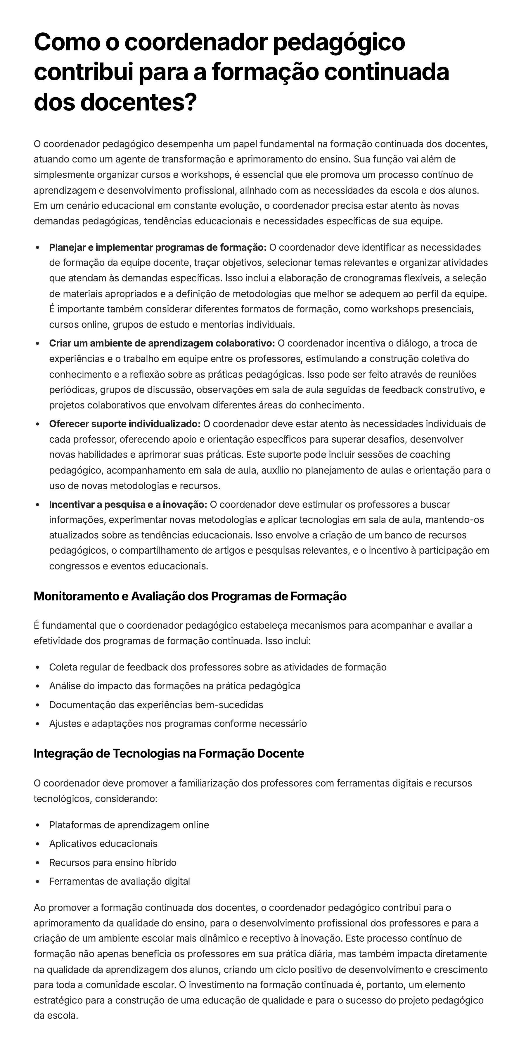 Como o coordenador pedagógico contribui para a formação continuada dos docentes? O coordenador pedagógico desempenha um papel fundamental na formação continuada dos docentes, atuando como um agente de transformação e aprimoramento do ensino. Sua função vai além de simplesmente organizar cursos e workshops, é essencial que ele promova um processo contínuo de aprendizagem e desenvolvimento profissional, alinhado com as necessidades da escola e dos alunos. Em um cenário educacional em constante evolução, o coordenador precisa estar atento às novas demandas pedagógicas, tendências educacionais e necessidades específicas de sua equipe. Planejar e implementar programas de formação: O coordenador deve identificar as necessidades de formação da equipe docente, traçar objetivos, selecionar temas relevantes e organizar atividades que atendam às demandas específicas. Isso inclui a elaboração de cronogramas flexíveis, a seleção de materiais apropriados e a definição de metodologias que melhor se adequem ao perfil da equipe. É importante também considerar diferentes formatos de formação, como workshops presenciais, cursos online, grupos de estudo e mentorias individuais. Criar um ambiente de aprendizagem colaborativo: O coordenador incentiva o diálogo, a troca de experiências e o trabalho em equipe entre os professores, estimulando a construção coletiva do conhecimento e a reflexão sobre as práticas pedagógicas. Isso pode ser feito através de reuniões periódicas, grupos de discussão, observações em sala de aula seguidas de feedback construtivo, e projetos colaborativos que envolvam diferentes áreas do conhecimento. Oferecer suporte individualizado: O coordenador deve estar atento às necessidades individuais de cada professor, oferecendo apoio e orientação específicos para superar desafios, desenvolver novas habilidades e aprimorar suas práticas. Este suporte pode incluir sessões de coaching pedagógico, acompanhamento em sala de aula, auxílio no planejamento de aulas e orientação para o uso de novas metodologias e recursos. Incentivar a pesquisa e a inovação: O coordenador deve estimular os professores a buscar informações, experimentar novas metodologias e aplicar tecnologias em sala de aula, mantendo-os atualizados sobre as tendências educacionais. Isso envolve a criação de um banco de recursos pedagógicos, o compartilhamento de artigos e pesquisas relevantes, e o incentivo à participação em congressos e eventos educacionais. Monitoramento e Avaliação dos Programas de Formação É fundamental que o coordenador pedagógico estabeleça mecanismos para acompanhar e avaliar a efetividade dos programas de formação continuada. Isso inclui: Coleta regular de feedback dos professores sobre as atividades de formação Análise do impacto das formações na prática pedagógica Documentação das experiências bem-sucedidas Ajustes e adaptações nos programas conforme necessário Integração de Tecnologias na Formação Docente O coordenador deve promover a familiarização dos professores com ferramentas digitais e recursos tecnológicos, considerando: Plataformas de aprendizagem online Aplicativos educacionais Recursos para ensino híbrido Ferramentas de avaliação digital Ao promover a formação continuada dos docentes, o coordenador pedagógico contribui para o aprimoramento da qualidade do ensino, para o desenvolvimento profissional dos professores e para a criação de um ambiente escolar mais dinâmico e receptivo à inovação. Este processo contínuo de formação não apenas beneficia os professores em sua prática diária, mas também impacta diretamente na qualidade da aprendizagem dos alunos, criando um ciclo positivo de desenvolvimento e crescimento para toda a comunidade escolar. O investimento na formação continuada é, portanto, um elemento estratégico para a construção de uma educação de qualidade e para o sucesso do projeto pedagógico da escola.