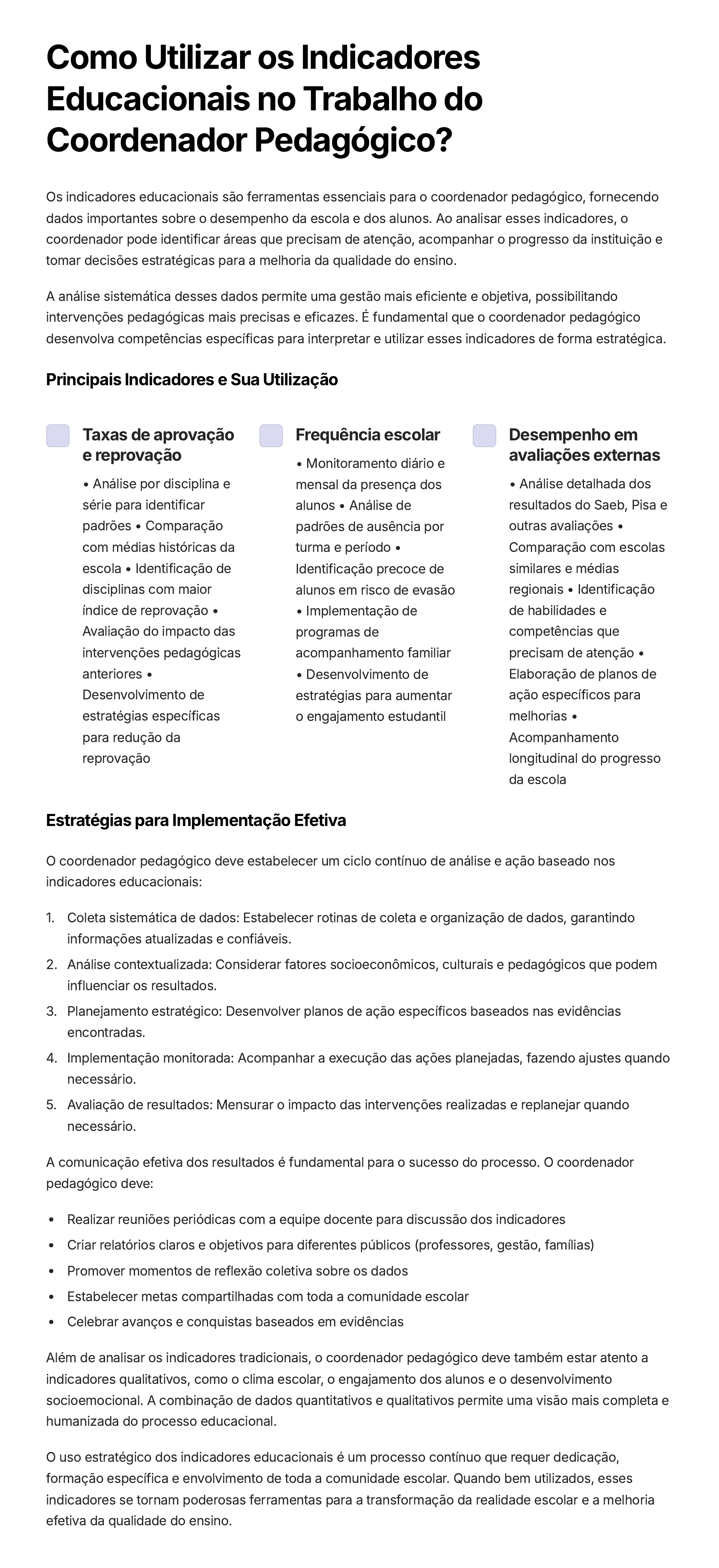 Como Utilizar os Indicadores Educacionais no Trabalho do Coordenador Pedagógico? Os indicadores educacionais são ferramentas essenciais para o coordenador pedagógico, fornecendo dados importantes sobre o desempenho da escola e dos alunos. Ao analisar esses indicadores, o coordenador pode identificar áreas que precisam de atenção, acompanhar o progresso da instituição e tomar decisões estratégicas para a melhoria da qualidade do ensino. A análise sistemática desses dados permite uma gestão mais eficiente e objetiva, possibilitando intervenções pedagógicas mais precisas e eficazes. É fundamental que o coordenador pedagógico desenvolva competências específicas para interpretar e utilizar esses indicadores de forma estratégica. Principais Indicadores e Sua Utilização Taxas de aprovação e reprovação • Análise por disciplina e série para identificar padrões • Comparação com médias históricas da escola • Identificação de disciplinas com maior índice de reprovação • Avaliação do impacto das intervenções pedagógicas anteriores • Desenvolvimento de estratégias específicas para redução da reprovação Frequência escolar • Monitoramento diário e mensal da presença dos alunos • Análise de padrões de ausência por turma e período • Identificação precoce de alunos em risco de evasão • Implementação de programas de acompanhamento familiar • Desenvolvimento de estratégias para aumentar o engajamento estudantil Desempenho em avaliações externas • Análise detalhada dos resultados do Saeb, Pisa e outras avaliações • Comparação com escolas similares e médias regionais • Identificação de habilidades e competências que precisam de atenção • Elaboração de planos de ação específicos para melhorias • Acompanhamento longitudinal do progresso da escola Estratégias para Implementação Efetiva O coordenador pedagógico deve estabelecer um ciclo contínuo de análise e ação baseado nos indicadores educacionais: Coleta sistemática de dados: Estabelecer rotinas de coleta e organização de dados, garantindo informações atualizadas e confiáveis. 1. Análise contextualizada: Considerar fatores socioeconômicos, culturais e pedagógicos que podem influenciar os resultados. 2. Planejamento estratégico: Desenvolver planos de ação específicos baseados nas evidências encontradas. 3. Implementação monitorada: Acompanhar a execução das ações planejadas, fazendo ajustes quando necessário. 4. Avaliação de resultados: Mensurar o impacto das intervenções realizadas e replanejar quando necessário. 5. A comunicação efetiva dos resultados é fundamental para o sucesso do processo. O coordenador pedagógico deve: Realizar reuniões periódicas com a equipe docente para discussão dos indicadores Criar relatórios claros e objetivos para diferentes públicos (professores, gestão, famílias) Promover momentos de reflexão coletiva sobre os dados Estabelecer metas compartilhadas com toda a comunidade escolar Celebrar avanços e conquistas baseados em evidências Além de analisar os indicadores tradicionais, o coordenador pedagógico deve também estar atento a indicadores qualitativos, como o clima escolar, o engajamento dos alunos e o desenvolvimento socioemocional. A combinação de dados quantitativos e qualitativos permite uma visão mais completa e humanizada do processo educacional. O uso estratégico dos indicadores educacionais é um processo contínuo que requer dedicação, formação específica e envolvimento de toda a comunidade escolar. Quando bem utilizados, esses indicadores se tornam poderosas ferramentas para a transformação da realidade escolar e a melhoria efetiva da qualidade do ensino.