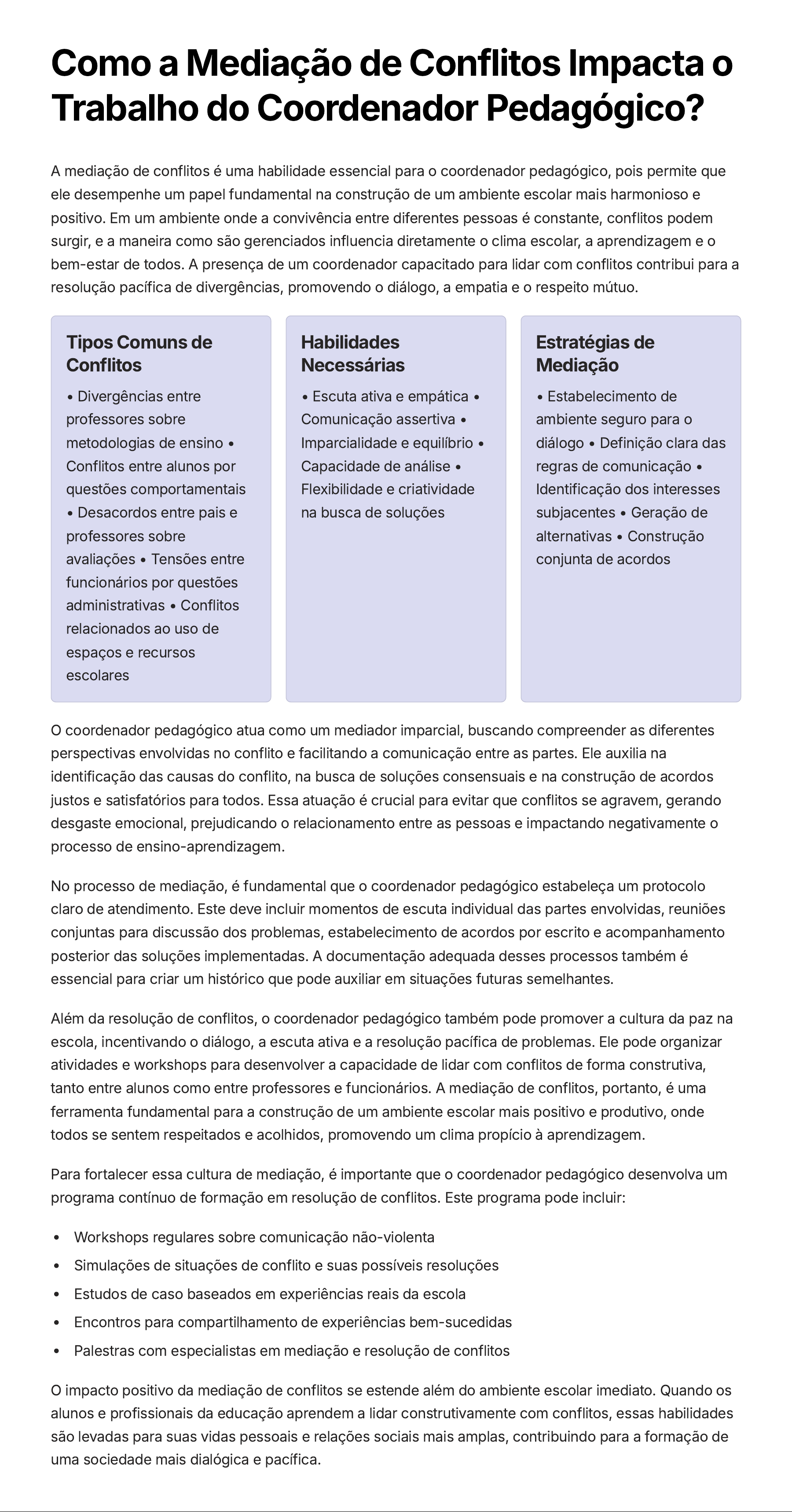 Como a Mediação de Conflitos Impacta o Trabalho do Coordenador Pedagógico? A mediação de conflitos é uma habilidade essencial para o coordenador pedagógico, pois permite que ele desempenhe um papel fundamental na construção de um ambiente escolar mais harmonioso e positivo. Em um ambiente onde a convivência entre diferentes pessoas é constante, conflitos podem surgir, e a maneira como são gerenciados influencia diretamente o clima escolar, a aprendizagem e o bem-estar de todos. A presença de um coordenador capacitado para lidar com conflitos contribui para a resolução pacífica de divergências, promovendo o diálogo, a empatia e o respeito mútuo. Tipos Comuns de Conflitos • Divergências entre professores sobre metodologias de ensino • Conflitos entre alunos por questões comportamentais • Desacordos entre pais e professores sobre avaliações • Tensões entre funcionários por questões administrativas • Conflitos relacionados ao uso de espaços e recursos escolares Habilidades Necessárias • Escuta ativa e empática • Comunicação assertiva • Imparcialidade e equilíbrio • Capacidade de análise • Flexibilidade e criatividade na busca de soluções Estratégias de Mediação • Estabelecimento de ambiente seguro para o diálogo • Definição clara das regras de comunicação • Identificação dos interesses subjacentes • Geração de alternativas • Construção conjunta de acordos O coordenador pedagógico atua como um mediador imparcial, buscando compreender as diferentes perspectivas envolvidas no conflito e facilitando a comunicação entre as partes. Ele auxilia na identificação das causas do conflito, na busca de soluções consensuais e na construção de acordos justos e satisfatórios para todos. Essa atuação é crucial para evitar que conflitos se agravem, gerando desgaste emocional, prejudicando o relacionamento entre as pessoas e impactando negativamente o processo de ensino-aprendizagem. No processo de mediação, é fundamental que o coordenador pedagógico estabeleça um protocolo claro de atendimento. Este deve incluir momentos de escuta individual das partes envolvidas, reuniões conjuntas para discussão dos problemas, estabelecimento de acordos por escrito e acompanhamento posterior das soluções implementadas. A documentação adequada desses processos também é essencial para criar um histórico que pode auxiliar em situações futuras semelhantes. Além da resolução de conflitos, o coordenador pedagógico também pode promover a cultura da paz na escola, incentivando o diálogo, a escuta ativa e a resolução pacífica de problemas. Ele pode organizar atividades e workshops para desenvolver a capacidade de lidar com conflitos de forma construtiva, tanto entre alunos como entre professores e funcionários. A mediação de conflitos, portanto, é uma ferramenta fundamental para a construção de um ambiente escolar mais positivo e produtivo, onde todos se sentem respeitados e acolhidos, promovendo um clima propício à aprendizagem. Para fortalecer essa cultura de mediação, é importante que o coordenador pedagógico desenvolva um programa contínuo de formação em resolução de conflitos. Este programa pode incluir: Workshops regulares sobre comunicação não-violenta Simulações de situações de conflito e suas possíveis resoluções Estudos de caso baseados em experiências reais da escola Encontros para compartilhamento de experiências bem-sucedidas Palestras com especialistas em mediação e resolução de conflitos O impacto positivo da mediação de conflitos se estende além do ambiente escolar imediato. Quando os alunos e profissionais da educação aprendem a lidar construtivamente com conflitos, essas habilidades são levadas para suas vidas pessoais e relações sociais mais amplas, contribuindo para a formação de uma sociedade mais dialógica e pacífica.