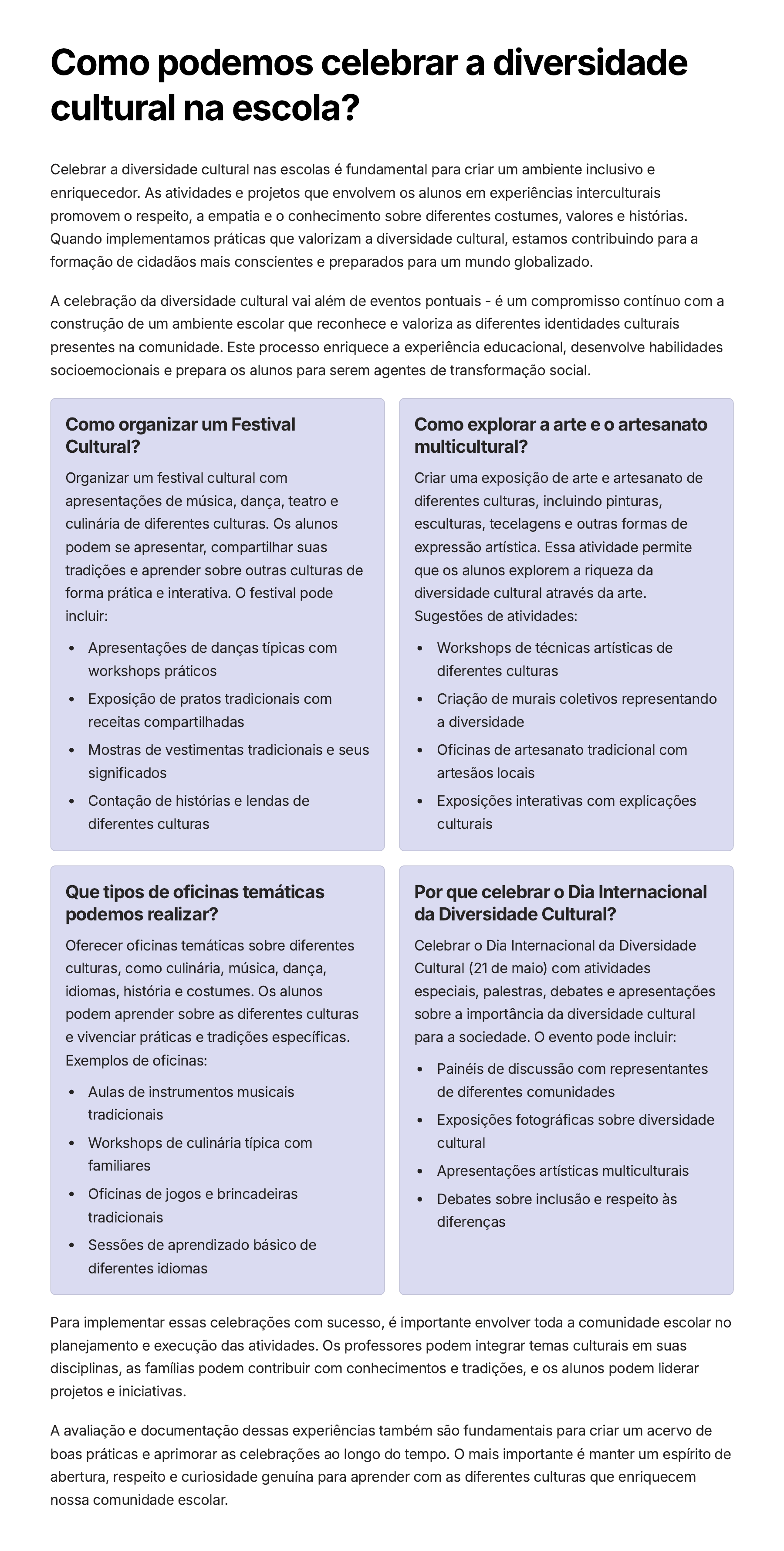 Como podemos celebrar a diversidade cultural na escola? Celebrar a diversidade cultural nas escolas é fundamental para criar um ambiente inclusivo e enriquecedor. As atividades e projetos que envolvem os alunos em experiências interculturais promovem o respeito, a empatia e o conhecimento sobre diferentes costumes, valores e histórias. Quando implementamos práticas que valorizam a diversidade cultural, estamos contribuindo para a formação de cidadãos mais conscientes e preparados para um mundo globalizado. A celebração da diversidade cultural vai além de eventos pontuais - é um compromisso contínuo com a construção de um ambiente escolar que reconhece e valoriza as diferentes identidades culturais presentes na comunidade. Este processo enriquece a experiência educacional, desenvolve habilidades socioemocionais e prepara os alunos para serem agentes de transformação social. Como organizar um Festival Cultural? Organizar um festival cultural com apresentações de música, dança, teatro e culinária de diferentes culturas. Os alunos podem se apresentar, compartilhar suas tradições e aprender sobre outras culturas de forma prática e interativa. O festival pode incluir: Apresentações de danças típicas com workshops práticos Exposição de pratos tradicionais com receitas compartilhadas Mostras de vestimentas tradicionais e seus significados Contação de histórias e lendas de diferentes culturas Como explorar a arte e o artesanato multicultural? Criar uma exposição de arte e artesanato de diferentes culturas, incluindo pinturas, esculturas, tecelagens e outras formas de expressão artística. Essa atividade permite que os alunos explorem a riqueza da diversidade cultural através da arte. Sugestões de atividades: Workshops de técnicas artísticas de diferentes culturas Criação de murais coletivos representando a diversidade Oficinas de artesanato tradicional com artesãos locais Exposições interativas com explicações culturais Que tipos de oficinas temáticas podemos realizar? Oferecer oficinas temáticas sobre diferentes culturas, como culinária, música, dança, idiomas, história e costumes. Os alunos podem aprender sobre as diferentes culturas e vivenciar práticas e tradições específicas. Exemplos de oficinas: Aulas de instrumentos musicais tradicionais Workshops de culinária típica com familiares Oficinas de jogos e brincadeiras tradicionais Sessões de aprendizado básico de diferentes idiomas Por que celebrar o Dia Internacional da Diversidade Cultural? Celebrar o Dia Internacional da Diversidade Cultural (21 de maio) com atividades especiais, palestras, debates e apresentações sobre a importância da diversidade cultural para a sociedade. O evento pode incluir: Painéis de discussão com representantes de diferentes comunidades Exposições fotográficas sobre diversidade cultural Apresentações artísticas multiculturais Debates sobre inclusão e respeito às diferenças Para implementar essas celebrações com sucesso, é importante envolver toda a comunidade escolar no planejamento e execução das atividades. Os professores podem integrar temas culturais em suas disciplinas, as famílias podem contribuir com conhecimentos e tradições, e os alunos podem liderar projetos e iniciativas. A avaliação e documentação dessas experiências também são fundamentais para criar um acervo de boas práticas e aprimorar as celebrações ao longo do tempo. O mais importante é manter um espírito de abertura, respeito e curiosidade genuína para aprender com as diferentes culturas que enriquecem nossa comunidade escolar.