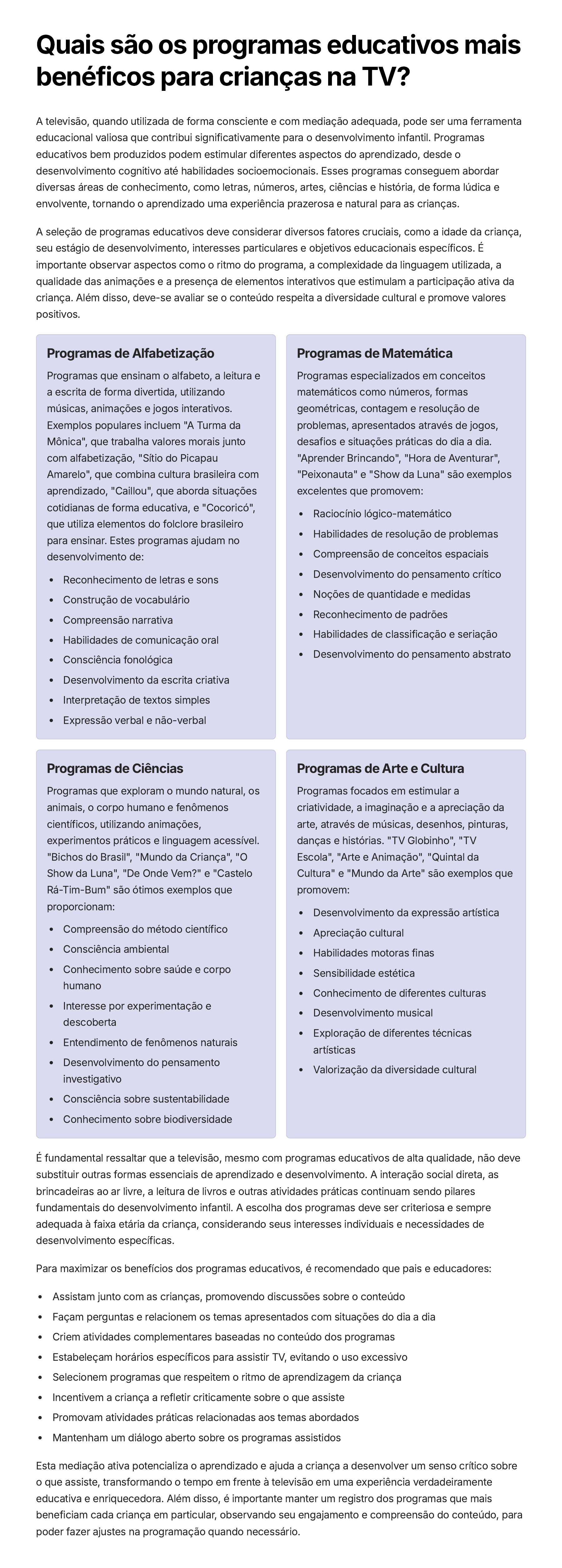 Quais são os programas educativos mais benéficos para crianças na TV? A televisão, quando utilizada de forma consciente e com mediação adequada, pode ser uma ferramenta educacional valiosa que contribui significativamente para o desenvolvimento infantil. Programas educativos bem produzidos podem estimular diferentes aspectos do aprendizado, desde o desenvolvimento cognitivo até habilidades socioemocionais. Esses programas conseguem abordar diversas áreas de conhecimento, como letras, números, artes, ciências e história, de forma lúdica e envolvente, tornando o aprendizado uma experiência prazerosa e natural para as crianças. A seleção de programas educativos deve considerar diversos fatores cruciais, como a idade da criança, seu estágio de desenvolvimento, interesses particulares e objetivos educacionais específicos. É importante observar aspectos como o ritmo do programa, a complexidade da linguagem utilizada, a qualidade das animações e a presença de elementos interativos que estimulam a participação ativa da criança. Além disso, deve-se avaliar se o conteúdo respeita a diversidade cultural e promove valores positivos. Programas de Alfabetização Programas que ensinam o alfabeto, a leitura e a escrita de forma divertida, utilizando músicas, animações e jogos interativos. Exemplos populares incluem "A Turma da Mônica", que trabalha valores morais junto com alfabetização, "Sítio do Picapau Amarelo", que combina cultura brasileira com aprendizado, "Caillou", que aborda situações cotidianas de forma educativa, e "Cocoricó", que utiliza elementos do folclore brasileiro para ensinar. Estes programas ajudam no desenvolvimento de: Reconhecimento de letras e sons Construção de vocabulário Compreensão narrativa Habilidades de comunicação oral Consciência fonológica Desenvolvimento da escrita criativa Interpretação de textos simples Expressão verbal e não-verbal Programas de Matemática Programas especializados em conceitos matemáticos como números, formas geométricas, contagem e resolução de problemas, apresentados através de jogos, desafios e situações práticas do dia a dia. "Aprender Brincando", "Hora de Aventurar", "Peixonauta" e "Show da Luna" são exemplos excelentes que promovem: Raciocínio lógico-matemático Habilidades de resolução de problemas Compreensão de conceitos espaciais Desenvolvimento do pensamento crítico Noções de quantidade e medidas Reconhecimento de padrões Habilidades de classificação e seriação Desenvolvimento do pensamento abstrato Programas de Ciências Programas que exploram o mundo natural, os animais, o corpo humano e fenômenos científicos, utilizando animações, experimentos práticos e linguagem acessível. "Bichos do Brasil", "Mundo da Criança", "O Show da Luna", "De Onde Vem?" e "Castelo Rá-Tim-Bum" são ótimos exemplos que proporcionam: Compreensão do método científico Consciência ambiental Conhecimento sobre saúde e corpo humano Interesse por experimentação e descoberta Entendimento de fenômenos naturais Desenvolvimento do pensamento investigativo Consciência sobre sustentabilidade Conhecimento sobre biodiversidade Programas de Arte e Cultura Programas focados em estimular a criatividade, a imaginação e a apreciação da arte, através de músicas, desenhos, pinturas, danças e histórias. "TV Globinho", "TV Escola", "Arte e Animação", "Quintal da Cultura" e "Mundo da Arte" são exemplos que promovem: Desenvolvimento da expressão artística Apreciação cultural Habilidades motoras finas Sensibilidade estética Conhecimento de diferentes culturas Desenvolvimento musical Exploração de diferentes técnicas artísticas Valorização da diversidade cultural É fundamental ressaltar que a televisão, mesmo com programas educativos de alta qualidade, não deve substituir outras formas essenciais de aprendizado e desenvolvimento. A interação social direta, as brincadeiras ao ar livre, a leitura de livros e outras atividades práticas continuam sendo pilares fundamentais do desenvolvimento infantil. A escolha dos programas deve ser criteriosa e sempre adequada à faixa etária da criança, considerando seus interesses individuais e necessidades de desenvolvimento específicas. Para maximizar os benefícios dos programas educativos, é recomendado que pais e educadores: Assistam junto com as crianças, promovendo discussões sobre o conteúdo Façam perguntas e relacionem os temas apresentados com situações do dia a dia Criem atividades complementares baseadas no conteúdo dos programas Estabeleçam horários específicos para assistir TV, evitando o uso excessivo Selecionem programas que respeitem o ritmo de aprendizagem da criança Incentivem a criança a refletir criticamente sobre o que assiste Promovam atividades práticas relacionadas aos temas abordados Mantenham um diálogo aberto sobre os programas assistidos Esta mediação ativa potencializa o aprendizado e ajuda a criança a desenvolver um senso crítico sobre o que assiste, transformando o tempo em frente à televisão em uma experiência verdadeiramente educativa e enriquecedora. Além disso, é importante manter um registro dos programas que mais beneficiam cada criança em particular, observando seu engajamento e compreensão do conteúdo, para poder fazer ajustes na programação quando necessário.