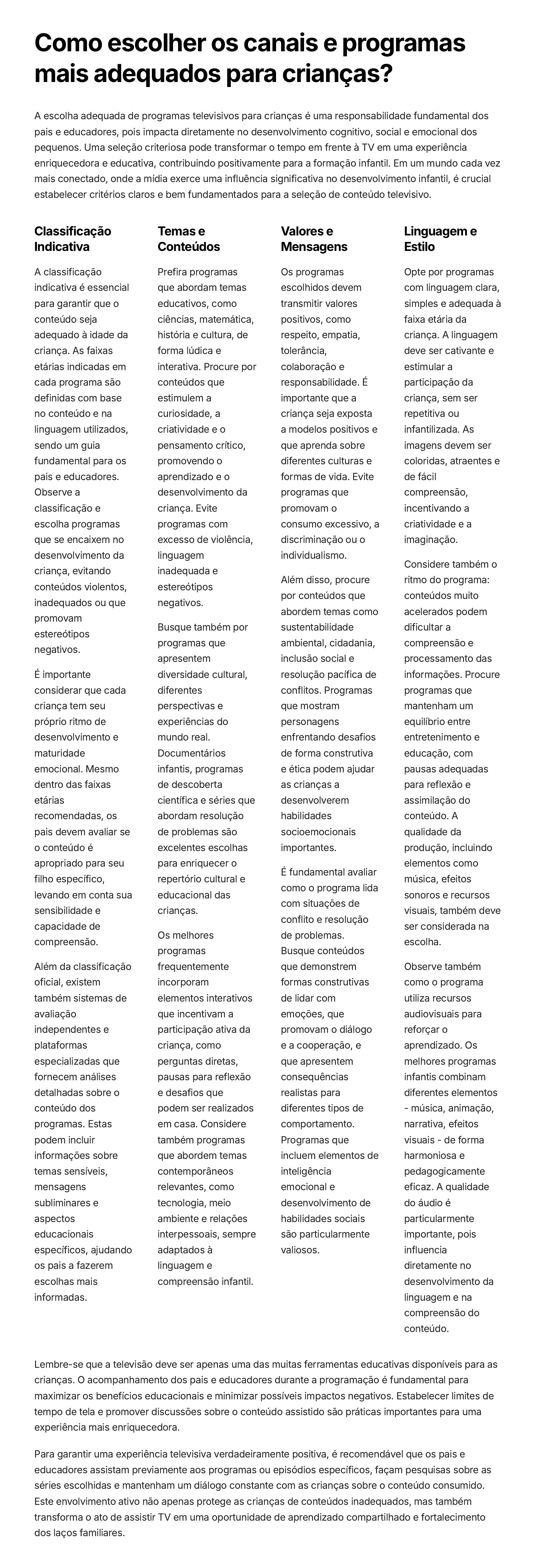 Como escolher os canais e programas mais adequados para crianças? A escolha adequada de programas televisivos para crianças é uma responsabilidade fundamental dos pais e educadores, pois impacta diretamente no desenvolvimento cognitivo, social e emocional dos pequenos. Uma seleção criteriosa pode transformar o tempo em frente à TV em uma experiência enriquecedora e educativa, contribuindo positivamente para a formação infantil. Em um mundo cada vez mais conectado, onde a mídia exerce uma influência significativa no desenvolvimento infantil, é crucial estabelecer critérios claros e bem fundamentados para a seleção de conteúdo televisivo. Classificação Indicativa A classificação indicativa é essencial para garantir que o conteúdo seja adequado à idade da criança. As faixas etárias indicadas em cada programa são definidas com base no conteúdo e na linguagem utilizados, sendo um guia fundamental para os pais e educadores. Observe a classificação e escolha programas que se encaixem no desenvolvimento da criança, evitando conteúdos violentos, inadequados ou que promovam estereótipos negativos. É importante considerar que cada criança tem seu próprio ritmo de desenvolvimento e maturidade emocional. Mesmo dentro das faixas etárias recomendadas, os pais devem avaliar se o conteúdo é apropriado para seu filho específico, levando em conta sua sensibilidade e capacidade de compreensão. Além da classificação oficial, existem também sistemas de avaliação independentes e plataformas especializadas que fornecem análises detalhadas sobre o conteúdo dos programas. Estas podem incluir informações sobre temas sensíveis, mensagens subliminares e aspectos educacionais específicos, ajudando os pais a fazerem escolhas mais informadas. Temas e Conteúdos Prefira programas que abordam temas educativos, como ciências, matemática, história e cultura, de forma lúdica e interativa. Procure por conteúdos que estimulem a curiosidade, a criatividade e o pensamento crítico, promovendo o aprendizado e o desenvolvimento da criança. Evite programas com excesso de violência, linguagem inadequada e estereótipos negativos. Busque também por programas que apresentem diversidade cultural, diferentes perspectivas e experiências do mundo real. Documentários infantis, programas de descoberta científica e séries que abordam resolução de problemas são excelentes escolhas para enriquecer o repertório cultural e educacional das crianças. Os melhores programas frequentemente incorporam elementos interativos que incentivam a participação ativa da criança, como perguntas diretas, pausas para reflexão e desafios que podem ser realizados em casa. Considere também programas que abordem temas contemporâneos relevantes, como tecnologia, meio ambiente e relações interpessoais, sempre adaptados à linguagem e compreensão infantil. Valores e Mensagens Os programas escolhidos devem transmitir valores positivos, como respeito, empatia, tolerância, colaboração e responsabilidade. É importante que a criança seja exposta a modelos positivos e que aprenda sobre diferentes culturas e formas de vida. Evite programas que promovam o consumo excessivo, a discriminação ou o individualismo. Além disso, procure por conteúdos que abordem temas como sustentabilidade ambiental, cidadania, inclusão social e resolução pacífica de conflitos. Programas que mostram personagens enfrentando desafios de forma construtiva e ética podem ajudar as crianças a desenvolverem habilidades socioemocionais importantes. É fundamental avaliar como o programa lida com situações de conflito e resolução de problemas. Busque conteúdos que demonstrem formas construtivas de lidar com emoções, que promovam o diálogo e a cooperação, e que apresentem consequências realistas para diferentes tipos de comportamento. Programas que incluem elementos de inteligência emocional e desenvolvimento de habilidades sociais são particularmente valiosos. Linguagem e Estilo Opte por programas com linguagem clara, simples e adequada à faixa etária da criança. A linguagem deve ser cativante e estimular a participação da criança, sem ser repetitiva ou infantilizada. As imagens devem ser coloridas, atraentes e de fácil compreensão, incentivando a criatividade e a imaginação. Considere também o ritmo do programa: conteúdos muito acelerados podem dificultar a compreensão e processamento das informações. Procure programas que mantenham um equilíbrio entre entretenimento e educação, com pausas adequadas para reflexão e assimilação do conteúdo. A qualidade da produção, incluindo elementos como música, efeitos sonoros e recursos visuais, também deve ser considerada na escolha. Observe também como o programa utiliza recursos audiovisuais para reforçar o aprendizado. Os melhores programas infantis combinam diferentes elementos - música, animação, narrativa, efeitos visuais - de forma harmoniosa e pedagogicamente eficaz. A qualidade do áudio é particularmente importante, pois influencia diretamente no desenvolvimento da linguagem e na compreensão do conteúdo. Lembre-se que a televisão deve ser apenas uma das muitas ferramentas educativas disponíveis para as crianças. O acompanhamento dos pais e educadores durante a programação é fundamental para maximizar os benefícios educacionais e minimizar possíveis impactos negativos. Estabelecer limites de tempo de tela e promover discussões sobre o conteúdo assistido são práticas importantes para uma experiência mais enriquecedora. Para garantir uma experiência televisiva verdadeiramente positiva, é recomendável que os pais e educadores assistam previamente aos programas ou episódios específicos, façam pesquisas sobre as séries escolhidas e mantenham um diálogo constante com as crianças sobre o conteúdo consumido. Este envolvimento ativo não apenas protege as crianças de conteúdos inadequados, mas também transfo