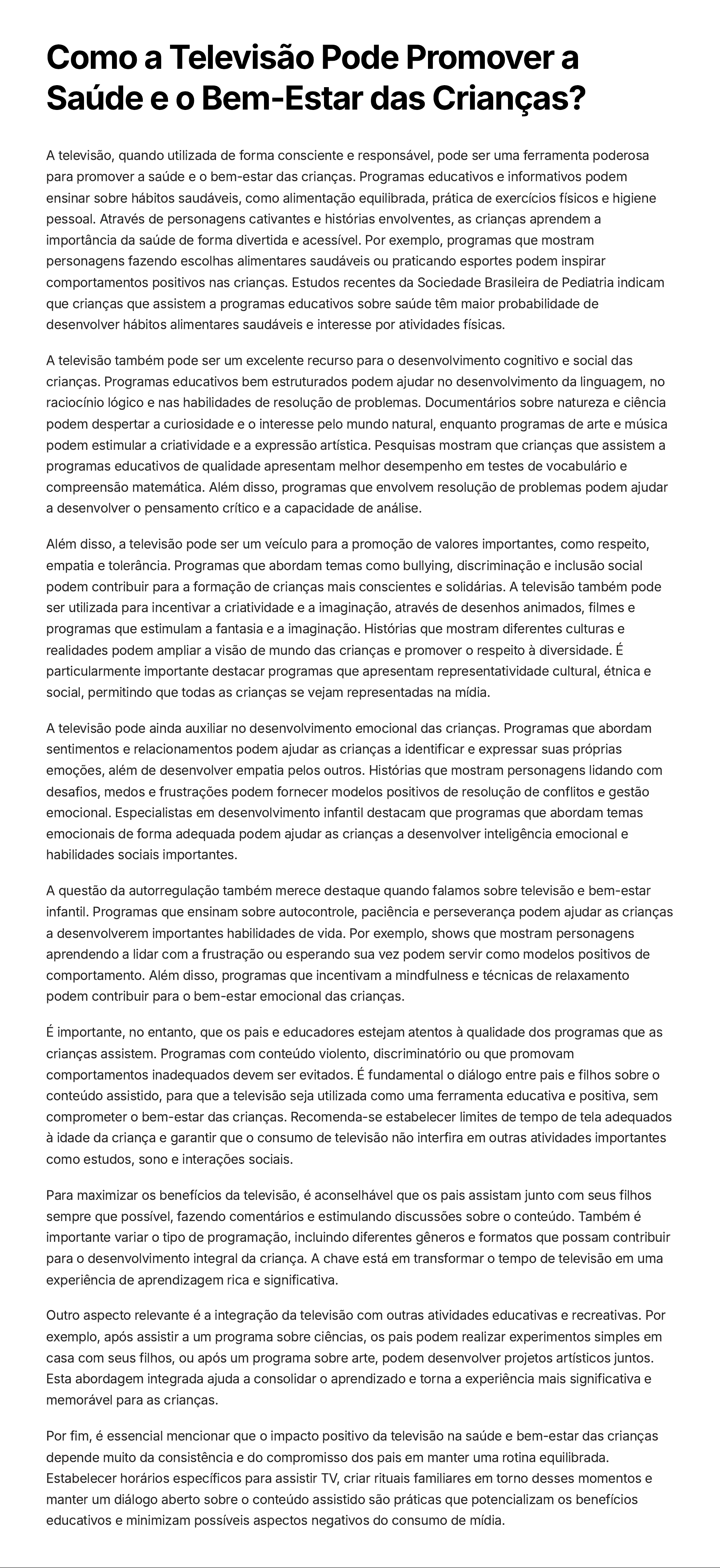 Como a Televisão Pode Promover a Saúde e o Bem-Estar das Crianças? A televisão, quando utilizada de forma consciente e responsável, pode ser uma ferramenta poderosa para promover a saúde e o bem-estar das crianças. Programas educativos e informativos podem ensinar sobre hábitos saudáveis, como alimentação equilibrada, prática de exercícios físicos e higiene pessoal. Através de personagens cativantes e histórias envolventes, as crianças aprendem a importância da saúde de forma divertida e acessível. Por exemplo, programas que mostram personagens fazendo escolhas alimentares saudáveis ou praticando esportes podem inspirar comportamentos positivos nas crianças. Estudos recentes da Sociedade Brasileira de Pediatria indicam que crianças que assistem a programas educativos sobre saúde têm maior probabilidade de desenvolver hábitos alimentares saudáveis e interesse por atividades físicas. A televisão também pode ser um excelente recurso para o desenvolvimento cognitivo e social das crianças. Programas educativos bem estruturados podem ajudar no desenvolvimento da linguagem, no raciocínio lógico e nas habilidades de resolução de problemas. Documentários sobre natureza e ciência podem despertar a curiosidade e o interesse pelo mundo natural, enquanto programas de arte e música podem estimular a criatividade e a expressão artística. Pesquisas mostram que crianças que assistem a programas educativos de qualidade apresentam melhor desempenho em testes de vocabulário e compreensão matemática. Além disso, programas que envolvem resolução de problemas podem ajudar a desenvolver o pensamento crítico e a capacidade de análise. Além disso, a televisão pode ser um veículo para a promoção de valores importantes, como respeito, empatia e tolerância. Programas que abordam temas como bullying, discriminação e inclusão social podem contribuir para a formação de crianças mais conscientes e solidárias. A televisão também pode ser utilizada para incentivar a criatividade e a imaginação, através de desenhos animados, filmes e programas que estimulam a fantasia e a imaginação. Histórias que mostram diferentes culturas e realidades podem ampliar a visão de mundo das crianças e promover o respeito à diversidade. É particularmente importante destacar programas que apresentam representatividade cultural, étnica e social, permitindo que todas as crianças se vejam representadas na mídia. A televisão pode ainda auxiliar no desenvolvimento emocional das crianças. Programas que abordam sentimentos e relacionamentos podem ajudar as crianças a identificar e expressar suas próprias emoções, além de desenvolver empatia pelos outros. Histórias que mostram personagens lidando com desafios, medos e frustrações podem fornecer modelos positivos de resolução de conflitos e gestão emocional. Especialistas em desenvolvimento infantil destacam que programas que abordam temas emocionais de forma adequada podem ajudar as crianças a desenvolver inteligência emocional e habilidades sociais importantes. A questão da autorregulação também merece destaque quando falamos sobre televisão e bem-estar infantil. Programas que ensinam sobre autocontrole, paciência e perseverança podem ajudar as crianças a desenvolverem importantes habilidades de vida. Por exemplo, shows que mostram personagens aprendendo a lidar com a frustração ou esperando sua vez podem servir como modelos positivos de comportamento. Além disso, programas que incentivam a mindfulness e técnicas de relaxamento podem contribuir para o bem-estar emocional das crianças. É importante, no entanto, que os pais e educadores estejam atentos à qualidade dos programas que as crianças assistem. Programas com conteúdo violento, discriminatório ou que promovam comportamentos inadequados devem ser evitados. É fundamental o diálogo entre pais e filhos sobre o conteúdo assistido, para que a televisão seja utilizada como uma ferramenta educativa e positiva, sem comprometer o bem-estar das crianças. Recomenda-se estabelecer limites de tempo de tela adequados à idade da criança e garantir que o consumo de televisão não interfira em outras atividades importantes como estudos, sono e interações sociais. Para maximizar os benefícios da televisão, é aconselhável que os pais assistam junto com seus filhos sempre que possível, fazendo comentários e estimulando discussões sobre o conteúdo. Também é importante variar o tipo de programação, incluindo diferentes gêneros e formatos que possam contribuir para o desenvolvimento integral da criança. A chave está em transformar o tempo de televisão em uma experiência de aprendizagem rica e significativa. Outro aspecto relevante é a integração da televisão com outras atividades educativas e recreativas. Por exemplo, após assistir a um programa sobre ciências, os pais podem realizar experimentos simples em casa com seus filhos, ou após um programa sobre arte, podem desenvolver projetos artísticos juntos. Esta abordagem integrada ajuda a consolidar o aprendizado e torna a experiência mais significativa e memorável para as crianças. Por fim, é essencial mencionar que o impacto positivo da televisão na saúde e bem-estar das crianças depende muito da consistência e do compromisso dos pais em manter uma rotina equilibrada. Estabelecer horários específicos para assistir TV, criar rituais familiares em torno desses momentos e manter um diálogo aberto sobre o conteúdo assistido são práticas que potencializam os benefícios educativos e minimizam possíveis aspectos negativos do consumo de mídia.