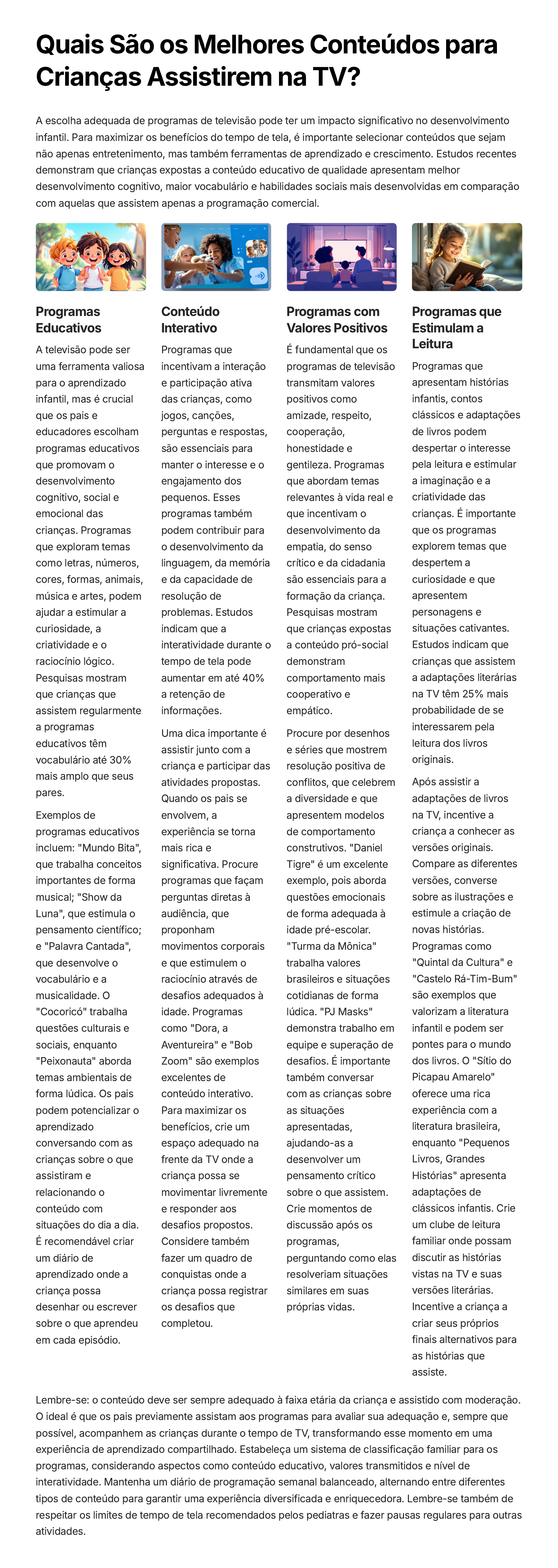 Quais São os Melhores Conteúdos para Crianças Assistirem na TV? A escolha adequada de programas de televisão pode ter um impacto significativo no desenvolvimento infantil. Para maximizar os benefícios do tempo de tela, é importante selecionar conteúdos que sejam não apenas entretenimento, mas também ferramentas de aprendizado e crescimento. Estudos recentes demonstram que crianças expostas a conteúdo educativo de qualidade apresentam melhor desenvolvimento cognitivo, maior vocabulário e habilidades sociais mais desenvolvidas em comparação com aquelas que assistem apenas a programação comercial. Programas Educativos A televisão pode ser uma ferramenta valiosa para o aprendizado infantil, mas é crucial que os pais e educadores escolham programas educativos que promovam o desenvolvimento cognitivo, social e emocional das crianças. Programas que exploram temas como letras, números, cores, formas, animais, música e artes, podem ajudar a estimular a curiosidade, a criatividade e o raciocínio lógico. Pesquisas mostram que crianças que assistem regularmente a programas educativos têm vocabulário até 30% mais amplo que seus pares. Exemplos de programas educativos incluem: "Mundo Bita", que trabalha conceitos importantes de forma musical; "Show da Luna", que estimula o pensamento científico; e "Palavra Cantada", que desenvolve o vocabulário e a musicalidade. O "Cocoricó" trabalha questões culturais e sociais, enquanto "Peixonauta" aborda temas ambientais de forma lúdica. Os pais podem potencializar o aprendizado conversando com as crianças sobre o que assistiram e relacionando o conteúdo com situações do dia a dia. É recomendável criar um diário de aprendizado onde a criança possa desenhar ou escrever sobre o que aprendeu em cada episódio. Conteúdo Interativo Programas que incentivam a interação e participação ativa das crianças, como jogos, canções, perguntas e respostas, são essenciais para manter o interesse e o engajamento dos pequenos. Esses programas também podem contribuir para o desenvolvimento da linguagem, da memória e da capacidade de resolução de problemas. Estudos indicam que a interatividade durante o tempo de tela pode aumentar em até 40% a retenção de informações. Uma dica importante é assistir junto com a criança e participar das atividades propostas. Quando os pais se envolvem, a experiência se torna mais rica e significativa. Procure programas que façam perguntas diretas à audiência, que proponham movimentos corporais e que estimulem o raciocínio através de desafios adequados à idade. Programas como "Dora, a Aventureira" e "Bob Zoom" são exemplos excelentes de conteúdo interativo. Para maximizar os benefícios, crie um espaço adequado na frente da TV onde a criança possa se movimentar livremente e responder aos desafios propostos. Considere também fazer um quadro de conquistas onde a criança possa registrar os desafios que completou. Programas com Valores Positivos É fundamental que os programas de televisão transmitam valores positivos como amizade, respeito, cooperação, honestidade e gentileza. Programas que abordam temas relevantes à vida real e que incentivam o desenvolvimento da empatia, do senso crítico e da cidadania são essenciais para a formação da criança. Pesquisas mostram que crianças expostas a conteúdo pró-social demonstram comportamento mais cooperativo e empático. Procure por desenhos e séries que mostrem resolução positiva de conflitos, que celebrem a diversidade e que apresentem modelos de comportamento construtivos. "Daniel Tigre" é um excelente exemplo, pois aborda questões emocionais de forma adequada à idade pré-escolar. "Turma da Mônica" trabalha valores brasileiros e situações cotidianas de forma lúdica. "PJ Masks" demonstra trabalho em equipe e superação de desafios. É importante também conversar com as crianças sobre as situações apresentadas, ajudando-as a desenvolver um pensamento crítico sobre o que assistem. Crie momentos de discussão após os programas, perguntando como elas resolveriam situações similares em suas próprias vidas. Programas que Estimulam a Leitura Programas que apresentam histórias infantis, contos clássicos e adaptações de livros podem despertar o interesse pela leitura e estimular a imaginação e a criatividade das crianças. É importante que os programas explorem temas que despertem a curiosidade e que apresentem personagens e situações cativantes. Estudos indicam que crianças que assistem a adaptações literárias na TV têm 25% mais probabilidade de se interessarem pela leitura dos livros originais. Após assistir a adaptações de livros na TV, incentive a criança a conhecer as versões originais. Compare as diferentes versões, converse sobre as ilustrações e estimule a criação de novas histórias. Programas como "Quintal da Cultura" e "Castelo Rá-Tim-Bum" são exemplos que valorizam a literatura infantil e podem ser pontes para o mundo dos livros. O "Sítio do Picapau Amarelo" oferece uma rica experiência com a literatura brasileira, enquanto "Pequenos Livros, Grandes Histórias" apresenta adaptações de clássicos infantis. Crie um clube de leitura familiar onde possam discutir as histórias vistas na TV e suas versões literárias. Incentive a criança a criar seus próprios finais alternativos para as histórias que assiste. Lembre-se: o conteúdo deve ser sempre adequado à faixa etária da criança e assistido com moderação. O ideal é que os pais previamente assistam aos programas para avaliar sua adequação e, sempre que possível, acompanhem as crianças durante o tempo de TV, transformando esse momento em uma experiência de aprendizado compartilhado. Estabeleça um sistema de classificação familiar para os programas, considerando aspectos como conteúdo educativo, valores transmitidos e nível de interatividade. Mantenha um diário de programação semanal balanceado, alternando entr