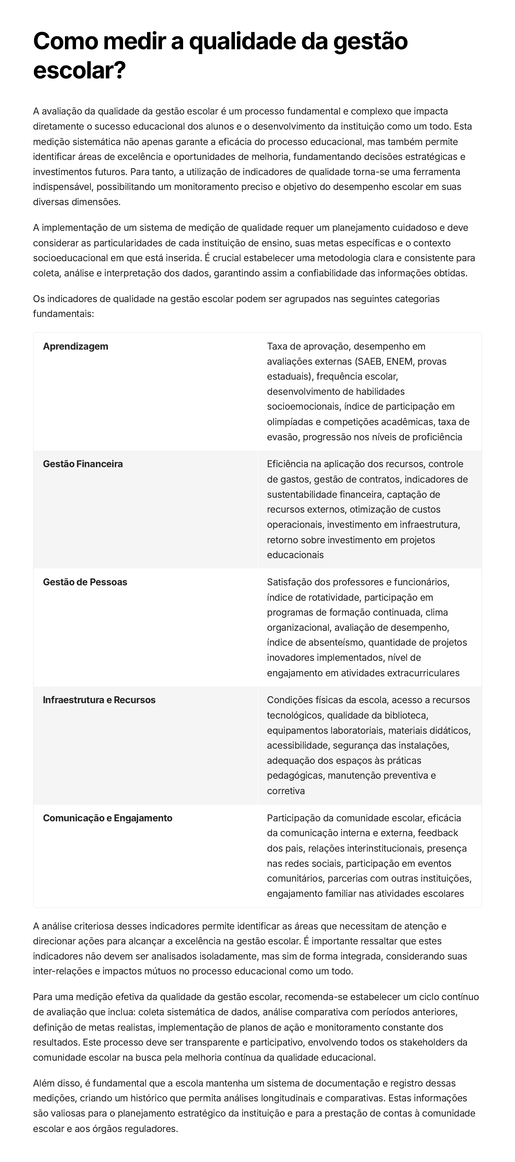 Como medir a qualidade da gestão escolar? A avaliação da qualidade da gestão escolar é um processo fundamental e complexo que impacta diretamente o sucesso educacional dos alunos e o desenvolvimento da instituição como um todo. Esta medição sistemática não apenas garante a eficácia do processo educacional, mas também permite identificar áreas de excelência e oportunidades de melhoria, fundamentando decisões estratégicas e investimentos futuros. Para tanto, a utilização de indicadores de qualidade torna-se uma ferramenta indispensável, possibilitando um monitoramento preciso e objetivo do desempenho escolar em suas diversas dimensões. A implementação de um sistema de medição de qualidade requer um planejamento cuidadoso e deve considerar as particularidades de cada instituição de ensino, suas metas específicas e o contexto socioeducacional em que está inserida. É crucial estabelecer uma metodologia clara e consistente para coleta, análise e interpretação dos dados, garantindo assim a confiabilidade das informações obtidas. Os indicadores de qualidade na gestão escolar podem ser agrupados nas seguintes categorias fundamentais: Aprendizagem Taxa de aprovação, desempenho em avaliações externas (SAEB, ENEM, provas estaduais), frequência escolar, desenvolvimento de habilidades socioemocionais, índice de participação em olimpíadas e competições acadêmicas, taxa de evasão, progressão nos níveis de proficiência Gestão Financeira Eficiência na aplicação dos recursos, controle de gastos, gestão de contratos, indicadores de sustentabilidade financeira, captação de recursos externos, otimização de custos operacionais, investimento em infraestrutura, retorno sobre investimento em projetos educacionais Gestão de Pessoas Satisfação dos professores e funcionários, índice de rotatividade, participação em programas de formação continuada, clima organizacional, avaliação de desempenho, índice de absenteísmo, quantidade de projetos inovadores implementados, nível de engajamento em atividades extracurriculares Infraestrutura e Recursos Condições físicas da escola, acesso a recursos tecnológicos, qualidade da biblioteca, equipamentos laboratoriais, materiais didáticos, acessibilidade, segurança das instalações, adequação dos espaços às práticas pedagógicas, manutenção preventiva e corretiva Comunicação e Engajamento Participação da comunidade escolar, eficácia da comunicação interna e externa, feedback dos pais, relações interinstitucionais, presença nas redes sociais, participação em eventos comunitários, parcerias com outras instituições, engajamento familiar nas atividades escolares A análise criteriosa desses indicadores permite identificar as áreas que necessitam de atenção e direcionar ações para alcançar a excelência na gestão escolar. É importante ressaltar que estes indicadores não devem ser analisados isoladamente, mas sim de forma integrada, considerando suas inter-relações e impactos mútuos no processo educacional como um todo. Para uma medição efetiva da qualidade da gestão escolar, recomenda-se estabelecer um ciclo contínuo de avaliação que inclua: coleta sistemática de dados, análise comparativa com períodos anteriores, definição de metas realistas, implementação de planos de ação e monitoramento constante dos resultados. Este processo deve ser transparente e participativo, envolvendo todos os stakeholders da comunidade escolar na busca pela melhoria contínua da qualidade educacional. Além disso, é fundamental que a escola mantenha um sistema de documentação e registro dessas medições, criando um histórico que permita análises longitudinais e comparativas. Estas informações são valiosas para o planejamento estratégico da instituição e para a prestação de contas à comunidade escolar e aos órgãos reguladores.