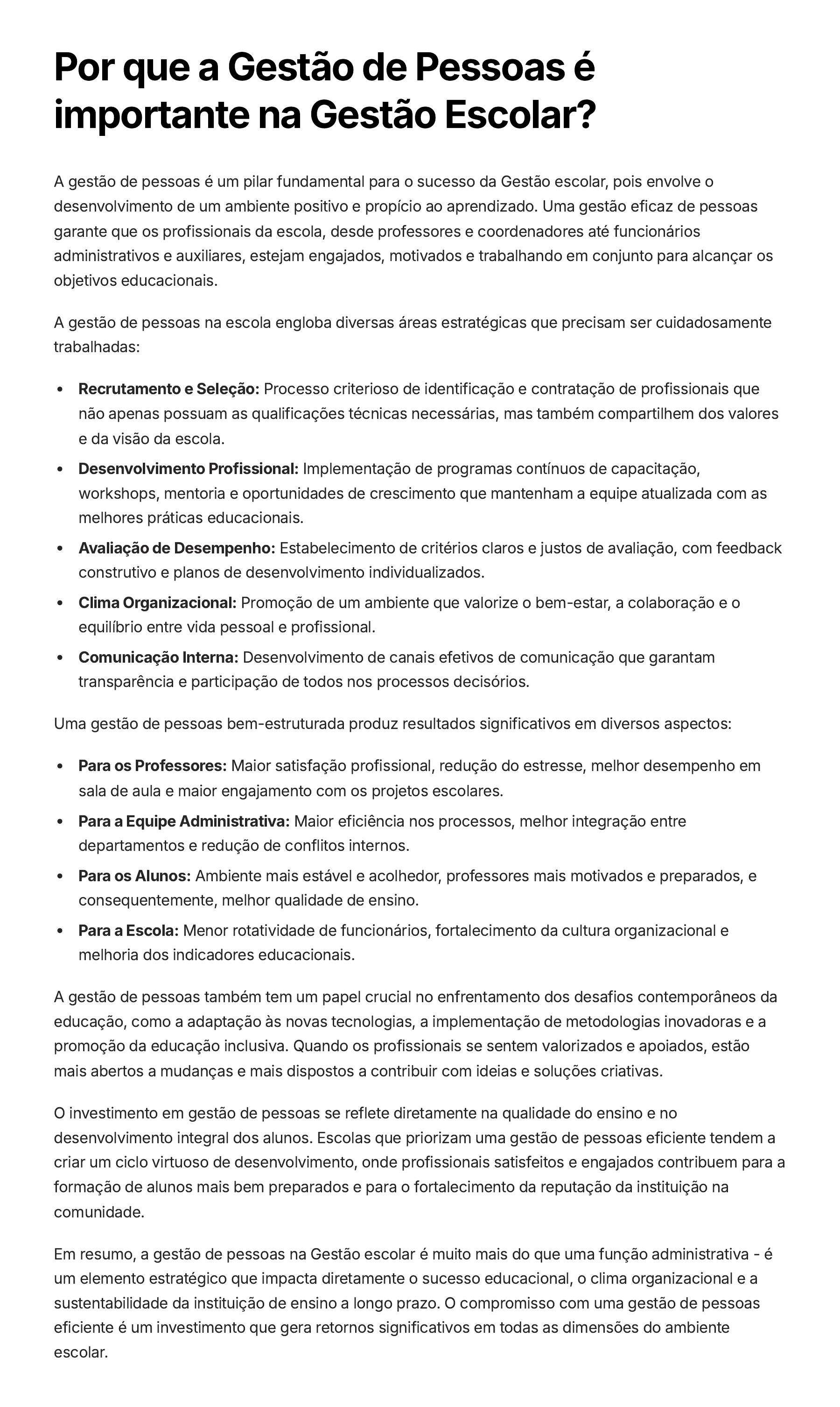 Por que a Gestão de Pessoas é importante na Gestão Escolar? A gestão de pessoas é um pilar fundamental para o sucesso da Gestão escolar, pois envolve o desenvolvimento de um ambiente positivo e propício ao aprendizado. Uma gestão eficaz de pessoas garante que os profissionais da escola, desde professores e coordenadores até funcionários administrativos e auxiliares, estejam engajados, motivados e trabalhando em conjunto para alcançar os objetivos educacionais. A gestão de pessoas na escola engloba diversas áreas estratégicas que precisam ser cuidadosamente trabalhadas: Recrutamento e Seleção: Processo criterioso de identificação e contratação de profissionais que não apenas possuam as qualificações técnicas necessárias, mas também compartilhem dos valores e da visão da escola. Desenvolvimento Profissional: Implementação de programas contínuos de capacitação, workshops, mentoria e oportunidades de crescimento que mantenham a equipe atualizada com as melhores práticas educacionais. Avaliação de Desempenho: Estabelecimento de critérios claros e justos de avaliação, com feedback construtivo e planos de desenvolvimento individualizados. Clima Organizacional: Promoção de um ambiente que valorize o bem-estar, a colaboração e o equilíbrio entre vida pessoal e profissional. Comunicação Interna: Desenvolvimento de canais efetivos de comunicação que garantam transparência e participação de todos nos processos decisórios. Uma gestão de pessoas bem-estruturada produz resultados significativos em diversos aspectos: Para os Professores: Maior satisfação profissional, redução do estresse, melhor desempenho em sala de aula e maior engajamento com os projetos escolares. Para a Equipe Administrativa: Maior eficiência nos processos, melhor integração entre departamentos e redução de conflitos internos. Para os Alunos: Ambiente mais estável e acolhedor, professores mais motivados e preparados, e consequentemente, melhor qualidade de ensino. Para a Escola: Menor rotatividade de funcionários, fortalecimento da cultura organizacional e melhoria dos indicadores educacionais. A gestão de pessoas também tem um papel crucial no enfrentamento dos desafios contemporâneos da educação, como a adaptação às novas tecnologias, a implementação de metodologias inovadoras e a promoção da educação inclusiva. Quando os profissionais se sentem valorizados e apoiados, estão mais abertos a mudanças e mais dispostos a contribuir com ideias e soluções criativas. O investimento em gestão de pessoas se reflete diretamente na qualidade do ensino e no desenvolvimento integral dos alunos. Escolas que priorizam uma gestão de pessoas eficiente tendem a criar um ciclo virtuoso de desenvolvimento, onde profissionais satisfeitos e engajados contribuem para a formação de alunos mais bem preparados e para o fortalecimento da reputação da instituição na comunidade. Em resumo, a gestão de pessoas na Gestão escolar é muito mais do que uma função administrativa - é um elemento estratégico que impacta diretamente o sucesso educacional, o clima organizacional e a sustentabilidade da instituição de ensino a longo prazo. O compromisso com uma gestão de pessoas eficiente é um investimento que gera retornos significativos em todas as dimensões do ambiente escolar.