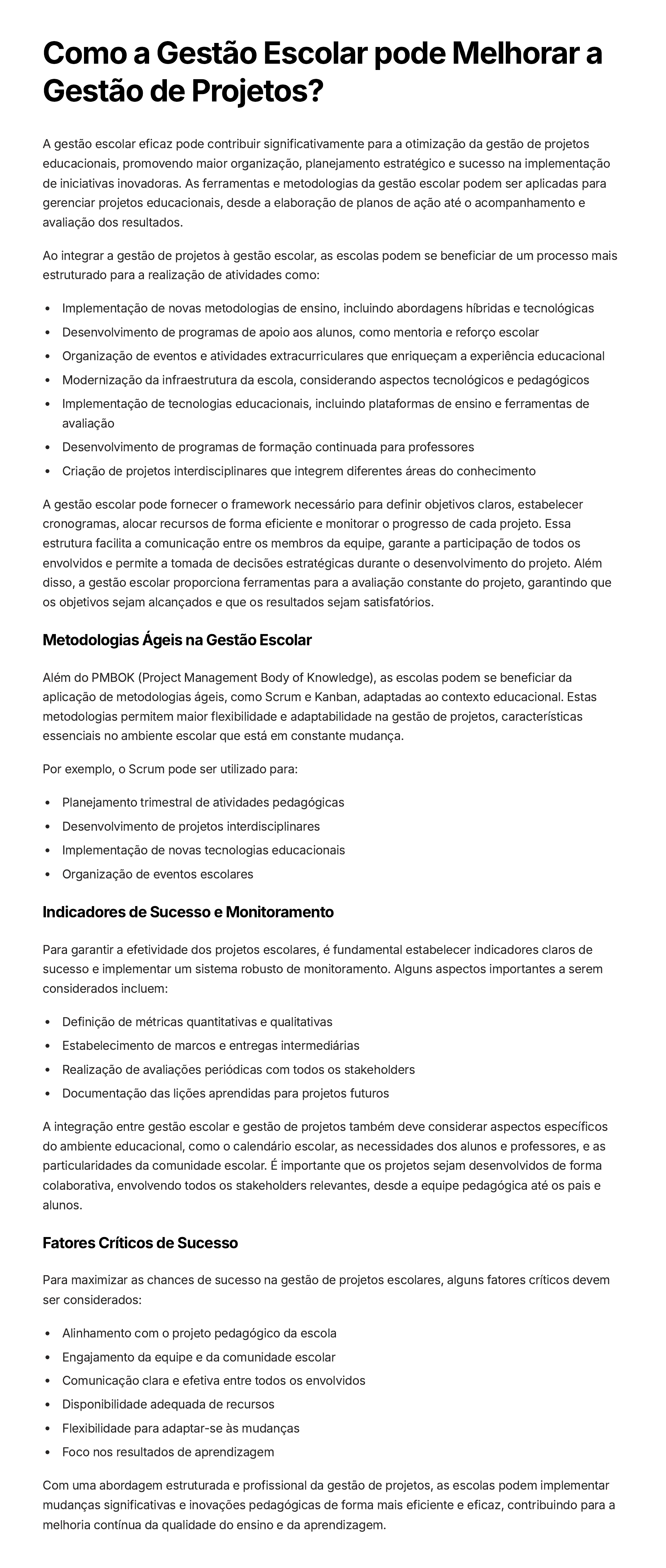 Como a Gestão Escolar pode Melhorar a Gestão de Projetos? A gestão escolar eficaz pode contribuir significativamente para a otimização da gestão de projetos educacionais, promovendo maior organização, planejamento estratégico e sucesso na implementação de iniciativas inovadoras. As ferramentas e metodologias da gestão escolar podem ser aplicadas para gerenciar projetos educacionais, desde a elaboração de planos de ação até o acompanhamento e avaliação dos resultados. Ao integrar a gestão de projetos à gestão escolar, as escolas podem se beneficiar de um processo mais estruturado para a realização de atividades como: Implementação de novas metodologias de ensino, incluindo abordagens híbridas e tecnológicas Desenvolvimento de programas de apoio aos alunos, como mentoria e reforço escolar Organização de eventos e atividades extracurriculares que enriqueçam a experiência educacional Modernização da infraestrutura da escola, considerando aspectos tecnológicos e pedagógicos Implementação de tecnologias educacionais, incluindo plataformas de ensino e ferramentas de avaliação Desenvolvimento de programas de formação continuada para professores Criação de projetos interdisciplinares que integrem diferentes áreas do conhecimento A gestão escolar pode fornecer o framework necessário para definir objetivos claros, estabelecer cronogramas, alocar recursos de forma eficiente e monitorar o progresso de cada projeto. Essa estrutura facilita a comunicação entre os membros da equipe, garante a participação de todos os envolvidos e permite a tomada de decisões estratégicas durante o desenvolvimento do projeto. Além disso, a gestão escolar proporciona ferramentas para a avaliação constante do projeto, garantindo que os objetivos sejam alcançados e que os resultados sejam satisfatórios. Metodologias Ágeis na Gestão Escolar Além do PMBOK (Project Management Body of Knowledge), as escolas podem se beneficiar da aplicação de metodologias ágeis, como Scrum e Kanban, adaptadas ao contexto educacional. Estas metodologias permitem maior flexibilidade e adaptabilidade na gestão de projetos, características essenciais no ambiente escolar que está em constante mudança. Por exemplo, o Scrum pode ser utilizado para: Planejamento trimestral de atividades pedagógicas Desenvolvimento de projetos interdisciplinares Implementação de novas tecnologias educacionais Organização de eventos escolares Indicadores de Sucesso e Monitoramento Para garantir a efetividade dos projetos escolares, é fundamental estabelecer indicadores claros de sucesso e implementar um sistema robusto de monitoramento. Alguns aspectos importantes a serem considerados incluem: Definição de métricas quantitativas e qualitativas Estabelecimento de marcos e entregas intermediárias Realização de avaliações periódicas com todos os stakeholders Documentação das lições aprendidas para projetos futuros A integração entre gestão escolar e gestão de projetos também deve considerar aspectos específicos do ambiente educacional, como o calendário escolar, as necessidades dos alunos e professores, e as particularidades da comunidade escolar. É importante que os projetos sejam desenvolvidos de forma colaborativa, envolvendo todos os stakeholders relevantes, desde a equipe pedagógica até os pais e alunos. Fatores Críticos de Sucesso Para maximizar as chances de sucesso na gestão de projetos escolares, alguns fatores críticos devem ser considerados: Alinhamento com o projeto pedagógico da escola Engajamento da equipe e da comunidade escolar Comunicação clara e efetiva entre todos os envolvidos Disponibilidade adequada de recursos Flexibilidade para adaptar-se às mudanças Foco nos resultados de aprendizagem Com uma abordagem estruturada e profissional da gestão de projetos, as escolas podem implementar mudanças significativas e inovações pedagógicas de forma mais eficiente e eficaz, contribuindo para a melhoria contínua da qualidade do ensino e da aprendizagem.