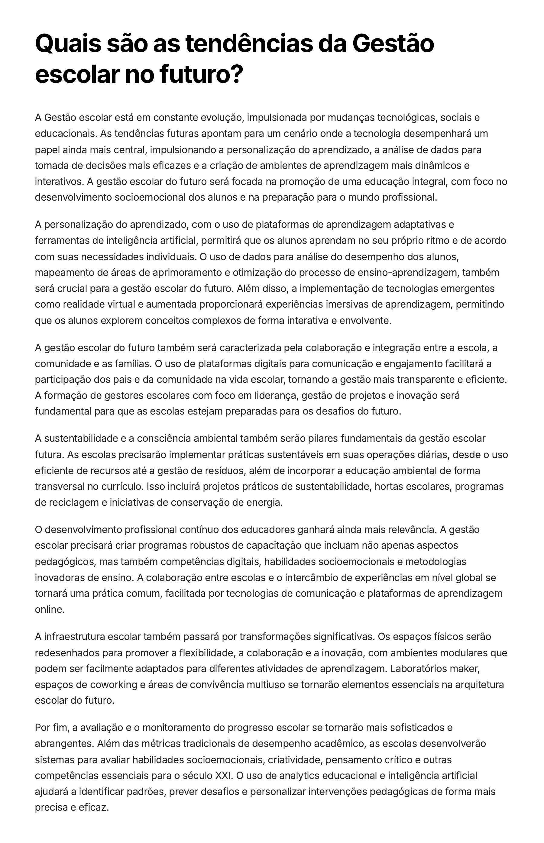 Quais são as tendências da Gestão escolar no futuro? A Gestão escolar está em constante evolução, impulsionada por mudanças tecnológicas, sociais e educacionais. As tendências futuras apontam para um cenário onde a tecnologia desempenhará um papel ainda mais central, impulsionando a personalização do aprendizado, a análise de dados para tomada de decisões mais eficazes e a criação de ambientes de aprendizagem mais dinâmicos e interativos. A gestão escolar do futuro será focada na promoção de uma educação integral, com foco no desenvolvimento socioemocional dos alunos e na preparação para o mundo profissional. A personalização do aprendizado, com o uso de plataformas de aprendizagem adaptativas e ferramentas de inteligência artificial, permitirá que os alunos aprendam no seu próprio ritmo e de acordo com suas necessidades individuais. O uso de dados para análise do desempenho dos alunos, mapeamento de áreas de aprimoramento e otimização do processo de ensino-aprendizagem, também será crucial para a gestão escolar do futuro. Além disso, a implementação de tecnologias emergentes como realidade virtual e aumentada proporcionará experiências imersivas de aprendizagem, permitindo que os alunos explorem conceitos complexos de forma interativa e envolvente. A gestão escolar do futuro também será caracterizada pela colaboração e integração entre a escola, a comunidade e as famílias. O uso de plataformas digitais para comunicação e engajamento facilitará a participação dos pais e da comunidade na vida escolar, tornando a gestão mais transparente e eficiente. A formação de gestores escolares com foco em liderança, gestão de projetos e inovação será fundamental para que as escolas estejam preparadas para os desafios do futuro. A sustentabilidade e a consciência ambiental também serão pilares fundamentais da gestão escolar futura. As escolas precisarão implementar práticas sustentáveis em suas operações diárias, desde o uso eficiente de recursos até a gestão de resíduos, além de incorporar a educação ambiental de forma transversal no currículo. Isso incluirá projetos práticos de sustentabilidade, hortas escolares, programas de reciclagem e iniciativas de conservação de energia. O desenvolvimento profissional contínuo dos educadores ganhará ainda mais relevância. A gestão escolar precisará criar programas robustos de capacitação que incluam não apenas aspectos pedagógicos, mas também competências digitais, habilidades socioemocionais e metodologias inovadoras de ensino. A colaboração entre escolas e o intercâmbio de experiências em nível global se tornará uma prática comum, facilitada por tecnologias de comunicação e plataformas de aprendizagem online. A infraestrutura escolar também passará por transformações significativas. Os espaços físicos serão redesenhados para promover a flexibilidade, a colaboração e a inovação, com ambientes modulares que podem ser facilmente adaptados para diferentes atividades de aprendizagem. Laboratórios maker, espaços de coworking e áreas de convivência multiuso se tornarão elementos essenciais na arquitetura escolar do futuro. Por fim, a avaliação e o monitoramento do progresso escolar se tornarão mais sofisticados e abrangentes. Além das métricas tradicionais de desempenho acadêmico, as escolas desenvolverão sistemas para avaliar habilidades socioemocionais, criatividade, pensamento crítico e outras competências essenciais para o século XXI. O uso de analytics educacional e inteligência artificial ajudará a identificar padrões, prever desafios e personalizar intervenções pedagógicas de forma mais precisa e eficaz.