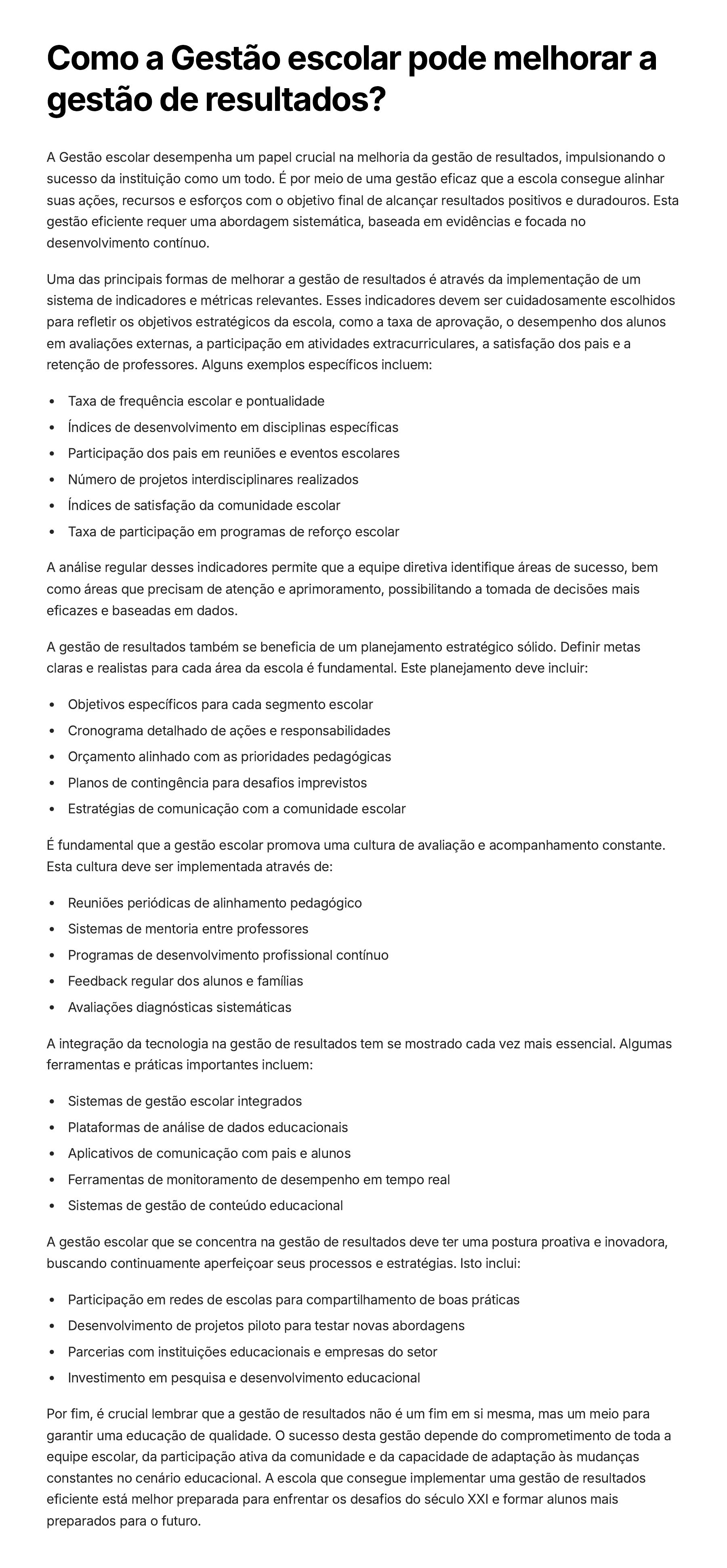 Como a Gestão escolar pode melhorar a gestão de resultados? A Gestão escolar desempenha um papel crucial na melhoria da gestão de resultados, impulsionando o sucesso da instituição como um todo. É por meio de uma gestão eficaz que a escola consegue alinhar suas ações, recursos e esforços com o objetivo final de alcançar resultados positivos e duradouros. Esta gestão eficiente requer uma abordagem sistemática, baseada em evidências e focada no desenvolvimento contínuo. Uma das principais formas de melhorar a gestão de resultados é através da implementação de um sistema de indicadores e métricas relevantes. Esses indicadores devem ser cuidadosamente escolhidos para refletir os objetivos estratégicos da escola, como a taxa de aprovação, o desempenho dos alunos em avaliações externas, a participação em atividades extracurriculares, a satisfação dos pais e a retenção de professores. Alguns exemplos específicos incluem: Taxa de frequência escolar e pontualidade Índices de desenvolvimento em disciplinas específicas Participação dos pais em reuniões e eventos escolares Número de projetos interdisciplinares realizados Índices de satisfação da comunidade escolar Taxa de participação em programas de reforço escolar A análise regular desses indicadores permite que a equipe diretiva identifique áreas de sucesso, bem como áreas que precisam de atenção e aprimoramento, possibilitando a tomada de decisões mais eficazes e baseadas em dados. A gestão de resultados também se beneficia de um planejamento estratégico sólido. Definir metas claras e realistas para cada área da escola é fundamental. Este planejamento deve incluir: Objetivos específicos para cada segmento escolar Cronograma detalhado de ações e responsabilidades Orçamento alinhado com as prioridades pedagógicas Planos de contingência para desafios imprevistos Estratégias de comunicação com a comunidade escolar É fundamental que a gestão escolar promova uma cultura de avaliação e acompanhamento constante. Esta cultura deve ser implementada através de: Reuniões periódicas de alinhamento pedagógico Sistemas de mentoria entre professores Programas de desenvolvimento profissional contínuo Feedback regular dos alunos e famílias Avaliações diagnósticas sistemáticas A integração da tecnologia na gestão de resultados tem se mostrado cada vez mais essencial. Algumas ferramentas e práticas importantes incluem: Sistemas de gestão escolar integrados Plataformas de análise de dados educacionais Aplicativos de comunicação com pais e alunos Ferramentas de monitoramento de desempenho em tempo real Sistemas de gestão de conteúdo educacional A gestão escolar que se concentra na gestão de resultados deve ter uma postura proativa e inovadora, buscando continuamente aperfeiçoar seus processos e estratégias. Isto inclui: Participação em redes de escolas para compartilhamento de boas práticas Desenvolvimento de projetos piloto para testar novas abordagens Parcerias com instituições educacionais e empresas do setor Investimento em pesquisa e desenvolvimento educacional Por fim, é crucial lembrar que a gestão de resultados não é um fim em si mesma, mas um meio para garantir uma educação de qualidade. O sucesso desta gestão depende do comprometimento de toda a equipe escolar, da participação ativa da comunidade e da capacidade de adaptação às mudanças constantes no cenário educacional. A escola que consegue implementar uma gestão de resultados eficiente está melhor preparada para enfrentar os desafios do século XXI e formar alunos mais preparados para o futuro.
