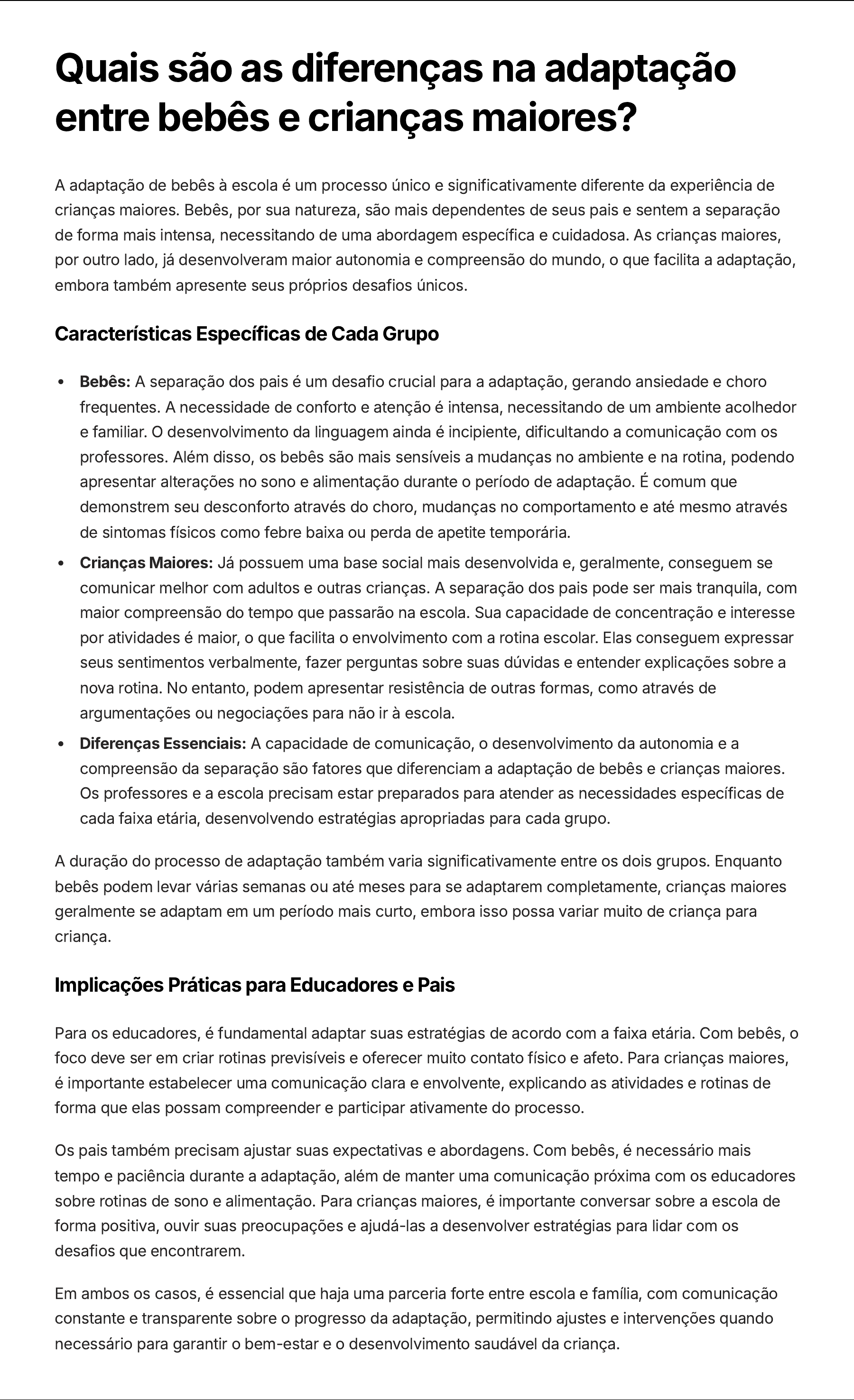 Quais são as diferenças na adaptação entre bebês e crianças maiores? A adaptação de bebês à escola é um processo único e significativamente diferente da experiência de crianças maiores. Bebês, por sua natureza, são mais dependentes de seus pais e sentem a separação de forma mais intensa, necessitando de uma abordagem específica e cuidadosa. As crianças maiores, por outro lado, já desenvolveram maior autonomia e compreensão do mundo, o que facilita a adaptação, embora também apresente seus próprios desafios únicos. Características Específicas de Cada Grupo Bebês: A separação dos pais é um desafio crucial para a adaptação, gerando ansiedade e choro frequentes. A necessidade de conforto e atenção é intensa, necessitando de um ambiente acolhedor e familiar. O desenvolvimento da linguagem ainda é incipiente, dificultando a comunicação com os professores. Além disso, os bebês são mais sensíveis a mudanças no ambiente e na rotina, podendo apresentar alterações no sono e alimentação durante o período de adaptação. É comum que demonstrem seu desconforto através do choro, mudanças no comportamento e até mesmo através de sintomas físicos como febre baixa ou perda de apetite temporária. Crianças Maiores: Já possuem uma base social mais desenvolvida e, geralmente, conseguem se comunicar melhor com adultos e outras crianças. A separação dos pais pode ser mais tranquila, com maior compreensão do tempo que passarão na escola. Sua capacidade de concentração e interesse por atividades é maior, o que facilita o envolvimento com a rotina escolar. Elas conseguem expressar seus sentimentos verbalmente, fazer perguntas sobre suas dúvidas e entender explicações sobre a nova rotina. No entanto, podem apresentar resistência de outras formas, como através de argumentações ou negociações para não ir à escola. Diferenças Essenciais: A capacidade de comunicação, o desenvolvimento da autonomia e a compreensão da separação são fatores que diferenciam a adaptação de bebês e crianças maiores. Os professores e a escola precisam estar preparados para atender as necessidades específicas de cada faixa etária, desenvolvendo estratégias apropriadas para cada grupo. A duração do processo de adaptação também varia significativamente entre os dois grupos. Enquanto bebês podem levar várias semanas ou até meses para se adaptarem completamente, crianças maiores geralmente se adaptam em um período mais curto, embora isso possa variar muito de criança para criança. Implicações Práticas para Educadores e Pais Para os educadores, é fundamental adaptar suas estratégias de acordo com a faixa etária. Com bebês, o foco deve ser em criar rotinas previsíveis e oferecer muito contato físico e afeto. Para crianças maiores, é importante estabelecer uma comunicação clara e envolvente, explicando as atividades e rotinas de forma que elas possam compreender e participar ativamente do processo. Os pais também precisam ajustar suas expectativas e abordagens. Com bebês, é necessário mais tempo e paciência durante a adaptação, além de manter uma comunicação próxima com os educadores sobre rotinas de sono e alimentação. Para crianças maiores, é importante conversar sobre a escola de forma positiva, ouvir suas preocupações e ajudá-las a desenvolver estratégias para lidar com os desafios que encontrarem. Em ambos os casos, é essencial que haja uma parceria forte entre escola e família, com comunicação constante e transparente sobre o progresso da adaptação, permitindo ajustes e intervenções quando necessário para garantir o bem-estar e o desenvolvimento saudável da criança.