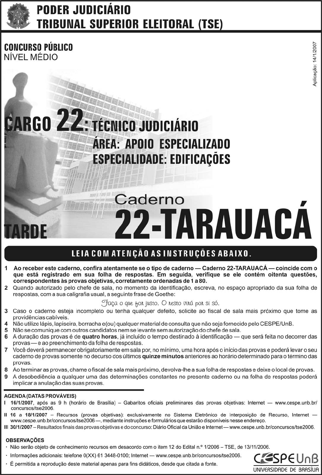 UnB/CESPE – TSE Caderno 22-TARAUACÁ Cargo 22: Técnico Judiciário – Área: Apoio Especializado – Especialidade: Edificações – 1 – • Nas questões de 1 a 80, marque, em cada uma, a única opção correta, de acordo com o respectivo comando. Para as devidas marcações, use a folha de respostas, único documento válido para a correção das suas provas. • Nas questões que avaliam Noções de Informática, a menos que seja explicitamente informado o contrário, considere que todos os programas mencionados estão em configuração-padrão em português, que o mouse está configurado para pessoas destras e que expressões como clicar, clique simples e clique duplo referem-se a cliques com o botão esquerdo do mouse. Considere também que não há restrições de proteção, de funcionamento e de uso em relação aos programas, arquivos, diretórios e equipamentos mencionados. CONHECIMENTOS BÁSICOS Texto para as questões 1 e 2 Geralmente, as oposições não gostam dos governos.1 Partido vencido contesta a eleição do vencedor, e partido vencedor é simultaneamente vencido, e vice-versa. Tentam-se acordos, dividindo os deputados; mas ninguém aceita4 minorias. No antigo regímen iniciou-se uma representação de minorias, para dar nas câmaras um recanto ao partido que estava de baixo. Não pegou bem — ou porque a porcentagem7 era pequena — ou porque a planta não tinha força bastante. Continuou praticamente o sistema da lavra única. (...) Sócrates aconselhava ao legislador que quando10 houvesse de legislar tivesse em vista a terra e os homens. Ora, os homens aqui amam o governo e a tribuna, gostam de propor, votar, discutir, atacar, defender e os demais verbos, e13 o partido que não folheia a gramática política acha naturalmente que já não há sintaxe; ao contrário, o que tem a gramática na mão julga a linguagem alheia obsoleta e16 corrupta. O que estamos vendo é a impressão em dous exemplares da mesma gramática. Machado de Assis. A Semana. Obra completa, v. III. Rio de Janeiro: Aguilar, 1973, p. 652-3. QUESTÃO 1 Em relação ao texto, assinale a opção correta. A A substituição de “Tentam-se” (R.3) por São tentados prejudica a correção gramatical do período. B Se os travessões das linhas 7 e 8 forem substituídos por vírgulas, o período fica incorreto. C As palavras “planta” (R.8) e “lavra” (R.9) constituem um jogo metafórico de idéias. D O emprego do subjuntivo em “quando houvesse” (R.10-11) justifica-se por compor uma afirmativa sobre uma ação já decorrida. QUESTÃO 2 Com referência ao texto, assinale a opção correta. A Na linha 13, o emprego de vírgulas após “propor”, “votar”, “discutir” e “atacar” justifica-se por isolar expressões de natureza apositiva. B As expressões “folheia a gramática política” (R.14) e “tem a gramática na mão” (R.15-16) estão sendo empregadas em sentido denotativo. C Pelos sentidos do texto, partidos de oposição e de situação têm estratégias completamente diferentes de ação. D O emprego da primeira pessoa do plural em “estamos vendo” (R.17) inclui o leitor nas afirmações do período. QUESTÃO 3 A função da oposição em uma sociedade democrática1 consiste em denunciar a corrupção, acompanhar as investigações e avaliar os projetos e iniciativas governamentais, propondo alternativas. A crítica, e não a4 adesão, é sua tarefa primordial. Se uma sociedade cessa de ter uma verdadeira oposição, ela caminha para uma solução autoritária. A governabilidade só existe verdadeiramente com7 uma oposição atuante, que sinalize os problemas existentes e discuta os seus encaminhamentos. Denis Lerrer Rosenfield. O Globo, 27/11/2006, p. 7 (com adaptações). Em relação ao texto acima, assinale a opção correta. A O autor do texto defende uma oposição atuante em relação às posições do governo. B Na linha 6, o pronome “ela” refere-se a “verdadeira oposição”. C Entre os dois últimos períodos do texto, subentende-se uma relação sintática que pode ser expressa por Entretanto. D O emprego do subjuntivo em “sinalize” (R.8) e “discuta” (R.9) justifica-se por compor um período de natureza explicativa. UnB/CESPE – TSE Caderno 22-TARAUACÁ Cargo 22: Técnico Judiciário – Área: Apoio Especializado – Especialidade: Edificações – 2 – QUESTÃO 4 Uma sociedade democrática vive de suas clivagens,1 que têm como fundamento o respeito ao pluralismo político. Cada partido tem o direito de fazer suas próprias propostas, procurando mostrar para a opinião pública a sua viabilidade,4 a sua pertinência e a sua importância. Ela se alimenta, também, dos consensos que consegue estabelecer sobre algumas grandes questões nacionais, as que possibilitam7 precisamente que o país adote uma rota de crescimento econômico, desenvolvimento social e pleno respeito à liberdade.10 Idem, ibidem. Em relação ao texto acima, assinale a opção incorreta. A A forma verbal “têm” (R.2) refere-se a “clivagens” (R.1). B A palavra “clivagens” (R.1) está sendo empregada com o sentido de convergências, uniões. C O pronome “Ela” (R.5) refere-se a “sociedade democrática” (R.1). D O emprego de vírgula após “econômico” (R.9) justifica-se por separar elementos de mesma função gramatical componentes de uma enumeração. QUESTÃO 5 Como seus antecessores Adam Smith, Karl Marx e1 John Maynard Keynes, o norte-americano Milton Friedman foi um dos mais influentes economistas de todos os tempos. Recebeu a John Bates Clark Medal (1951) e o Prêmio Nobel4 de Economia (1976), as duas mais importantes condecorações acadêmicas concedidas por significativa contribuição ao conhecimento científico.7 Em seu clássico A Metodologia da Ciência Econômica (1953), tornou clara a diferença entre ciência econômica e economia política. A primeira seria formada por10 hipóteses empiricamente refutáveis, enquanto a segu