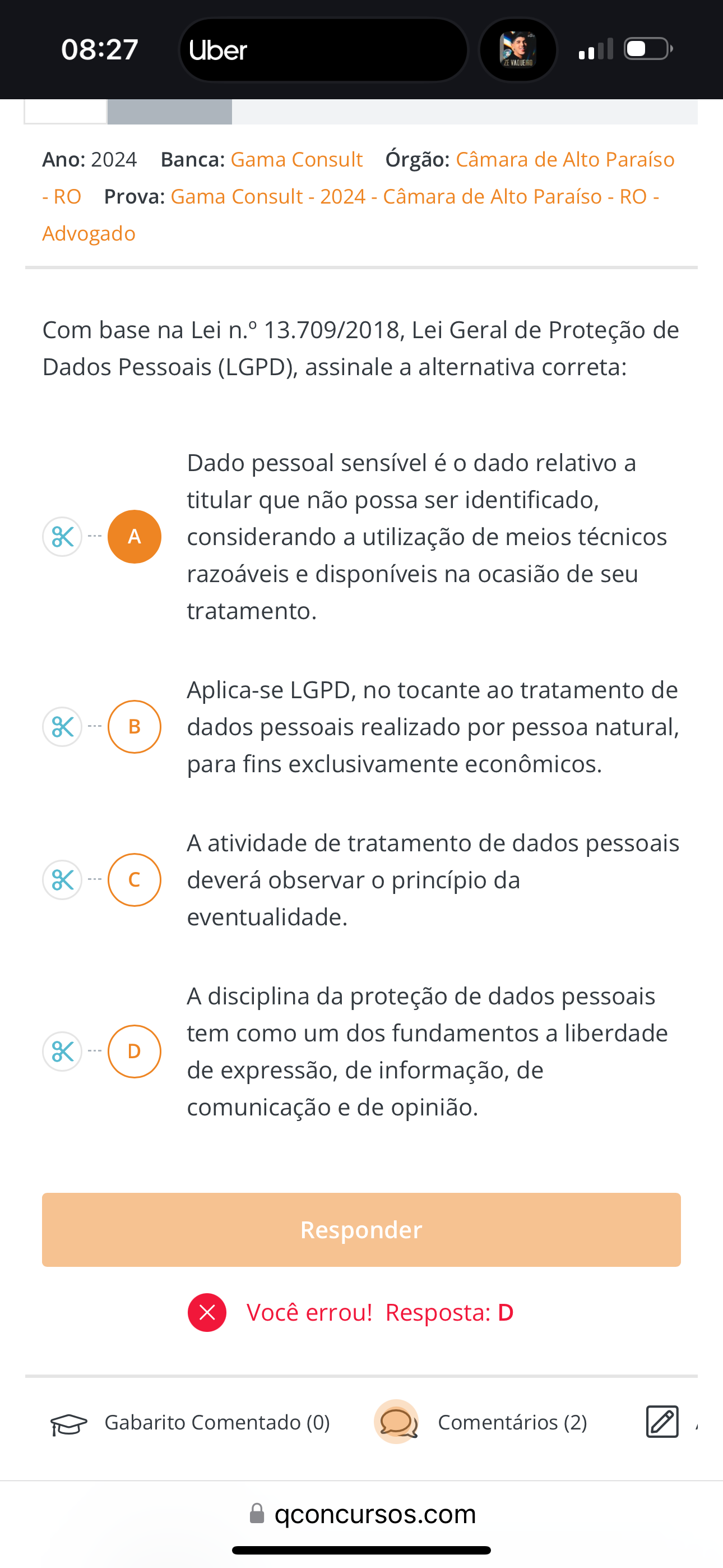 08:27 Uber VAQUEIRO Ano: 2024 Banca: Gama Consult Órgão: Câmara de Alto Paraíso - RO Prova: Gama Consult - 2024 - Câmara de Alto Paraíso - RO - Advogado Com base na Lei 13.709/2018, Lei Geral de Proteção de Dados Pessoais (LGPD), assinale a alternativa correta: Dado pessoal sensível é o dado relativo a titular que não possa ser identificado, A considerando a utilização de meios técnicos razoáveis e disponíveis na ocasião de seu tratamento. Aplica-se LGPD, no tocante ao tratamento de K B dados pessoais realizado por pessoa natural, para fins exclusivamente econômicos. A atividade de tratamento de dados pessoais C deverá observar o princípio da eventualidade. A disciplina da proteção de dados pessoais tem como um dos fundamentos a liberdade D de expressão, de informação, de comunicação e de opinião. Responder X Você errou! Resposta: D Gabarito Comentado (0) Comentários (2) qconcursos.com