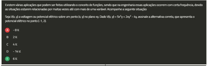 Existem aplicações que podem ser feitas utilizando O conceito de funções, sendo que na engenharia essas aplicações ocorrem com certa frequência, devido as situações estarem relacionadas por muitas vezes até com mais de uma Acompanhe a seguinte situação: Seja a voltagem ou potencial elétrico sobre um ponto y) no plano xy. Dado assinale a alternativa correta, que apresenta potencial elétrico no ponto (-1,2) A 2V. 4V. D E 6V.