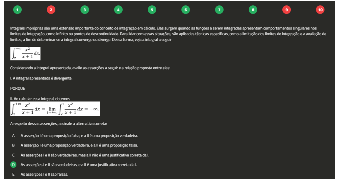 1 2 3 S 7 10 Integrais são uma extensão importante do conceito de integração em cálculo Elas surgem quando as funções a serem integradas apresentam comportamentos singulares nos limites de integração, como infinito ou pontos de Para lidar com essas situações, aplicadas como a limitação dos limites de integração e a avaliação de limites, a fim determinar a integral converge Dessa a integral a seguir dx x + 1 Consider ando a integral avalie as a seguir relação proposta entre apresentada e PORQUE Ao calcular essa integral, obtemos + + dx = lim + 1 dx = - 2 A respeito dessas assinale alternativa A A A uma proposição falsa, ea II A uma proposição A uma proposição e all uma proposição falsa As asserções II são verdadeiras, mas a não uma justificativa correta da I D As asserções I e II são verdadeiras, eall uma justificativa correta da E As asserções I e II são