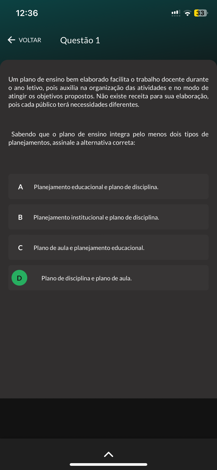 12:36 33 VOLTAR Questão 1 Um plano de ensino bem elaborado facilita trabalho docente durante ano letivo, pois auxilia na organização das atividades e no modo de atingir os objetivos propostos. Não existe receita para sua elaboração, pois cada público terá necessidades diferentes. Sabendo que plano de ensino integra pelo menos dois tipos de planejamentos, assinale a alternativa correta: A Planejamento educacional e plano de disciplina. Planejamento institucional e plano de disciplina. Plano de aula e planejamento educacional. D Plano de disciplina e plano de aula.