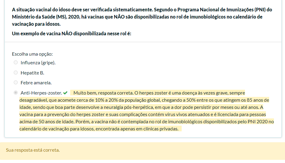 A situação vacinal do idoso deve ser verificada sistematicamente. Segundo Programa Nacional de Imunizações (PNI) do Ministério da Saúde (MS), 2020, há vacinas que NÃO são disponibilizadas no rol de imunobiológicos no calendário de vacinação para idosos. Um exemplo de vacina NÃO disponibilizada nesse rol é: Escolha uma opção: Influenza (gripe). Hepatite B. Febre amarela. Muito resposta correta. herpes zoster é uma doença às vezes grave, sempre desagradável, que acomete cerca de 10% a 20% da população global, chegando a 50% entre os que atingem os 85 anos de idade, sendo que boa parte desenvolve a neuralgia pós-herpética, em que a dor pode persistir por meses ou até anos. A vacina para a prevenção do herpes e suas complicações contém vírus vivos atenuados e é licenciada para pessoas acima de 50 anos de idade. Porém, a vacina não é contemplada no rol de imunobiológicos disponibilizados pelo PNI 2020 no calendário de vacinação para idosos, encontrada apenas em clínicas privadas. Sua resposta está correta.