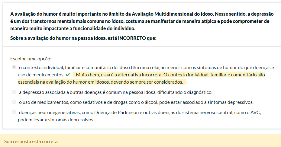 A avaliação do humor é muito importante no âmbito da Avaliação Multidimensional do Idoso. Nesse sentido, a depressão é um dos transtornos mentais mais comuns no idoso, costuma se manifestar de maneira e pode comprometer de maneira muito impactante a funcionalidade do indivíduo. Sobre a avaliação do humor na pessoa idosa, está INCORRETO que: Escolha uma opção: contexto individual, familiar e comunitário do idoso têm uma relação menor com os sintomas de humor do que doenças e uso de medicamentos. Muito bem, essa é a alternativa incorreta. contexto individual, familiar e comunitário são essenciais na avaliação do humor em idosos, devendo sempre ser considerados. a depressão associada a outras doenças é comum na pessoa idosa, dificultando diagnóstico. uso de como sedativos e de drogas como pode estar associado a sintomas depressivos. doenças neurodegenerativas, como Doença de Parkinson e outras doenças do sistema nervoso central, como AVC, podem a sintomas depressivos. Sua resposta está correta.