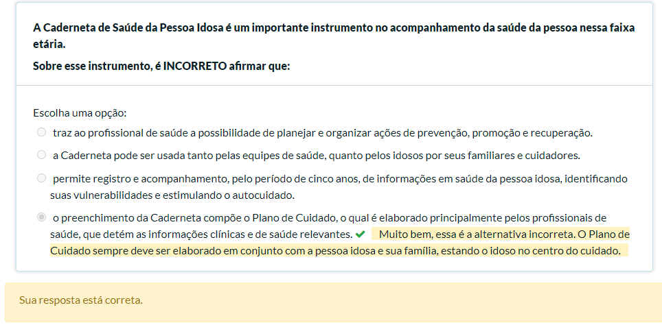 A Caderneta de Saúde da Pessoa Idosa é um importante instrumento no acompanhamento da saúde da pessoa nessa faixa etária. Sobre esse instrumento, é INCORRETO afirmar que: Escolha uma opção: traz ao profissional de saúde a possibilidade de e organizar ações de prevenção, promoção e recuperação. a Caderneta pode ser usada tanto pelas equipes de saúde, quanto pelos idosos por seus familiares e cuidadores. permite registro e acompanhamento, pelo período de cinco anos, de informações em saúde da pessoa idosa, identificando suas vulnerabilidades e estimulando autocuidado. preenchimento da Caderneta compõe Plano de Cuidado, qual é elaborado principalmente pelos profissionais de saúde, que detém as informações clínicas e de saúde relevantes. Muito bem, essa é a alternativa incorreta. Plano de Cuidado sempre deve ser elaborado em conjunto com a pessoa idosa e sua família, estando idoso no centro do cuidado. Sua resposta está correta.