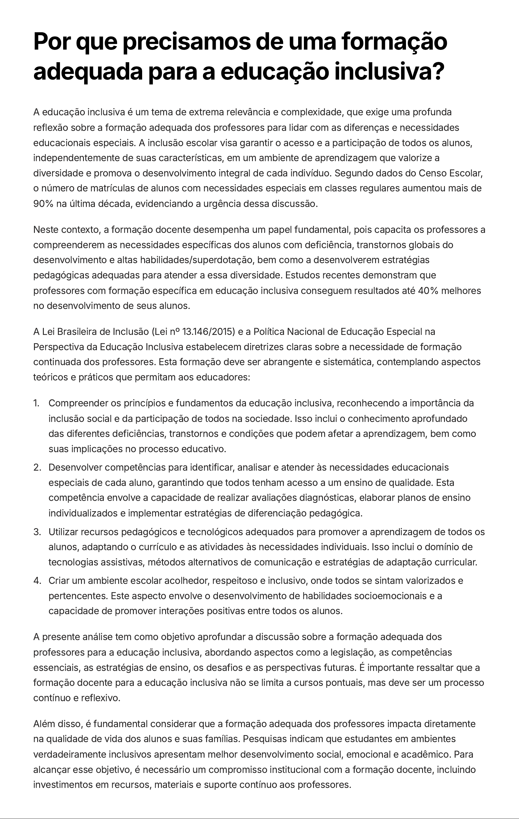 Por que precisamos de uma formação adequada para a educação inclusiva? A educação inclusiva é um tema de extrema relevância e complexidade, que exige uma profunda reflexão sobre a formação adequada dos professores para lidar com as diferenças e necessidades educacionais especiais. A inclusão escolar visa garantir o acesso e a participação de todos os alunos, independentemente de suas características, em um ambiente de aprendizagem que valorize a diversidade e promova o desenvolvimento integral de cada indivíduo. Segundo dados do Censo Escolar, o número de matrículas de alunos com necessidades especiais em classes regulares aumentou mais de 90% na última década, evidenciando a urgência dessa discussão. Neste contexto, a formação docente desempenha um papel fundamental, pois capacita os professores a compreenderem as necessidades específicas dos alunos com deficiência, transtornos globais do desenvolvimento e altas habilidades/superdotação, bem como a desenvolverem estratégias pedagógicas adequadas para atender a essa diversidade. Estudos recentes demonstram que professores com formação específica em educação inclusiva conseguem resultados até 40% melhores no desenvolvimento de seus alunos. A Lei Brasileira de Inclusão (Lei nº 13.146/2015) e a Política Nacional de Educação Especial na Perspectiva da Educação Inclusiva estabelecem diretrizes claras sobre a necessidade de formação continuada dos professores. Esta formação deve ser abrangente e sistemática, contemplando aspectos teóricos e práticos que permitam aos educadores: Compreender os princípios e fundamentos da educação inclusiva, reconhecendo a importância da inclusão social e da participação de todos na sociedade. Isso inclui o conhecimento aprofundado das diferentes deficiências, transtornos e condições que podem afetar a aprendizagem, bem como suas implicações no processo educativo. 1. Desenvolver competências para identificar, analisar e atender às necessidades educacionais especiais de cada aluno, garantindo que todos tenham acesso a um ensino de qualidade. Esta competência envolve a capacidade de realizar avaliações diagnósticas, elaborar planos de ensino individualizados e implementar estratégias de diferenciação pedagógica. 2. Utilizar recursos pedagógicos e tecnológicos adequados para promover a aprendizagem de todos os alunos, adaptando o currículo e as atividades às necessidades individuais. Isso inclui o domínio de tecnologias assistivas, métodos alternativos de comunicação e estratégias de adaptação curricular. 3. Criar um ambiente escolar acolhedor, respeitoso e inclusivo, onde todos se sintam valorizados e pertencentes. Este aspecto envolve o desenvolvimento de habilidades socioemocionais e a capacidade de promover interações positivas entre todos os alunos. 4. A presente análise tem como objetivo aprofundar a discussão sobre a formação adequada dos professores para a educação inclusiva, abordando aspectos como a legislação, as competências essenciais, as estratégias de ensino, os desafios e as perspectivas futuras. É importante ressaltar que a formação docente para a educação inclusiva não se limita a cursos pontuais, mas deve ser um processo contínuo e reflexivo. Além disso, é fundamental considerar que a formação adequada dos professores impacta diretamente na qualidade de vida dos alunos e suas famílias. Pesquisas indicam que estudantes em ambientes verdadeiramente inclusivos apresentam melhor desenvolvimento social, emocional e acadêmico. Para alcançar esse objetivo, é necessário um compromisso institucional com a formação docente, incluindo investimentos em recursos, materiais e suporte contínuo aos professores.