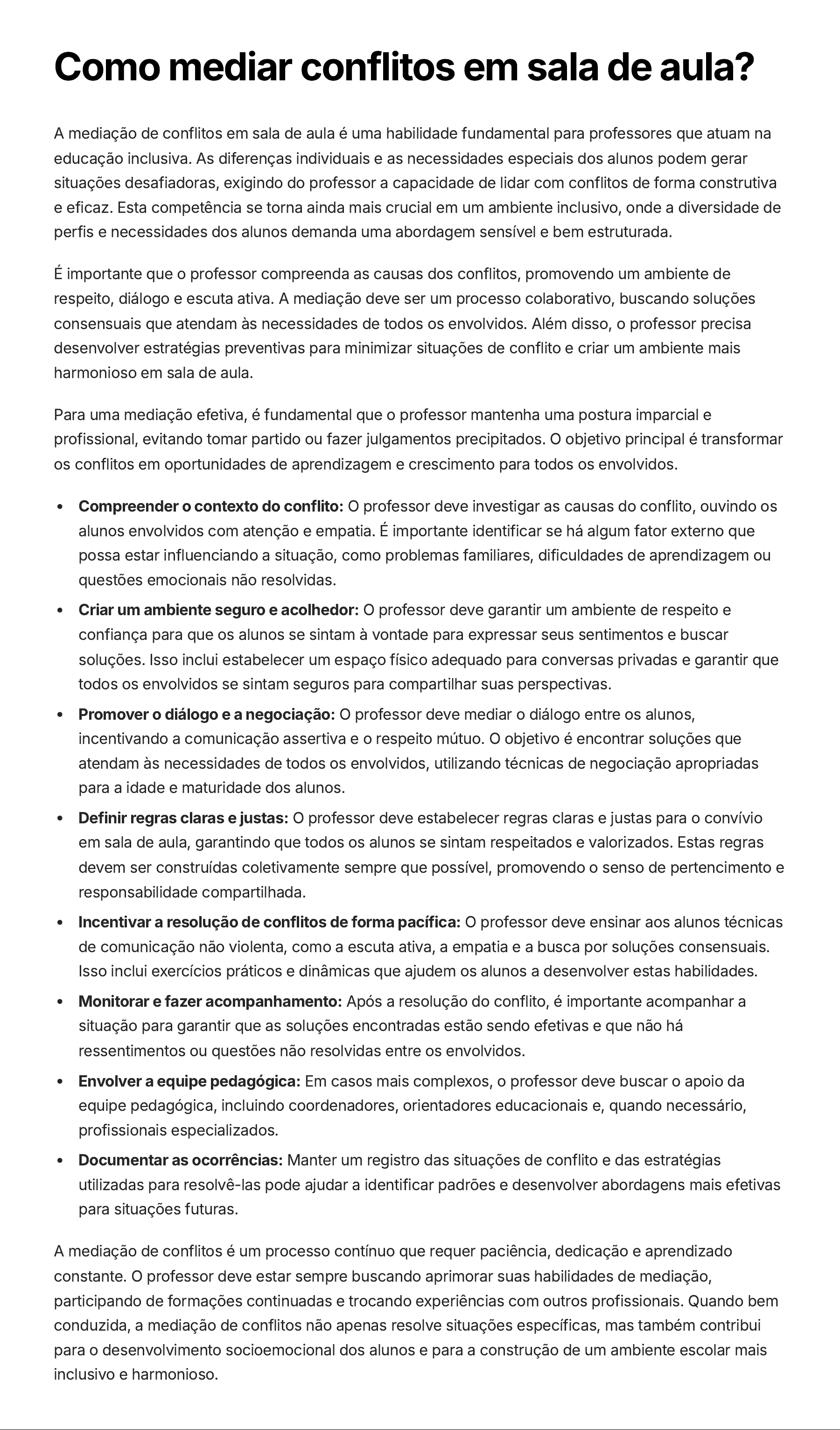 Como mediar conflitos em sala de aula? A mediação de conflitos em sala de aula é uma habilidade fundamental para professores que atuam na educação inclusiva. As diferenças individuais e as necessidades especiais dos alunos podem gerar situações desafiadoras, exigindo do professor a capacidade de lidar com conflitos de forma construtiva e eficaz. Esta competência se torna ainda mais crucial em um ambiente inclusivo, onde a diversidade de perfis e necessidades dos alunos demanda uma abordagem sensível e bem estruturada. É importante que o professor compreenda as causas dos conflitos, promovendo um ambiente de respeito, diálogo e escuta ativa. A mediação deve ser um processo colaborativo, buscando soluções consensuais que atendam às necessidades de todos os envolvidos. Além disso, o professor precisa desenvolver estratégias preventivas para minimizar situações de conflito e criar um ambiente mais harmonioso em sala de aula. Para uma mediação efetiva, é fundamental que o professor mantenha uma postura imparcial e profissional, evitando tomar partido ou fazer julgamentos precipitados. O objetivo principal é transformar os conflitos em oportunidades de aprendizagem e crescimento para todos os envolvidos. Compreender o contexto do conflito: O professor deve investigar as causas do conflito, ouvindo os alunos envolvidos com atenção e empatia. É importante identificar se há algum fator externo que possa estar influenciando a situação, como problemas familiares, dificuldades de aprendizagem ou questões emocionais não resolvidas. Criar um ambiente seguro e acolhedor: O professor deve garantir um ambiente de respeito e confiança para que os alunos se sintam à vontade para expressar seus sentimentos e buscar soluções. Isso inclui estabelecer um espaço físico adequado para conversas privadas e garantir que todos os envolvidos se sintam seguros para compartilhar suas perspectivas. Promover o diálogo e a negociação: O professor deve mediar o diálogo entre os alunos, incentivando a comunicação assertiva e o respeito mútuo. O objetivo é encontrar soluções que atendam às necessidades de todos os envolvidos, utilizando técnicas de negociação apropriadas para a idade e maturidade dos alunos. Definir regras claras e justas: O professor deve estabelecer regras claras e justas para o convívio em sala de aula, garantindo que todos os alunos se sintam respeitados e valorizados. Estas regras devem ser construídas coletivamente sempre que possível, promovendo o senso de pertencimento e responsabilidade compartilhada. Incentivar a resolução de conflitos de forma pacífica: O professor deve ensinar aos alunos técnicas de comunicação não violenta, como a escuta ativa, a empatia e a busca por soluções consensuais. Isso inclui exercícios práticos e dinâmicas que ajudem os alunos a desenvolver estas habilidades. Monitorar e fazer acompanhamento: Após a resolução do conflito, é importante acompanhar a situação para garantir que as soluções encontradas estão sendo efetivas e que não há ressentimentos ou questões não resolvidas entre os envolvidos. Envolver a equipe pedagógica: Em casos mais complexos, o professor deve buscar o apoio da equipe pedagógica, incluindo coordenadores, orientadores educacionais e, quando necessário, profissionais especializados. Documentar as ocorrências: Manter um registro das situações de conflito e das estratégias utilizadas para resolvê-las pode ajudar a identificar padrões e desenvolver abordagens mais efetivas para situações futuras. A mediação de conflitos é um processo contínuo que requer paciência, dedicação e aprendizado constante. O professor deve estar sempre buscando aprimorar suas habilidades de mediação, participando de formações continuadas e trocando experiências com outros profissionais. Quando bem conduzida, a mediação de conflitos não apenas resolve situações específicas, mas também contribui para o desenvolvimento socioemocional dos alunos e para a construção de um ambiente escolar mais inclusivo e harmonioso.