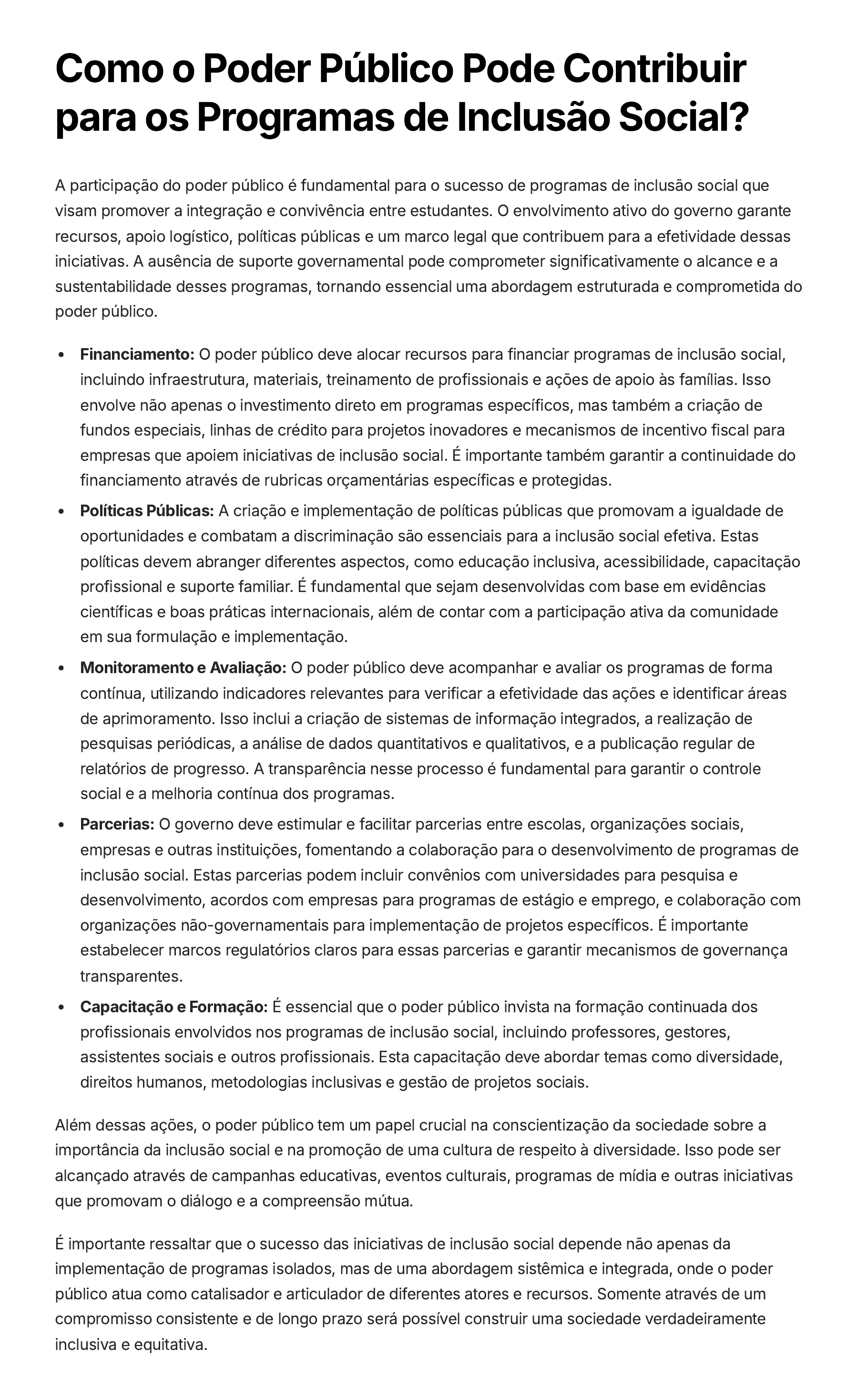 Como o Poder Público Pode Contribuir para os Programas de Inclusão Social? A participação do poder público é fundamental para o sucesso de programas de inclusão social que visam promover a integração e convivência entre estudantes. O envolvimento ativo do governo garante recursos, apoio logístico, políticas públicas e um marco legal que contribuem para a efetividade dessas iniciativas. A ausência de suporte governamental pode comprometer significativamente o alcance e a sustentabilidade desses programas, tornando essencial uma abordagem estruturada e comprometida do poder público. Financiamento: O poder público deve alocar recursos para financiar programas de inclusão social, incluindo infraestrutura, materiais, treinamento de profissionais e ações de apoio às famílias. Isso envolve não apenas o investimento direto em programas específicos, mas também a criação de fundos especiais, linhas de crédito para projetos inovadores e mecanismos de incentivo fiscal para empresas que apoiem iniciativas de inclusão social. É importante também garantir a continuidade do financiamento através de rubricas orçamentárias específicas e protegidas. Políticas Públicas: A criação e implementação de políticas públicas que promovam a igualdade de oportunidades e combatam a discriminação são essenciais para a inclusão social efetiva. Estas políticas devem abranger diferentes aspectos, como educação inclusiva, acessibilidade, capacitação profissional e suporte familiar. É fundamental que sejam desenvolvidas com base em evidências científicas e boas práticas internacionais, além de contar com a participação ativa da comunidade em sua formulação e implementação. Monitoramento e Avaliação: O poder público deve acompanhar e avaliar os programas de forma contínua, utilizando indicadores relevantes para verificar a efetividade das ações e identificar áreas de aprimoramento. Isso inclui a criação de sistemas de informação integrados, a realização de pesquisas periódicas, a análise de dados quantitativos e qualitativos, e a publicação regular de relatórios de progresso. A transparência nesse processo é fundamental para garantir o controle social e a melhoria contínua dos programas. Parcerias: O governo deve estimular e facilitar parcerias entre escolas, organizações sociais, empresas e outras instituições, fomentando a colaboração para o desenvolvimento de programas de inclusão social. Estas parcerias podem incluir convênios com universidades para pesquisa e desenvolvimento, acordos com empresas para programas de estágio e emprego, e colaboração com organizações não-governamentais para implementação de projetos específicos. É importante estabelecer marcos regulatórios claros para essas parcerias e garantir mecanismos de governança transparentes. Capacitação e Formação: É essencial que o poder público invista na formação continuada dos profissionais envolvidos nos programas de inclusão social, incluindo professores, gestores, assistentes sociais e outros profissionais. Esta capacitação deve abordar temas como diversidade, direitos humanos, metodologias inclusivas e gestão de projetos sociais. Além dessas ações, o poder público tem um papel crucial na conscientização da sociedade sobre a importância da inclusão social e na promoção de uma cultura de respeito à diversidade. Isso pode ser alcançado através de campanhas educativas, eventos culturais, programas de mídia e outras iniciativas que promovam o diálogo e a compreensão mútua. É importante ressaltar que o sucesso das iniciativas de inclusão social depende não apenas da implementação de programas isolados, mas de uma abordagem sistêmica e integrada, onde o poder público atua como catalisador e articulador de diferentes atores e recursos. Somente através de um compromisso consistente e de longo prazo será possível construir uma sociedade verdadeiramente inclusiva e equitativa.