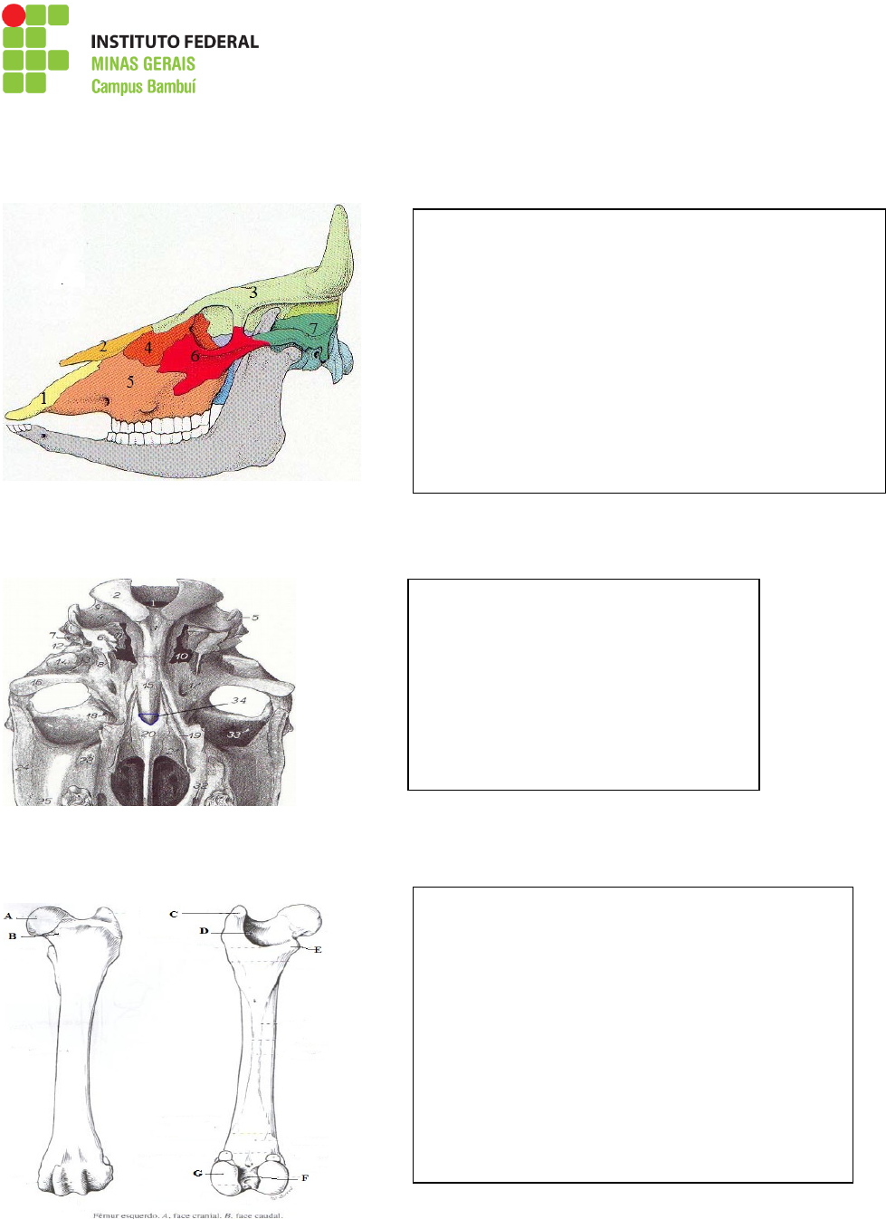 Exercício Anatomia Veterinária I 1 – Cite o nome correspondente aos ossos do crânio: 1-Incisivo 2- Nasal 3-Frontal 4-Lacrimal 5- Maxila 6-Zigomático 7-Temporal 2 – Denomine as estruturas que fazem parte desta visão ventral do crânio: 1- Forame magno 2-Côndilo do occipital 5-Processo paracondilar 7- Meato acústico externo 3 – Nomeie as estruturas apontadas por letras: A- Cabeça do fêmur B-Colo da cabeça do fêmur C- Trocânter maior D-Fossa trocantérica E- Trocânter menor F- Fossa intercondilar G-Côndilo lateral 4- Nomeie as estruturas vertebrais: 1-Processo espinhoso 2- Processo articular cranial 3-Forame vertebral 4- Processo transverso 5- Cabeça 6- Processo mamilar Vértebra torácica vista caudal 1-Forame vertebral 2-Face articular caudal 4-Processo espinhoso 5- Processo transverso 6- Processo mamilar 7- Processo articular caudal Vértebra lombar vista caudal 5 – Nomeie as divisões da escápula: 1-Cartilagem da escápula 2-Fossa infraespinhal 3-fossa supraespinhal 4- tuberosidade da espinha da escápula 5-espinha da escápula 6-processo coracoide 7-cavidade glenoide 1-Tubérculo maior 2-Cabeça do úmero 3-Colo 4- Tuberosidade deltoide 5-Tuberosidade redonda maior 6- 7-Fossa do ol 8- 9-Tuberculo intermédio 10- 11-Sulco intertubercular 12- 13- 14-Fossa radial 15- 16- 1-Tuberosidade do ol 2-ol 3-process ancôneo 4- 5- 6- 7- 8- 9-cabeça do rádio 10- 11- 12- 13- 14- 15- 16- 17- 18- 19- 20- 21- 6 – Nomeie o úmero nas vistas caudal e cranial: 7 – Nomeie as estruturas do rádio e ulna: 8 – Nomeie as estruturas da pelve: 12- 13- 14- 15- 16- 17- 18- 19- 20- 21- 22- 1- 2- 3- 4- 5- 6- 7- 8- 9- 10- 11- 9 – As junturas são o meio de união entre partes rígidas. Elas têm como funções básicas além da união o movimento. Conceitue os 3 tipos de junturas fibrosas abaixo: A-_____Sutura plana____ B-_____Sutura serreada_______ C- __Sutura escamosa__ 10 – Escreva o nome dos músculos corretamente: 12- cabeça lateral do músculo tríceps braquial 13- músculo ancôneo 14- músculo braquial 15- músculo extensor radial do carpo 16-músculo abdutor longo do polegar 17- Mm extensor comum dos dedos 18- Mm extensor comum dos dedos 19- Mm extensor lateral do dedo 20- mm flexor profundo dos dedos 21- músculo extensor ulnar do carpo 1- Músculo supraespinhal 2- Músculo infraespinhal 3- parte acromial do músculo deltoide 4- parte escapular do músculo deltoide 5- Músculo peitoralprofundo 6- Músculo bíceps braquial 7- Músculo braquiocefálico 8- músculo redondo maior 9- tensor da fáscia do antebraço 10-músculo grande dorsal 11 e 11’- cabeça longa do músculo tríceps braquial Músculos do membro torácico Vista lateral 16- mm braquial 19- mm extensor radial do carpo 21- mm flexor ulnar do carpo 22- músculo flexor radial do carpo Músculos do membro torácico Vista medial 11- parte acromial do mm deltoide 12- mm omotransverso 13- mm grande dorsal 14- mm serrátil dorsal caudal 15- 16-mm oblíquo interno do abdome 17-mm serrátil ventral torácico 18-mm oblíquo externo do abdome 19- aponeurose do mm ob ex do ab e do mm ob in do ab 20- mm peitoral profundo 21-mm tensor da fáscia do antebraço 22- cab longa do mm tríceps braquial 23-cab lat do mm tríceps braquial 24-mm braquial 25-mm ext radial do carpo 1- 2- mm braquiocefálico 3- 4- 5- 6- 7- 8-parte cervical do mm trapézio 9- parte torácica do mm trapézio 10- parte escapular do músculo deltoide 11 – Escreva o nome dos músculos correspondentes aos números: 12 – Nomeie corretamente a musculatura pélvica lateral: 15- 16- 19- 28- 29- 30- 30’- 31- 32- 13 – As articulações são os meios pelos quais os ossos estão unidos para formar o esqueleto. Nomeie as estruturas de 1 a 4: 1-Cavidade articular 2-membrana sinovial 3-cartilagem articular 4-camada fibrosa da cápsula articular 5- 6- 14 – Nomeie corretamente as estruturas numeradas:1-Túber coxal 2 – músculo glúteo médio 6-mm tensor da fáscia lata 7-fáscia lata femoral 11 – músculo glúteo superficial 12 – porção cranial do mm bíceps femoral 14 – mm semitendíneo 16 – mm vasto lateral 18-nervo isquiático 19 - mm semimembranáceo 20- nervo tibial 21-nervo fibular comum 24-mm tibial cranial 25-mm extensor longo dos dedos e mm fibular terceiro 26-mm fibular longo 32- linfonodos poplíteos profundos 15 – Nomeie corretamente os músculos do membro pélvico – vista medial: 10-Músculo tensor da fáscia lata 10´-fáscia lata femoral 11-Músculo sartório 12-músculo reto femoral 13-músculo vasto medial 15-músculo grácil 16-músculo adutor 17-músculo semimembranáceo 18-músculo semitendíneo 20- cabeça medial do músculo gastrocnêmio 28- músculo fibular terceiro 16 – Nomeie a musculatura da face lateral : 3-mm malar 4-mm depressor da pálpebra inferior 8-parte bucal do mm bucinador 9- mm depressor do lábio inferior 11- mm zigomatico 13- mm frontal 17- parte profunda do mm masseter 18- parte superficial do mm masseter 19-mm braquiocefálico 21-linfonodo parotídeo 23-glândula mandibular 24- linfonodo retrofaríngeo lateral 26- veia jugular 29-veia facial, linfonodo mandibular Boa sorte!!! image6.png image7.png image8.png image9.png image10.png image11.png image12.png image13.png image14.png image15.png image16.png image17.png image18.jpeg image19.png image20.png image21.png image1.png image2.png image3.png image4.png image5.png