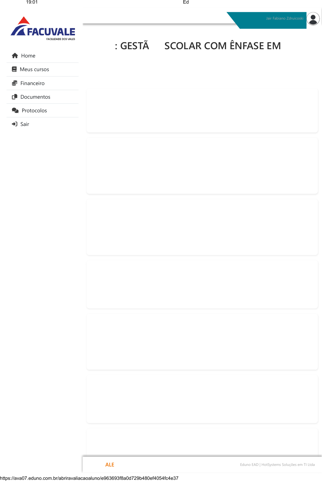 Curso: GESTÃO ESCOLAR COM ÊNFASE EM ADMINISTRAÇÃO, SUPERVISÃO, ORIENTAÇÃO E INSPEÇÃO ESCOLAR Disciplina: ADMINISTRAÇÃO ESCOLAR AVALIAÇÃO Para sua análise, estão sendo exibidas somente as questões respondidas. Qual foi o impacto do capitalismo agigantado nos meados do século XIX? O que caracteriza a Escola Clássica da Administração? Quem é o fundador da Escola Humanista de acordo com que foi estuado? O que foi uma das principais críticas à administração escolar centralizada descrita no conteúdo estuado? Qual teoria foi formalizada por Max Weber? Qual foi a característica principal da administração escolar durante o governo militar (1964-1984)? ☑ Substituição da produção manual por seriada e uso de máquinas avançadas. ☑ A Teoria Geral da Administração fundamentada em Frederick Taylor e Henry Fayol. ☑ George Elton Mayo. ☑ Desconhecimento da capacidade e dignidade profissional dos subalternos. ☑ Teoria da Burocracia. ☑ Autoritarismo e terror. Jair Fabiano Zdruicoski Home Meus cursos Financeiro Documentos Protocolos Sair FACUVALE Eduno EAD | HotSystems Soluções em TI Ltda 26/11/2024, 19:01 Eduno https://ava07.eduno.com.br/abriravaliacaoaluno/e963693f8a0d729b480ef4054fc4e370 1/2 https://ava07.eduno.com.br/alteradadospessoais https://ava07.eduno.com.br/inicio https://ava07.eduno.com.br/meuscursos https://ava07.eduno.com.br/posicaofinanceira https://ava07.eduno.com.br/documentosaluno/* https://ava07.eduno.com.br/viewlistaprotocolosaluno De acordo com o que foi estudado, o que é um dos enfoques principais da Teoria das Relações Humanas? Qual é a definição original da palavra administração segundo que foi estuado? Qual era a tarefa do diretor de escola após a Lei nº. 5.692/71? O que a Teoria da Burocracia de Max Weber estabelece sobre a organização? VOLTAR ☑ Motivação, liderança e dinâmica de grupo. ☑ Realizar uma função abaixo do comando de outrem. ☑ Praticar as diretrizes políticas decididas fora da escola. ☑ Estrutura hierárquica com linhas de autoridade bem definidas. Jair Fabiano Zdruicoski Home Meus cursos Financeiro Documentos Protocolos FACUVALE Eduno EAD | HotSystems Soluções em TI Ltda 26/11/2024, 19:01 Eduno https://ava07.eduno.com.br/abriravaliacaoaluno/e963693f8a0d729b480ef4054fc4e370 2/2 https://ava07.eduno.com.br/alteradadospessoais https://ava07.eduno.com.br/inicio https://ava07.eduno.com.br/meuscursos https://ava07.eduno.com.br/posicaofinanceira https://ava07.eduno.com.br/documentosaluno/* https://ava07.eduno.com.br/viewlistaprotocolosaluno