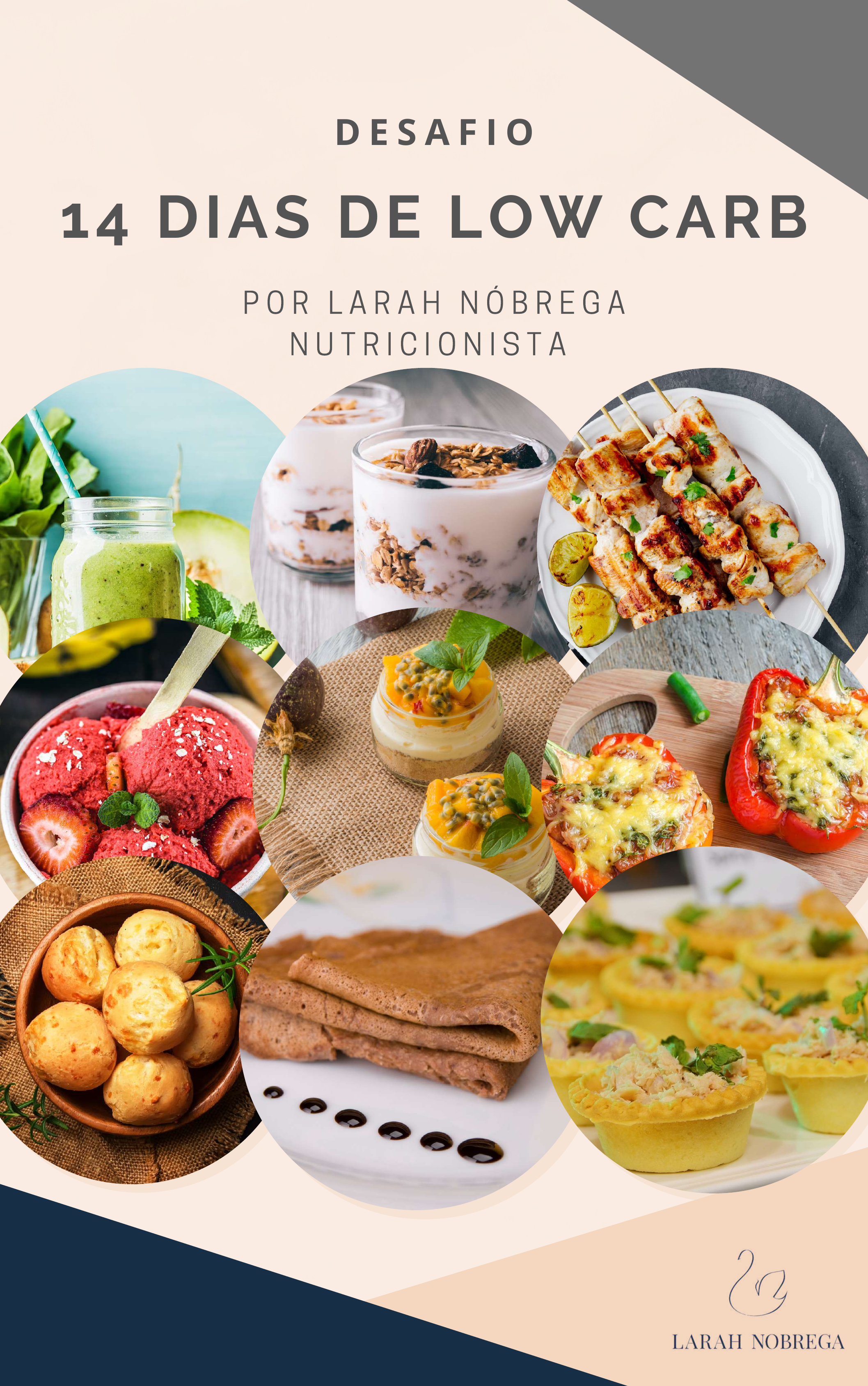 P O R L A R A H N Ó B R E G A N U T R I C I O N I S T A 14 DIAS DE LOW CARB D E S A F I O P O R L A R A H N Ó B R E G A N U T R I C I O N I S T A Olá! Sou Larah Nóbrega. Sou Nutricionista Clínica graduada pela Universidade de Fortaleza e Pós Grad. em Nutrição Clínica Esportiva e em Nutrição Clínica Funcional. Minha missão é trazer um pouco mais de saúde e bem estar através de uma alimentação baseada em comida de verdade. Além disso sou apaixonada por cozinhar, e por isso, acabo criando, testando e adaptando diversas receitas saudáveis para os meus clientes. Por isso resolvi criar esse material, justamente por ser uma forma de auxiliar mais pessoas que buscam aderir a um estilo de vida saudável e equilibrado. 1 4 D I A S D E L O W C A R B P O R L A R A H N Ó B R E G A N U T R I C I O N I S T A O que é Lowcarb? O próprio nome já está dizendo, lowcarb, ou seja, BAIXA ingestão em carboidratos e não ZERO carboidratos, como muitos pensam. Portanto, em lowcarb não existe a necessidade de eliminar todas as fontes alimentares desse macronutriente. Para seguir essa estratégia nutricional, você precisa reduzir a quantidade de carboidratos ingeridos. Nesse caso o consumo não poderia exceder 40% de carboidratos da sua alimentação diária. Em lowcarb priorizamos uma alimentação baseada em comida de verdade. Então não basta apenas reduzir a quantidade, mas também é preciso cuidar da qualidade desses carboidratos que irão compor a alimentação. Por isso quis montar esse material com dois modelos de cardápio semanal: para te ensinar de forma prática e simples como basear a sua alimentação em comida de verdade, reduzindo a sinalização de insulina. Lembrando que nada substitui um acompanhamento nutricional individualizado e que são apenas sugestões de cardápios. Fiquem a vontade para adaptar e criar novas preparacões. As porções descritas nesse material são gerais. Você pode encaixá-las dentro da sua rotina alimentar, mas caso você queira ou precise consumir porções maiores não tem problema, são apenas sugestões. Para saber qual a melhor estratégia para você, o ideal é passar por uma consulta nutricional com um profissional que trabalhe com isso e entenda dessa estratégia. Um ponto em comum em todas as estratégias usadas em lowcarb é que frisamos o quanto é importante que você respeite ao máximo o estímulo de fome e o de saciedade, ou seja, não há a necessidade de comer de 3 em 3 horas ou com horário pré estabelecido. Você deve comer quando e SE HOUVER a presença da fome. Em lowcarb, como reduzimos o consumo de carboidratos, também reduzimos a sinalização de insulina, hormônio que, se muito estimulado através de um alto consumo de carboidratos, contribui para o processo de acúmulo de gordura. Quando temos esse controle da sinalização de insulina, temos também um maior controle do apetite. Portanto não sentimos fome com tanta frequência ao longo do dia. Qual a estratégia ideal para seguir? Existem várias estratégias em lowcarb, sendo algumas bem mais restritivas e outras menos. Mas todas acabam seguindo o mesmo princípio, que é basear a alimentação em comida de verdade e reduzir o consumo dos carboidratos. Estratégias em Lowcarb As mais restritas restringem o consumo de alguns vegetais, frutas e até mesmo grãos, como por exemplo o feijão. 1 2 3 4 Antes de tudo,insulina é o hormônioque capta a glicose(açúcar) do sangue eleva para dentro dostecidos (células). Com um menor consumo de carboidratos Carboidrato e Insulina Ou seja... A estratégia Lowcarb faz com que você sinta menos fome ao longo do dia devido a essa menor sinalização do hormônio insulina e, consequentemente, gera um menor acúmulo de gordura. Tem-se uma menor sinalização de insulina Assim, um maior controle de apetite P O R L A R A H N Ó B R E G A N U T R I C I O N I S T A As gorduras são macronutrientes densos. "Como assim Larah?" Em 1g de gordura temos 9kcal, ou seja, se você exagera no consumo desse macronutriente provavelmente irá promover um superávit calórico. As proteínas também contem calorias e se consumidas em excesso prejudicarão o processo de emagrecimento. Lembrando que... É normal que em Low Carb, pela redução do consumo de carboidratos, aumentemos o consumo dos outros macronutrientes, como as proteínas e as gorduras. Mas, se você busca EMAGRECIMENTO, precisamos também levar em consideração o deficit calórico. Um erro clássico em quem faz lowcarb sem orientação é achar que o consumo de proteínas e gorduras são livres. E não, não são livres. Portanto, uma forma de você não exagerar nas quantidades é observar a sua fome e a sua saciedade. Só que para percebemos esses estímulos fisiológicos precisamos está ATENTOS aos sinais do nosso corpo e precisamos estar 100% presentes do momento da refeição. Por isso que sempre reforço a importância de comer com atenção plena a mastigar bem os alimentos. 1 4 D I A S D E L O W C A R B FOME X VONTADE FOME: inespecífica, está relacionada com uma necessidade fisiológica do corpo de buscar energia. VONTADE: Específica, mais associada à desejo por algum alimento. P O R L A R A H N Ó B R E G A N U T R I C I O N I S T A Principais dúvidas em Lowcarb... "Qualquer pessoa pode fazer lowcarb?" Sim, exceto quem está em processo de ganho de massa muscular e quem não se adapta bem a essa estratégia. "Sinto que meu intestino fica mais constipado após iniciar uma lowcarb, Larah. Por que?" Muitas vezes isso acontece porque a grande maioria das pessoas não baseia a sua alimentação em vegetais e acaba retirando-os da alimentação. Além disso ficam com receio de consumir as frutas por conta dos carboidratos que elas possuem e com isso baixam de forma drástica e consumo de fibras. "E os adoçantes, podem fazer parte da dieta?" Sim, se forem os naturais e se usados com moderação. Dentre os naturais temos a stévia, o xilitol, o eritritol, o maltitol e