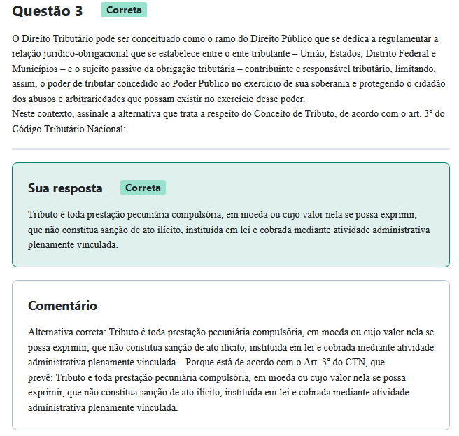 Questão 3 Correta o Direito Tributário pode ser conceituado como ramo do Direito Público que se dedica a regulamentar a relação juridico-obrigacional que se estabelece entre 0 ente tributante União, Estados, Distrito Federal e Municípios - e o sujeito passivo da obrigação tributária contribuinte e responsável tributário, limitando, assim, poder de tributar concedido ao Poder Público no exercício de sua soberania e protegendo cidadão dos abusos e arbitrariedades que possam existir no desse poder. Neste contexto, assinale a alternativa que trata a respeito do Conceito de Tributo, de acordo com o art. 3° do Código Tributário Nacional: Sua resposta Correta Tributo é toda prestação pecuniária compulsória, em moeda ou cujo valor nela se possa exprimir, que não constitua sanção de ato em lei e cobrada mediante atividade administrativa plenamente vinculada. Comentário Alternativa correta: Tributo é toda prestação pecuniária compulsória, em moeda ou cujo valor nela se possa exprimir, que não constitua sanção de ato em lei e cobrada mediante atividade administrativa plenamente vinculada. Porque está de acordo com Art. 3° do CTN, que prevê: Tributo é toda prestação pecuniária em moeda ou cujo valor nela se possa exprimir, que não constitua sanção de ato em lei e cobrada mediante atividade administrativa plenamente vinculada.