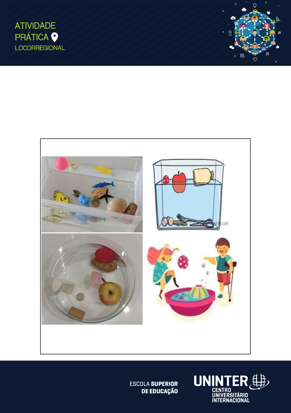Nome: Pamela Tais dos Santos Almeida RU:4493084 Curso: Pedagogia Disciplina: Ciências Registro da Atividade Prática que será postado no AVA Texto Informativo de Ciências: Afunda ou flutua? Ano: 1º ano Unidade Temática: Vida e evolução Objeto de Conhecimento: Escalas de Tempo Habilidades: (EF01CI05) Comparar características físicas entre os colegas, reconhecendo a diversidade e a importância da valorização, do acolhimento e do respeito as diferenças. Enunciado da Atividade (1º ano): Vivenciar atividades de flutuabilidade dos corpos, de forma a compreender as variáveis envolvidas como o objeto; densidade do líquido em que está imerso; empuxo da água. É muito comum as crianças pensarem que a capacidade de flutuar está relacionada ao tamanho e peso dos objetos. Dessa forma, esse tema pode proporcionar boas situações de pesquisa científica em sala de aula, pois durante as experiências os alunos poderão ser mobilizados a manipularem diferentes objetos, observá-los e compará-los. Além de propiciar uma aproximação dos alunos com a questão da flutuabilidade dos corpos. fazer algumas perguntas aos alunos para que reflitam sobre o tema. Materiais: Bacias ou baldes com água e elementos de diferentes formas, pesos e cores (bolas, plás- ticos, potes, tampas, conchas, garrafas, pedras, galhos, madeira, pequenos brinquedos e peças de jogos de encaixe de diferentes materiais etc.). É importante considerar a va- riedade materiais e boas quantidades dos que flutuam e dos que afundam. Considere os materiais que existem na escola e outros que podem ser solicitados às famílias. Faça um teste com os objetos para que você mesmo conheça melhor aqueles que boiam ou afundam. Espaços: Prepare em ambiente externo um espaço com bacias ou baldes com água e selecione elementos de diferentes formas, pesos e cores como citados nos materiais. Organize as bacias em quantidades razoáveis (de acordo com o número de crianças e tamanho das bacias) para que pequenos grupos se formem em torno delas. Busque organizar o am- biente de forma atrativa para a exploração das crianças, organizando em cestas ou cai- xotes os materiais e sua variedade, como por exemplo, um recipiente para garrafinhas, potes e tampinhas, outro para elementos da natureza, outro para pequenos brinquedos etc. Com o ambiente externo organizado, com os baldes ou bacias já com água e com os elementos à disposição das crianças (podendo estar no chão ou sobre uma mesa), traga o grande grupo. Permita que os pequenos transitem pelo o espaço e, à medida que ob- servam os elementos, comece conversando sobre como está o dia, sugira que olhem para cima e observem o céu, e pergunte como se sentem em relação ao clima. A partir das respostas e expressões das crianças, pergunte o que elas gostam de fazer em dias quentes. Neste momento, deixe que elas tragam memórias de experiência anteriores e, a partir de suas respostas, contextualize a atividade. (EF01CI05) Identificar e nomear diferentes escalas de tempo :os períodos diários (ma- nhã, tarde, noite) e a sucessão de dias, semanas, meses e anos. Atividade: Faça uma grande roda para que as crianças possam se expressar sobre a vi- vência que tiveram, como se sentiram, se gostaram, o que perceberam, quais as semelhanças e diferenças entre os diversos objetos usados (esteja atento para aquelas que não façam uso da linguagem oral, expressando-se com o corpo). Coloque as bacias mais próximas da roda para que as crianças possam tanto falar como mostrar seus objetos e experiências preferidas. Depois da conversa, convide o grupo para ajudar na organização do ambiente, tirando todos os objetos da água para que possam ser guardados. Dê um destino para a água, que pode ser reutilizada para regar as plantas da escola. Experiencia realizada em 13 de dezembro de 2023 Ano (2023): Unidade Temática: Números Objeto de Conhecimento: Construção de fatos básicos da adição. Problemas envolvendo diferentes significados da adição (juntar, acrescentar). Habilidades: (EF01MA06) Construir fatos básicos da adição e utilizá-los em procedimentos de cálculo para resolver problemas. (EF01MA08) Resolver e elaborar problemas de adição e de subtração, envolvendo números de até dois algarismos, com os significados de juntar, acrescentar, separar e retirar, com o suporte de imagens e/ou material manipulável, utilizando estratégias e formas de registro pessoais. Enunciado da Atividade (1º ano): Inicie com a seguinte parlenda cantada: "Um, dois, feijão com arroz, Três, quatro, feijão no prato, Cinco, seis, falar inglês, Sete, oito, comer biscoito, Nove, dez, comer pastéis." Cada aluno utiliza a folha 1, grãos de feijão e cola. No espaço quadrangular, o aluno cola a respectiva quantidade de grãos indicada pelos numerais. É importante inserir a ideia do zero com o espaço vazio. O objetivo é significar os algarismos às quantidades, além da prática da contagem. Uma sugestão é utilizar recortes dos algarismos como recurso visual, junto à música, ou mesmo escrevê-los na lousa. Atividade: Esta atividade pode ser aplicada individualmente, em duplas ou grupos, onde cada um possua uma cartela. O professor sorteia o número que é a soma, enquanto os alunos verificam na tabela se há o cálculo que leva àquele resultado. A avaliação do desempenho dos alunos é realizada em dois momentos: 1 - Atitudinal. Por observação durante a atividade. 2 - Pela resolução das atividades em folha. O objetivo é significar os algarismos às quantidades, além da prática da contagem. EMB ESCOLA MONTEIRO LOBATO Turma : 1º ano E vespertino Ano 2023 Atividade impressa Soma com material concreto O professor forma duplas e sorteia um número para cada aluno, que deverá separar aquela quantidade em grãos. Na folha, cada aluno registra uma parcela da adição, utili- zando algarismos para representar a quantidade de grãos que separou. Comentário: Novas pergu
