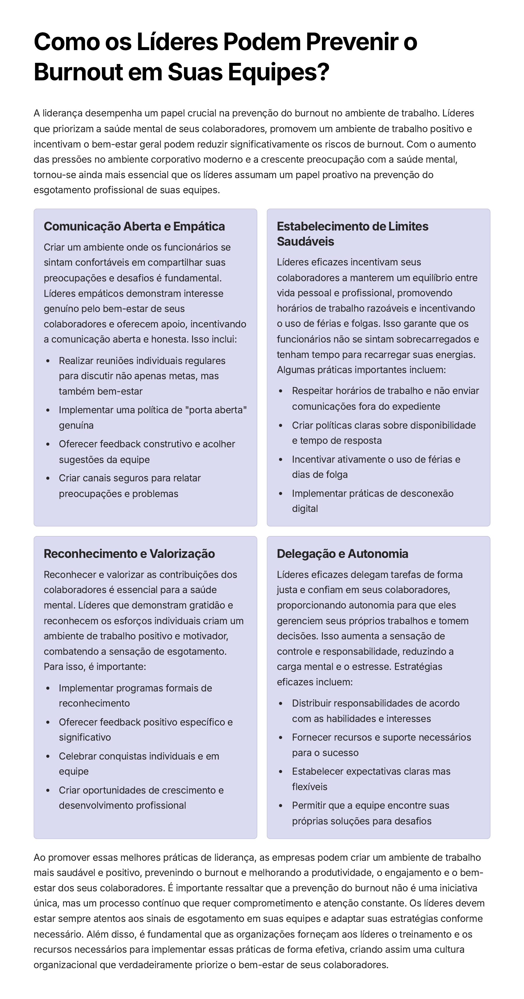 Como os Líderes Podem Prevenir o Burnout em Suas Equipes? A liderança desempenha um papel crucial na prevenção do burnout no ambiente de trabalho. Líderes que priorizam a saúde mental de seus colaboradores, promovem um ambiente de trabalho positivo e incentivam o bem-estar geral podem reduzir significativamente os riscos de burnout. Com o aumento das pressões no ambiente corporativo moderno e a crescente preocupação com a saúde mental, tornou-se ainda mais essencial que os líderes assumam um papel proativo na prevenção do esgotamento profissional de suas equipes. Comunicação Aberta e Empática Criar um ambiente onde os funcionários se sintam confortáveis em compartilhar suas preocupações e desafios é fundamental. Líderes empáticos demonstram interesse genuíno pelo bem-estar de seus colaboradores e oferecem apoio, incentivando a comunicação aberta e honesta. Isso inclui: Realizar reuniões individuais regulares para discutir não apenas metas, mas também bem-estar Implementar uma política de "porta aberta" genuína Oferecer feedback construtivo e acolher sugestões da equipe Criar canais seguros para relatar preocupações e problemas Estabelecimento de Limites Saudáveis Líderes eficazes incentivam seus colaboradores a manterem um equilíbrio entre vida pessoal e profissional, promovendo horários de trabalho razoáveis e incentivando o uso de férias e folgas. Isso garante que os funcionários não se sintam sobrecarregados e tenham tempo para recarregar suas energias. Algumas práticas importantes incluem: Respeitar horários de trabalho e não enviar comunicações fora do expediente Criar políticas claras sobre disponibilidade e tempo de resposta Incentivar ativamente o uso de férias e dias de folga Implementar práticas de desconexão digital Reconhecimento e Valorização Reconhecer e valorizar as contribuições dos colaboradores é essencial para a saúde mental. Líderes que demonstram gratidão e reconhecem os esforços individuais criam um ambiente de trabalho positivo e motivador, combatendo a sensação de esgotamento. Para isso, é importante: Implementar programas formais de reconhecimento Oferecer feedback positivo específico e significativo Celebrar conquistas individuais e em equipe Criar oportunidades de crescimento e desenvolvimento profissional Delegação e Autonomia Líderes eficazes delegam tarefas de forma justa e confiam em seus colaboradores, proporcionando autonomia para que eles gerenciem seus próprios trabalhos e tomem decisões. Isso aumenta a sensação de controle e responsabilidade, reduzindo a carga mental e o estresse. Estratégias eficazes incluem: Distribuir responsabilidades de acordo com as habilidades e interesses Fornecer recursos e suporte necessários para o sucesso Estabelecer expectativas claras mas flexíveis Permitir que a equipe encontre suas próprias soluções para desafios Ao promover essas melhores práticas de liderança, as empresas podem criar um ambiente de trabalho mais saudável e positivo, prevenindo o burnout e melhorando a produtividade, o engajamento e o bem- estar dos seus colaboradores. É importante ressaltar que a prevenção do burnout não é uma iniciativa única, mas um processo contínuo que requer comprometimento e atenção constante. Os líderes devem estar sempre atentos aos sinais de esgotamento em suas equipes e adaptar suas estratégias conforme necessário. Além disso, é fundamental que as organizações forneçam aos líderes o treinamento e os recursos necessários para implementar essas práticas de forma efetiva, criando assim uma cultura organizacional que verdadeiramente priorize o bem-estar de seus colaboradores.