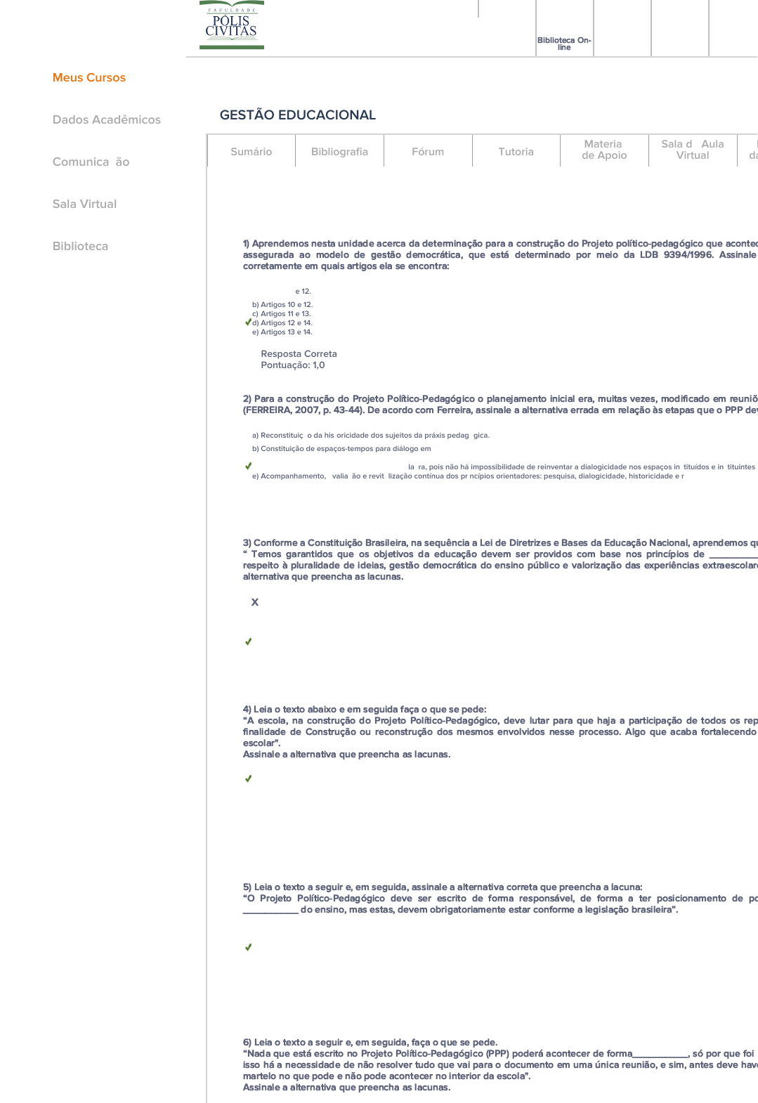 Biblioteca On- line GESTÃO EDUCACIONAL (TS23) Início 09/05/2023 - Término 31/12/2025 AVALIAÇÃO: AVALIAÇÃO FINAL - G 1) Aprendemos nesta unidade acerca da determinação para a construção do Projeto político-pedagógico que acontec assegurada ao modelo de gestão democrática, que está determinado por meio da LDB 9394/1996. Assinale corretamente em quais artigos ela se encontra: a) Artigos 11 e 12. b) Artigos 10 e 12. c) Artigos 11 e 13. d) Artigos 12 e 14. e) Artigos 13 e 14. Resposta Correta Pontuação: 1,0 2) Para a construção do Projeto Político-Pedagógico o planejamento inicial era, muitas vezes, modificado em reuniõ (FERREIRA, 2007, p. 43-44). De acordo com Ferreira, assinale a alternativa errada em relação às etapas que o PPP dev a) Reconstituição da historicidade dos sujeitos da práxis pedagógica. b) Constituição de espaços-tempos para diálogo em todos os níveis da instituição e envolvendo os diferentes sujeitos. c) Implementação da proposta. d) Não precisa de estímulo à circulação da palavra, pois não há impossibilidade de reinventar a dialogicidade nos espaços instituídos e instituintes e) Acompanhamento, avaliação e revitalização contínua dos princípios orientadores: pesquisa, dialogicidade, historicidade e reflexão. Resposta Correta Pontuação: 1,0 3) Conforme a Constituição Brasileira, na sequência a Lei de Diretrizes e Bases da Educação Nacional, aprendemos qu “ Temos garantidos que os objetivos da educação devem ser providos com base nos princípios de _________ respeito à pluralidade de ideias, gestão democrática do ensino público e valorização das experiências extraescolare alternativa que preencha as lacunas. Xa) Autonomia e liberdade. b) Respeito e autonomia. c) Valorização e autonomia. d) Igualdade e respeito. e) Igualdade e liberdade. Resposta Errada Pontuação: 0,0 4) Leia o texto abaixo e em seguida faça o que se pede: “A escola, na construção do Projeto Político-Pedagógico, deve lutar para que haja a participação de todos os rep finalidade de Construção ou reconstrução dos mesmos envolvidos nesse processo. Algo que acaba fortalecendo escolar". Assinale a alternativa que preencha as lacunas. a) Autonomia e identidade. b) Identidade e transparência. c) Autonomia e ação. d) Transparência e ação. e) Autonomia e empreendedorismo. Resposta Correta Pontuação: 1,0 5) Leia o texto a seguir e, em seguida, assinale a alternativa correta que preencha a lacuna: “O Projeto Político-Pedagógico deve ser escrito de forma responsável, de forma a ter posicionamento de po __________ do ensino, mas estas, devem obrigatoriamente estar conforme a legislação brasileira”. a) Persuasão. b) Qualidade. c) Ambição. d) Criatividade. e) Atitude. Resposta Correta Pontuação: 1,0 6) Leia o texto a seguir e, em seguida, faça o que se pede. “Nada que está escrito no Projeto Político-Pedagógico (PPP) poderá acontecer de forma__________, só por que foi isso há a necessidade de não resolver tudo que vai para o documento em uma única reunião, e sim, antes deve have martelo no que pode e não pode acontecer no interior da escola". Assinale a alternativa que preencha as lacunas. Meus Cursos Dados Acadêmicos Comunicação Sala Virtual Biblioteca Sumário Bibliografia Fórum Tutoria Material de Apoio Sala de Aula Virtual P da https://avapolis.com.br/Aluno/app.asp https://bibliogratuita.curatoriaeditora.com.br/biblioIntegracao.php?accesskey=zcetrsl8lo https://avapolis.com.br/Aluno/agenda_academico_nv.asp https://avapolis.com.br/Aluno/mensagens.asp https://avapolis.com.br/Aluno/relMeusCursos.asp Xa) Impulsiva e autonomia. b) Legal e insistências. c) Indisciplinar e insistências. d) Ilegal e discussões. e) Insistente e autônoma. Resposta Errada Pontuação: 0,0 7) Aprendemos em nossos estudos que, a partir da década de 1980, as coisas começaram a mudar no Brasil e jun democracia, que também é regulamentada para acontecer dentro das escolas. Pense, reflita, e, nesse contexto, ass parte da gestão democrática: a) Diálogo. b) Autoridade. c) Participação. d) Escuta de opiniões. e) Divisão nas tomadas de decisões. Resposta Correta Pontuação: 1,0 8) Leia o texto a seguir e em seguida faça o que se pede. “A ____________deve acontecer na escola no sentido de buscar formas eficazes de trilhar sempre o caminho do en Assinale a alternativa que completa a frase. a) Autonomia. b) Liderança. c) Gerenciamento. d) Planejamento estratégico. e) Marketing pessoal. Resposta Correta Pontuação: 1,0 9) O uso do termo gestão democrática é algo real e acontece com o intuito de se contrapor à concepção ce “administração”, que por muito tempo perdurou em nossa sociedade brasileira. Dessa forma, reflita acerca de todo c alternativa incorreta. a) O modelo de gestão democrática deve respeitar as particularidades de cada ação e envolver as pessoas que fazem parte do contexto escolar em b) O projeto político deve ser construído na escola e deve ser político visando formar para a sociedade. c) O gestor e os profissionais da escola devem buscar propor soluções para tentar ajudar a sanar as dificuldades encontradas na escola. d) No PPP não é preciso que esteja registrado a concepção teórica que desejamos trabalhar, o contexto histórico dessas escolas, a necessidade e p e) A escolha dos membros do conselho escolar deve acontecer de forma democrática. Resposta Correta Pontuação: 1,0 10) Aprendemos no estudo desta unidade que a escolha dos membros do conselho escolar deve acontecer em um f eleição dos candidatos representantes de cada segmento da escola, com a votação sobre a escolha dos mesm representa corretamente qual é esse formato. a) Autoritária. b) Rígida. Xc) Inflexível. d) Sem liderança. e) Democrática. Resposta Errada Pontuação: 0,0 Nota da Avaliação: Sem nota Resposta correta X Resposta incorreta marcada pelo aluno © Copyright - Matheus Soluções - Siste