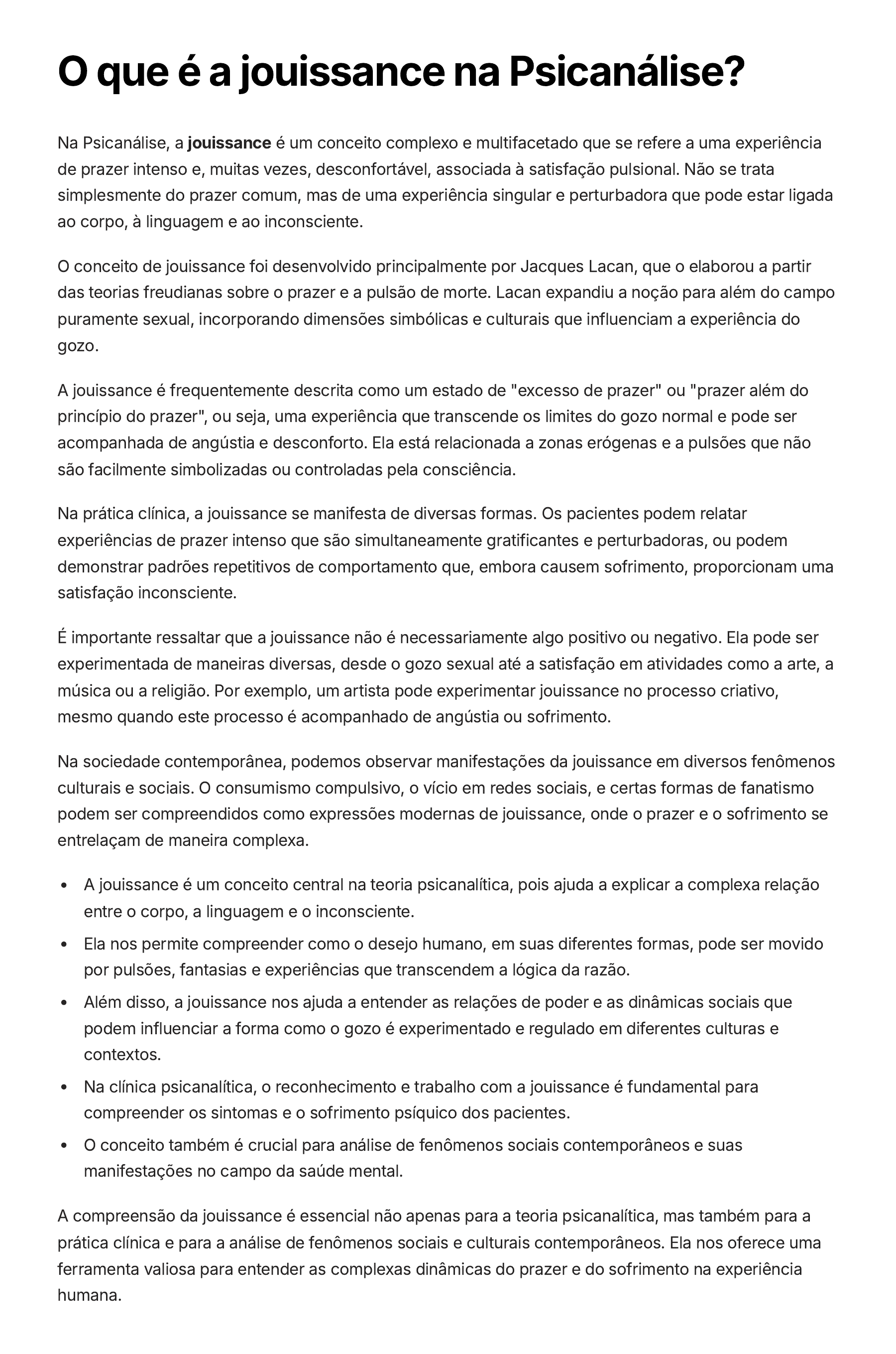 O que é a jouissance na Psicanálise? Na Psicanálise, a jouissance é um conceito complexo e multifacetado que se refere a uma experiência de prazer intenso e, muitas vezes, desconfortável, associada à satisfação pulsional. Não se trata simplesmente do prazer comum, mas de uma experiência singular e perturbadora que pode estar ligada ao corpo, à linguagem e ao inconsciente. O conceito de jouissance foi desenvolvido principalmente por Jacques Lacan, que o elaborou a partir das teorias freudianas sobre o prazer e a pulsão de morte. Lacan expandiu a noção para além do campo puramente sexual, incorporando dimensões simbólicas e culturais que influenciam a experiência do gozo. A jouissance é frequentemente descrita como um estado de "excesso de prazer" ou "prazer além do princípio do prazer", ou seja, uma experiência que transcende os limites do gozo normal e pode ser acompanhada de angústia e desconforto. Ela está relacionada a zonas erógenas e a pulsões que não são facilmente simbolizadas ou controladas pela consciência. Na prática clínica, a jouissance se manifesta de diversas formas. Os pacientes podem relatar experiências de prazer intenso que são simultaneamente gratificantes e perturbadoras, ou podem demonstrar padrões repetitivos de comportamento que, embora causem sofrimento, proporcionam uma satisfação inconsciente. É importante ressaltar que a jouissance não é necessariamente algo positivo ou negativo. Ela pode ser experimentada de maneiras diversas, desde o gozo sexual até a satisfação em atividades como a arte, a música ou a religião. Por exemplo, um artista pode experimentar jouissance no processo criativo, mesmo quando este processo é acompanhado de angústia ou sofrimento. Na sociedade contemporânea, podemos observar manifestações da jouissance em diversos fenômenos culturais e sociais. O consumismo compulsivo, o vício em redes sociais, e certas formas de fanatismo podem ser compreendidos como expressões modernas de jouissance, onde o prazer e o sofrimento se entrelaçam de maneira complexa. A jouissance é um conceito central na teoria psicanalítica, pois ajuda a explicar a complexa relação entre o corpo, a linguagem e o inconsciente. Ela nos permite compreender como o desejo humano, em suas diferentes formas, pode ser movido por pulsões, fantasias e experiências que transcendem a lógica da razão. Além disso, a jouissance nos ajuda a entender as relações de poder e as dinâmicas sociais que podem influenciar a forma como o gozo é experimentado e regulado em diferentes culturas e contextos. Na clínica psicanalítica, o reconhecimento e trabalho com a jouissance é fundamental para compreender os sintomas e o sofrimento psíquico dos pacientes. O conceito também é crucial para análise de fenômenos sociais contemporâneos e suas manifestações no campo da saúde mental. A compreensão da jouissance é essencial não apenas para a teoria psicanalítica, mas também para a prática clínica e para a análise de fenômenos sociais e culturais contemporâneos. Ela nos oferece uma ferramenta valiosa para entender as complexas dinâmicas do prazer e do sofrimento na experiência humana.