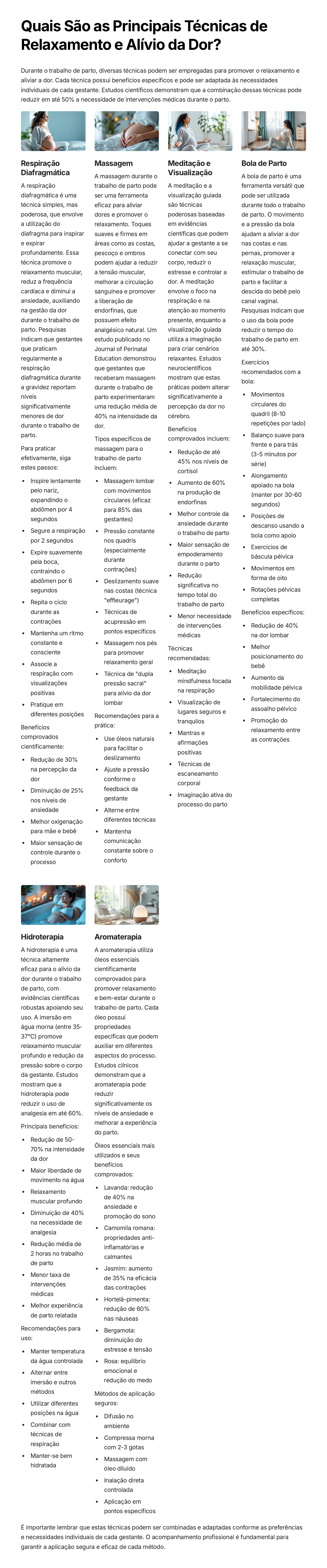 Quais São as Principais Técnicas de Relaxamento e Alívio da Dor? Durante o trabalho de parto, diversas técnicas podem ser empregadas para promover o relaxamento e aliviar a dor. Cada técnica possui benefícios específicos e pode ser adaptada às necessidades individuais de cada gestante. Estudos científicos demonstram que a combinação dessas técnicas pode reduzir em até 50% a necessidade de intervenções médicas durante o parto. Respiração Diafragmática A respiração diafragmática é uma técnica simples, mas poderosa, que envolve a utilização do diafragma para inspirar e expirar profundamente. Essa técnica promove o relaxamento muscular, reduz a frequência cardíaca e diminui a ansiedade, auxiliando na gestão da dor durante o trabalho de parto. Pesquisas indicam que gestantes que praticam regularmente a respiração diafragmática durante a gravidez reportam níveis significativamente menores de dor durante o trabalho de parto. Para praticar efetivamente, siga estes passos: Inspire lentamente pelo nariz, expandindo o abdômen por 4 segundos Segure a respiração por 2 segundos Expire suavemente pela boca, contraindo o abdômen por 6 segundos Repita o ciclo durante as contrações Mantenha um ritmo constante e consciente Associe a respiração com visualizações positivas Pratique em diferentes posições Benefícios comprovados cientificamente: Redução de 30% na percepção da dor Diminuição de 25% nos níveis de ansiedade Melhor oxigenação para mãe e bebê Maior sensação de controle durante o processo Massagem A massagem durante o trabalho de parto pode ser uma ferramenta eficaz para aliviar dores e promover o relaxamento. Toques suaves e firmes em áreas como as costas, pescoço e ombros podem ajudar a reduzir a tensão muscular, melhorar a circulação sanguínea e promover a liberação de endorfinas, que possuem efeito analgésico natural. Um estudo publicado no Journal of Perinatal Education demonstrou que gestantes que receberam massagem durante o trabalho de parto experimentaram uma redução média de 40% na intensidade da dor. Tipos específicos de massagem para o trabalho de parto incluem: Massagem lombar com movimentos circulares (eficaz para 85% das gestantes) Pressão constante nos quadris (especialmente durante contrações) Deslizamento suave nas costas (técnica "effleurage") Técnicas de acupressão em pontos específicos Massagem nos pés para promover relaxamento geral Técnica de "dupla pressão sacral" para alívio da dor lombar Recomendações para a prática: Use óleos naturais para facilitar o deslizamento Ajuste a pressão conforme o feedback da gestante Alterne entre diferentes técnicas Mantenha comunicação constante sobre o conforto Meditação e Visualização A meditação e a visualização guiada são técnicas poderosas baseadas em evidências científicas que podem ajudar a gestante a se conectar com seu corpo, reduzir o estresse e controlar a dor. A meditação envolve o foco na respiração e na atenção ao momento presente, enquanto a visualização guiada utiliza a imaginação para criar cenários relaxantes. Estudos neurocientíficos mostram que estas práticas podem alterar significativamente a percepção da dor no cérebro. Benefícios comprovados incluem: Redução de até 45% nos níveis de cortisol Aumento de 60% na produção de endorfinas Melhor controle da ansiedade durante o trabalho de parto Maior sensação de empoderamento durante o parto Redução significativa no tempo total do trabalho de parto Menor necessidade de intervenções médicas Técnicas recomendadas: Meditação mindfulness focada na respiração Visualização de lugares seguros e tranquilos Mantras e afirmações positivas Técnicas de escaneamento corporal Imaginação ativa do processo do parto Bola de Parto A bola de parto é uma ferramenta versátil que pode ser utilizada durante todo o trabalho de parto. O movimento e a pressão da bola ajudam a aliviar a dor nas costas e nas pernas, promover a relaxação muscular, estimular o trabalho de parto e facilitar a descida do bebê pelo canal vaginal. Pesquisas indicam que o uso da bola pode reduzir o tempo do trabalho de parto em até 30%. Exercícios recomendados com a bola: Movimentos circulares do quadril (8-10 repetições por lado) Balanço suave para frente e para trás (3-5 minutos por série) Alongamento apoiado na bola (manter por 30-60 segundos) Posições de descanso usando a bola como apoio Exercícios de báscula pélvica Movimentos em forma de oito Rotações pélvicas completas Benefícios específicos: Redução de 40% na dor lombar Melhor posicionamento do bebê Aumento da mobilidade pélvica Fortalecimento do assoalho pélvico Promoção do relaxamento entre as contrações Hidroterapia A hidroterapia é uma técnica altamente eficaz para o alívio da dor durante o trabalho de parto, com evidências científicas robustas apoiando seu uso. A imersão em água morna (entre 35- 37°C) promove relaxamento muscular profundo e redução da pressão sobre o corpo da gestante. Estudos mostram que a hidroterapia pode reduzir o uso de analgesia em até 60%. Principais benefícios: Redução de 50- 70% na intensidade da dor Maior liberdade de movimento na água Relaxamento muscular profundo Diminuição de 40% na necessidade de analgesia Redução média de 2 horas no trabalho de parto Menor taxa de intervenções médicas Melhor experiência de parto relatada Recomendações para uso: Manter temperatura da água controlada Alternar entre imersão e outros métodos Utilizar diferentes posições na água Combinar com técnicas de respiração Manter-se bem hidratada Aromaterapia A aromaterapia utiliza óleos essenciais cientificamente comprovados para promover relaxamento e bem-estar durante o trabalho de parto. Cada óleo possui propriedades específicas que podem auxiliar em diferentes aspectos do processo. Estudos clínicos demonstram que a aromaterapia pode reduzir sign