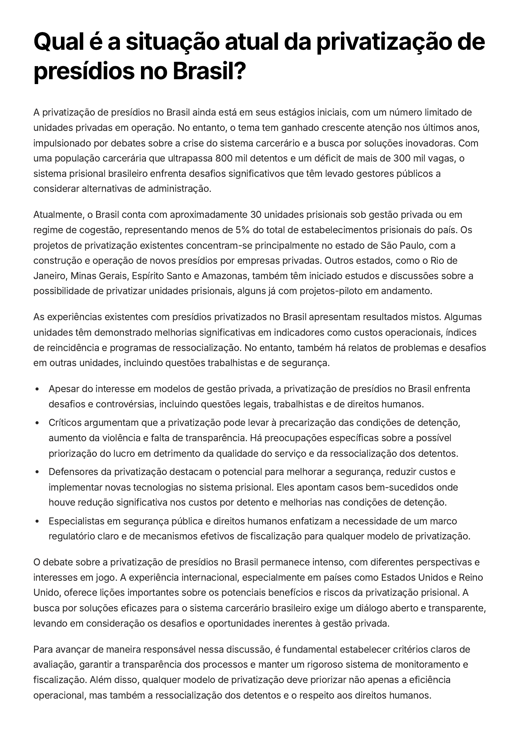 Qual é a situação atual da privatização de presídios no Brasil? A privatização de presídios no Brasil ainda está em seus estágios iniciais, com um número limitado de unidades privadas em operação. No entanto, o tema tem ganhado crescente atenção nos últimos anos, impulsionado por debates sobre a crise do sistema carcerário e a busca por soluções inovadoras. Com uma população carcerária que ultrapassa 800 mil detentos e um déficit de mais de 300 mil vagas, o sistema prisional brasileiro enfrenta desafios significativos que têm levado gestores públicos a considerar alternativas de administração. Atualmente, o Brasil conta com aproximadamente 30 unidades prisionais sob gestão privada ou em regime de cogestão, representando menos de 5% do total de estabelecimentos prisionais do país. Os projetos de privatização existentes concentram-se principalmente no estado de São Paulo, com a construção e operação de novos presídios por empresas privadas. Outros estados, como o Rio de Janeiro, Minas Gerais, Espírito Santo e Amazonas, também têm iniciado estudos e discussões sobre a possibilidade de privatizar unidades prisionais, alguns já com projetos-piloto em andamento. As experiências existentes com presídios privatizados no Brasil apresentam resultados mistos. Algumas unidades têm demonstrado melhorias significativas em indicadores como custos operacionais, índices de reincidência e programas de ressocialização. No entanto, também há relatos de problemas e desafios em outras unidades, incluindo questões trabalhistas e de segurança. Apesar do interesse em modelos de gestão privada, a privatização de presídios no Brasil enfrenta desafios e controvérsias, incluindo questões legais, trabalhistas e de direitos humanos. Críticos argumentam que a privatização pode levar à precarização das condições de detenção, aumento da violência e falta de transparência. Há preocupações específicas sobre a possível priorização do lucro em detrimento da qualidade do serviço e da ressocialização dos detentos. Defensores da privatização destacam o potencial para melhorar a segurança, reduzir custos e implementar novas tecnologias no sistema prisional. Eles apontam casos bem-sucedidos onde houve redução significativa nos custos por detento e melhorias nas condições de detenção. Especialistas em segurança pública e direitos humanos enfatizam a necessidade de um marco regulatório claro e de mecanismos efetivos de fiscalização para qualquer modelo de privatização. O debate sobre a privatização de presídios no Brasil permanece intenso, com diferentes perspectivas e interesses em jogo. A experiência internacional, especialmente em países como Estados Unidos e Reino Unido, oferece lições importantes sobre os potenciais benefícios e riscos da privatização prisional. A busca por soluções eficazes para o sistema carcerário brasileiro exige um diálogo aberto e transparente, levando em consideração os desafios e oportunidades inerentes à gestão privada. Para avançar de maneira responsável nessa discussão, é fundamental estabelecer critérios claros de avaliação, garantir a transparência dos processos e manter um rigoroso sistema de monitoramento e fiscalização. Além disso, qualquer modelo de privatização deve priorizar não apenas a eficiência operacional, mas também a ressocialização dos detentos e o respeito aos direitos humanos.