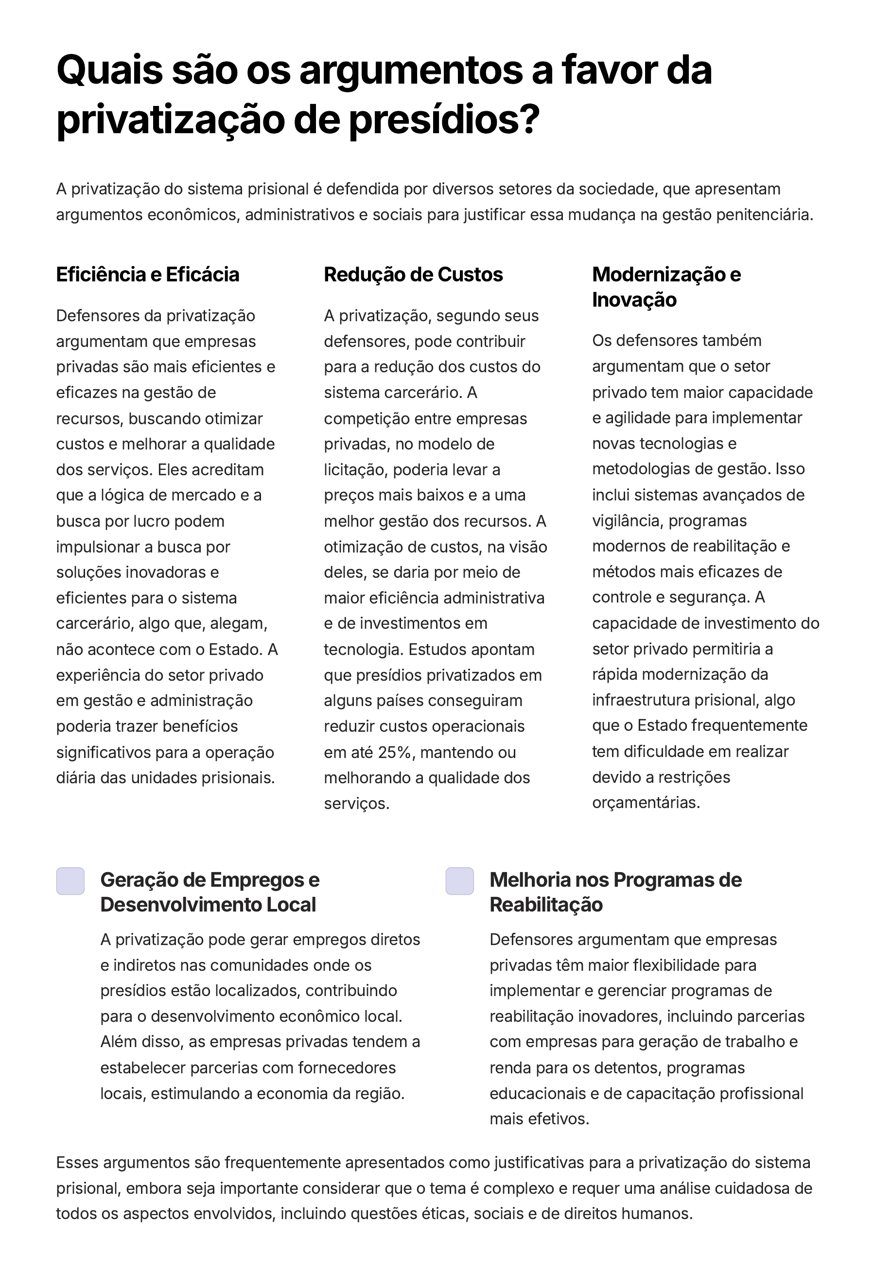 Quais são os argumentos a favor da privatização de presídios? A privatização do sistema prisional é defendida por diversos setores da sociedade, que apresentam argumentos econômicos, administrativos e sociais para justificar essa mudança na gestão penitenciária. Eficiência e Eficácia Defensores da privatização argumentam que empresas privadas são mais eficientes e eficazes na gestão de recursos, buscando otimizar custos e melhorar a qualidade dos serviços. Eles acreditam que a lógica de mercado e a busca por lucro podem impulsionar a busca por soluções inovadoras e eficientes para o sistema carcerário, algo que, alegam, não acontece com o Estado. A experiência do setor privado em gestão e administração poderia trazer benefícios significativos para a operação diária das unidades prisionais. Redução de Custos A privatização, segundo seus defensores, pode contribuir para a redução dos custos do sistema carcerário. A competição entre empresas privadas, no modelo de licitação, poderia levar a preços mais baixos e a uma melhor gestão dos recursos. A otimização de custos, na visão deles, se daria por meio de maior eficiência administrativa e de investimentos em tecnologia. Estudos apontam que presídios privatizados em alguns países conseguiram reduzir custos operacionais em até 25%, mantendo ou melhorando a qualidade dos serviços. Modernização e Inovação Os defensores também argumentam que o setor privado tem maior capacidade e agilidade para implementar novas tecnologias e metodologias de gestão. Isso inclui sistemas avançados de vigilância, programas modernos de reabilitação e métodos mais eficazes de controle e segurança. A capacidade de investimento do setor privado permitiria a rápida modernização da infraestrutura prisional, algo que o Estado frequentemente tem dificuldade em realizar devido a restrições orçamentárias. Geração de Empregos e Desenvolvimento Local A privatização pode gerar empregos diretos e indiretos nas comunidades onde os presídios estão localizados, contribuindo para o desenvolvimento econômico local. Além disso, as empresas privadas tendem a estabelecer parcerias com fornecedores locais, estimulando a economia da região. Melhoria nos Programas de Reabilitação Defensores argumentam que empresas privadas têm maior flexibilidade para implementar e gerenciar programas de reabilitação inovadores, incluindo parcerias com empresas para geração de trabalho e renda para os detentos, programas educacionais e de capacitação profissional mais efetivos. Esses argumentos são frequentemente apresentados como justificativas para a privatização do sistema prisional, embora seja importante considerar que o tema é complexo e requer uma análise cuidadosa de todos os aspectos envolvidos, incluindo questões éticas, sociais e de direitos humanos.