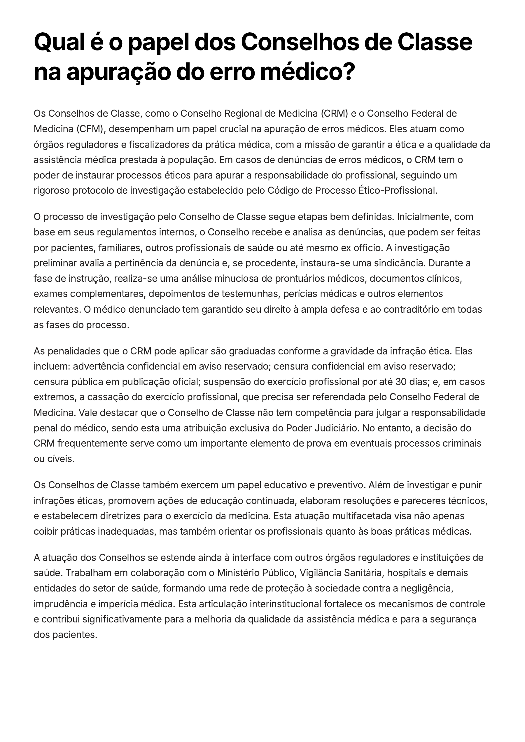 Qual é o papel dos Conselhos de Classe na apuração do erro médico? Os Conselhos de Classe, como o Conselho Regional de Medicina (CRM) e o Conselho Federal de Medicina (CFM), desempenham um papel crucial na apuração de erros médicos. Eles atuam como órgãos reguladores e fiscalizadores da prática médica, com a missão de garantir a ética e a qualidade da assistência médica prestada à população. Em casos de denúncias de erros médicos, o CRM tem o poder de instaurar processos éticos para apurar a responsabilidade do profissional, seguindo um rigoroso protocolo de investigação estabelecido pelo Código de Processo Ético-Profissional. O processo de investigação pelo Conselho de Classe segue etapas bem definidas. Inicialmente, com base em seus regulamentos internos, o Conselho recebe e analisa as denúncias, que podem ser feitas por pacientes, familiares, outros profissionais de saúde ou até mesmo ex officio. A investigação preliminar avalia a pertinência da denúncia e, se procedente, instaura-se uma sindicância. Durante a fase de instrução, realiza-se uma análise minuciosa de prontuários médicos, documentos clínicos, exames complementares, depoimentos de testemunhas, perícias médicas e outros elementos relevantes. O médico denunciado tem garantido seu direito à ampla defesa e ao contraditório em todas as fases do processo. As penalidades que o CRM pode aplicar são graduadas conforme a gravidade da infração ética. Elas incluem: advertência confidencial em aviso reservado; censura confidencial em aviso reservado; censura pública em publicação oficial; suspensão do exercício profissional por até 30 dias; e, em casos extremos, a cassação do exercício profissional, que precisa ser referendada pelo Conselho Federal de Medicina. Vale destacar que o Conselho de Classe não tem competência para julgar a responsabilidade penal do médico, sendo esta uma atribuição exclusiva do Poder Judiciário. No entanto, a decisão do CRM frequentemente serve como um importante elemento de prova em eventuais processos criminais ou cíveis. Os Conselhos de Classe também exercem um papel educativo e preventivo. Além de investigar e punir infrações éticas, promovem ações de educação continuada, elaboram resoluções e pareceres técnicos, e estabelecem diretrizes para o exercício da medicina. Esta atuação multifacetada visa não apenas coibir práticas inadequadas, mas também orientar os profissionais quanto às boas práticas médicas. A atuação dos Conselhos se estende ainda à interface com outros órgãos reguladores e instituições de saúde. Trabalham em colaboração com o Ministério Público, Vigilância Sanitária, hospitais e demais entidades do setor de saúde, formando uma rede de proteção à sociedade contra a negligência, imprudência e imperícia médica. Esta articulação interinstitucional fortalece os mecanismos de controle e contribui significativamente para a melhoria da qualidade da assistência médica e para a segurança dos pacientes.